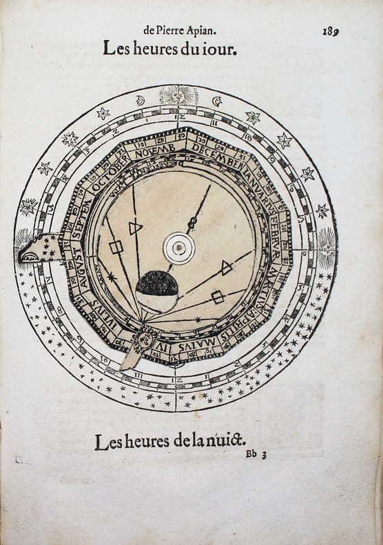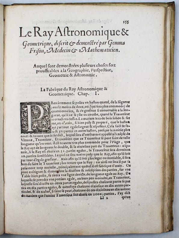 Belle édition dans la traduction et les additions de Regnier Gemma ou Gemma Frisius. Elle est illustrée par de nombreux bois gravés (globes, sphères, instruments d'astronomie et d'arpentage) et une carte du monde sur double page, d'après la carte dressée par Gemma Frisius en 1540, qui est aujourd'hui perdue. 5 gravures portent des volvelles (des parties mobiles) : 2 volvelles p. 20. Une ficelle pour pointer p. 22. 3 volvelles et une ficelle p. 26. 3 volvelles p. 66. 2 volvelles p. 189. Exemplaire complet de toutes ses parties mobiles ce qui est très rare et la carte du monde est bien présente. On trouve à la fin du texte d'Apian "L'usage de l'anneau astronomique" de Gemma Frisius et aussi, du même "L'usage du globe astronomique" et le "Ray astronomique & géométrique". Brun, Le livre illustré de la Renaissance 112. /// In-4 de (8), 333 pp., 1 f. bl. Vélin. (Reliure de l'époque.) //// Fine edition in the translation and additions of Regnier Gemma or Gemma Frisius. It is illustrated with numerous woodcuts (globes, spheres, astronomical and surveying instruments). Complete of all moving parts (10 volvelles and 2 thread pointers) and the double page world map. It is based on the larger map prepared by Gemma Frisius and published in Louvain in 1540, but which has now been lost. North America is labelled 'Baccalearium' in reference to the cod fishing nearby. 5 engravings bear volvelles (moving parts): 2 volvelles p. 20. A string for pointing on p. 22. 3 volvelles and a string on p. 26. 3 volvelles on p. 66. At the end of the Apian text is "L'usage de l'anneau astronomique" by Gemma Frisius and by the same "L'usage du globe astronomique" and "Ray astronomique & géométrique". Shirley, Mapping of the world N° 96. /// PLUS DE PHOTOS SUR WWW.LATUDE.NET