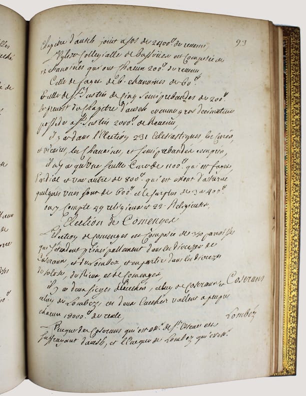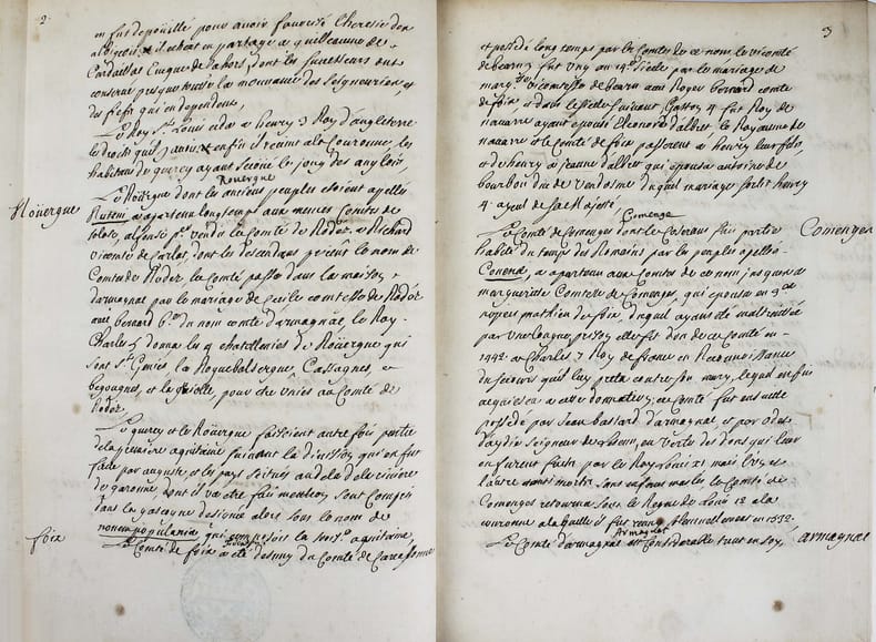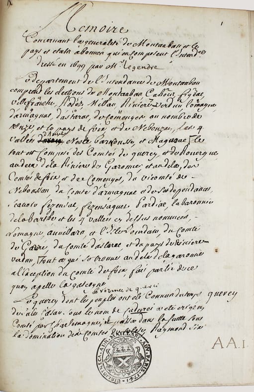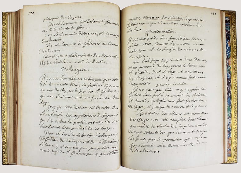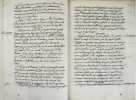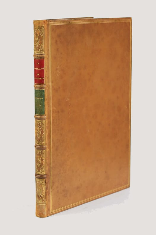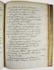 Manuscrit d'un rapport établi par Félix Le Pelletier de La Houssaye, intendant de la Généralité de Montauban - qui comprenait alors le Quercy, le Rouergue, une partie de la Gascogne, le pays de Foix - à la suite de la demande faite dans toutes les provinces de France à la fin du XVIIe siècle, par le Duc de Beauvillier, pour l'instruction de son élève le Duc de Bourgogne, petit-fils de Louis XIV. L'enquête se déroula de 1697 à 1700 et avait pour but de présenter un tableau exact du royaume. Ce mémoire a circulé sous forme manuscrite et rares sont les exemplaires qui nous sont parvenus. Cet important document fournit sur cette province à l'époque de Louis XIV un tableau des plus complets. "Le departement de l'intendance de Montauban comprend les elections de Montauban, de Cahors, de Figeac, de Villefranche, de Rodez, de Milhau, de Rivière Verdun, de Lomagne, d'Armagnac, d'Astarac, de Cominges, au nombre de unze, et les pays de Foix, de Nebouzan, les quatre vallées d'Aure, Nesle, Barnousse et Magnoac..." Un extrait d'une vingtaine de pages a été publié à Londres en 1727, dans l' "Etat de la France" de Boulainvillier. Mais "presque toutes les phrases du mémoire ont été modifiées et quelques unes sont supprimées : c'est donc un arrangement et non un extrait." (Couderc, Bibliographie historique du Rouergue I, 558.) Ce mémoire n'a été publié intégralement qu'en 2014 par Patrick Ferté : "Le Pelletier de La Houssaye, administrateur féru de comptabilité et à l'esprit méthodique, a rédigé ce Mémoire avec la volonté de se limiter à la description physique, démographique, institutionnelle et économique de la généralité." Félix Le Peletier de La Houssaye (1663 - 1723) a été aussi intendant à Soissons en 1696, puis de Hainaut en 1702, d'Alsace en 1704 et contrôleur général des finances en décembre 1720 en remplacement de John Law. Une main postérieure a attribué ce mémoire à Legendre, ce qui est une erreur celui-ci ayant été intendant à la suite de La Houssaye. Bel exemplaire. Provenances : - Denis-François Secousse (ex-libris armorié), avocat et historien dont la bibliothèque fut vendue en 1712. - Adrien Maillart (cachet armorié sur la première page) avocat au Parlement de Paris et savant jurisconsulte, sa bibliothèque fut vendue en 1743. /// In-4 de 160 pp. Veau brun glacé, dos à nerfs orné, encadrements dorés sur les plats, tranches dorées. (Reliure du XIXe, Bouquet.) ////