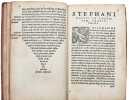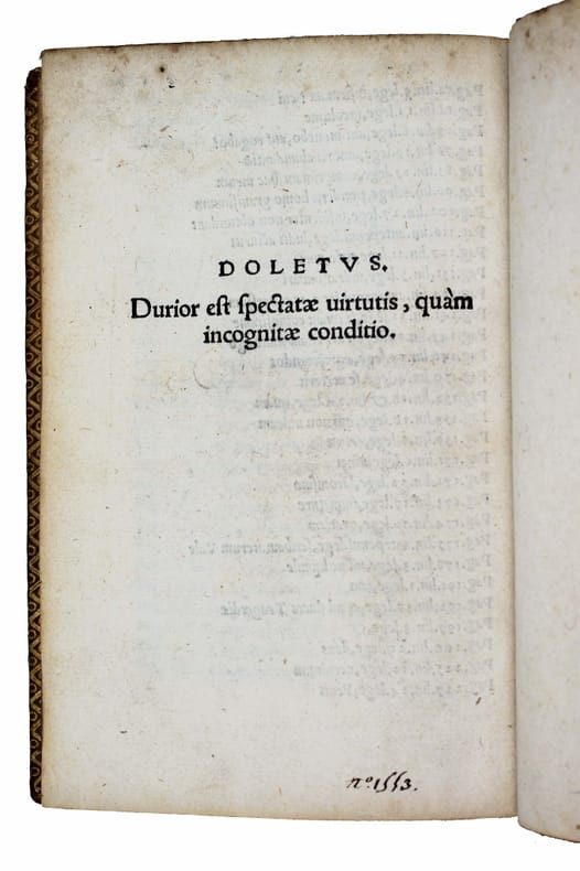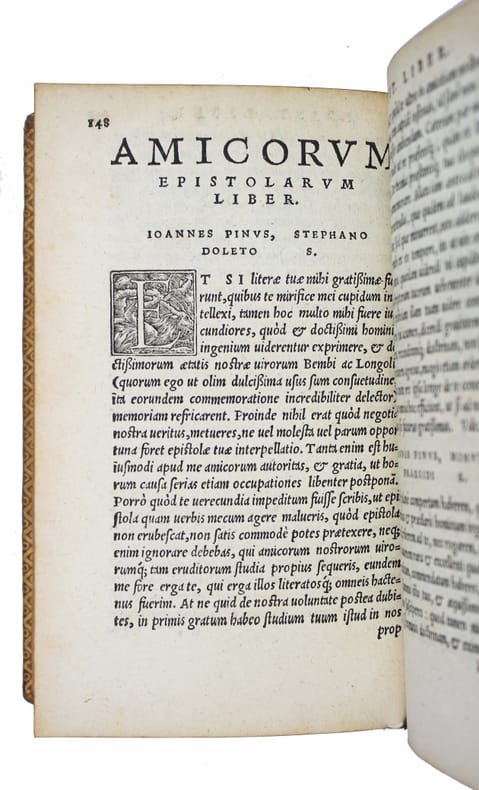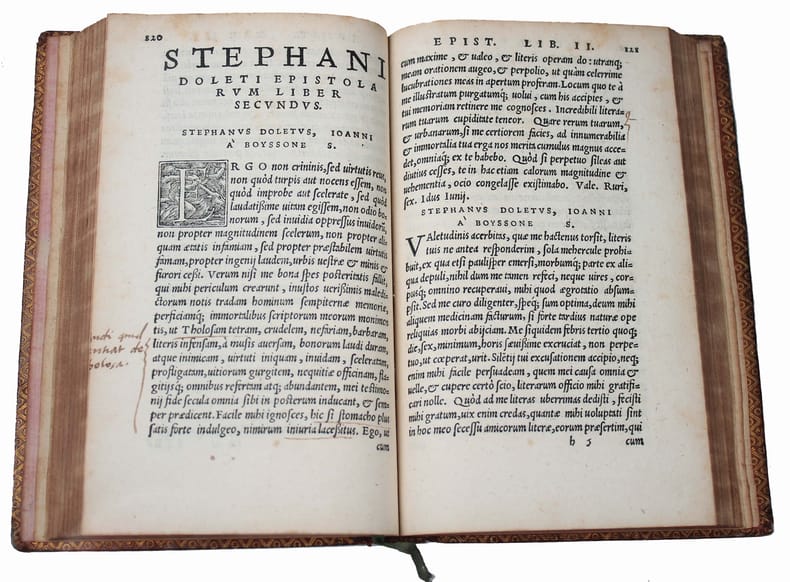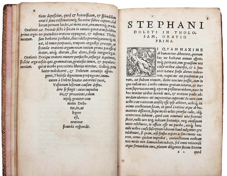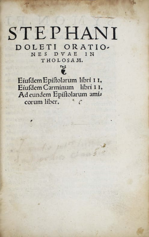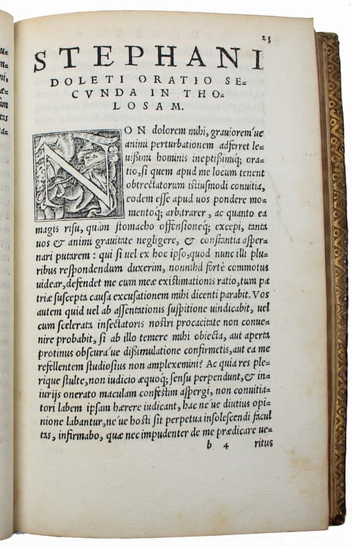 Première édition. C'est le premier livre publié par Etienne Dolet. Né à Orléans en 1509 et mort sur le bûcher à Paris en 1546, il ne séjourna à Toulouse que deux ans. Il y étudia le droit et fut élu en 1533 orateur de la 'nation française'. Ce sont les discours qu'il y prononça s'en prenant avec violence aux Capitouls, tyranniques et barbares. Il dénonce les superstitions qui à Toulouse dénaturent la religion, défend la liberté d'association, fait sa propre apologie et se pose en défenseur de l'humanisme contre la barbarie des Toulousains. Dolet fut même arrêté quelques temps par la Sénéchaussée. "Le recueil ici présenté, composé par Dolet à son arrivée à Lyon en 1534, rassemble l'ensemble des pièces qu'il a voulu verser au dossier de son affaire toulousaine, lettres écrites de Toulouse puis de Lyon, poèmes adressés à G. Budé, à Marguerite de Navarre, à Jean de Pins, à Jean de Langeac, à Boyssoné ou à Guillaume Scève : autant d'illustrations en prose et en vers ... de ses talents d'écrivain et de ses convictions d'humaniste." L'humanisme à Toulouse N° 39. "Malgré les affirmations passées, il est vraisemblable que Gryphe ne soit pas limprimeur de cette édition". (Base de données bibliographique sur Étienne Dolet, ENSSIB). Longeon, Bibliographie des oeuvres d'Etienne Dolet N°1. Baudrier 8, 38. Provenance : une cote de bibliothèque sur le dernier feuillet "n° 1553" datant de l'époque de la reliure. /// In-8 de (8), 246, (2) pp. Veau brun glacé, dos orné, encadrements sur les plats, tranches dorées. (Reliure du XVIIIe.) //// First edition. This is the famous humanist's first published work, written whilst living at Toulouse where he was studying law. Etienne Dolé afterwards became a printer and produced works savouring of heresy, in consequence of which he was ultimately charged with atheism and was strangled and burnt in 1547. This volume supplies much curious detail of the author's life at Toulouse, of the quarrels in which he was involved, &c. Despite past assertions, it is likely that Gryphe was not the printer of this edition. Fairfax Murray 131. Longeon, Bibliographie des oeuvres d'Etienne Dolet N°1. Baudrier 8, 38. Provenance: a library mark on the last leaf n° 1553 dating from the time of binding.
