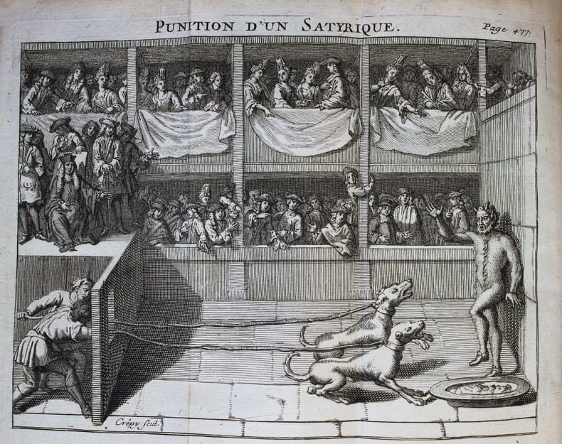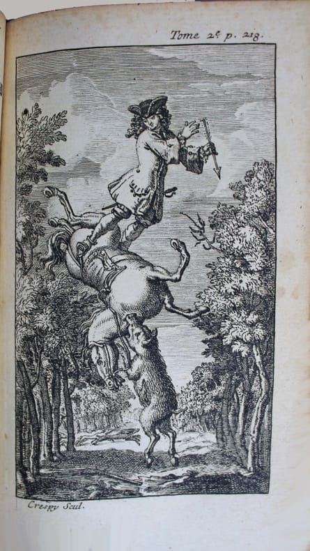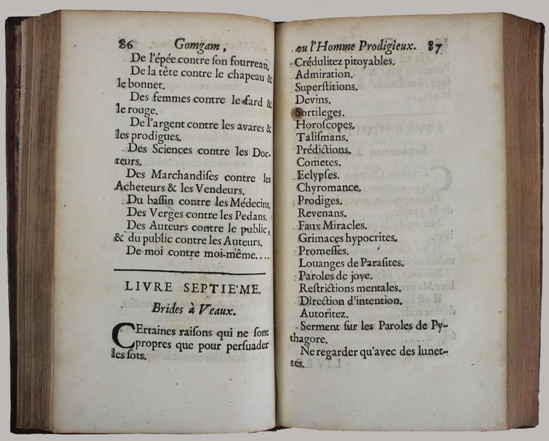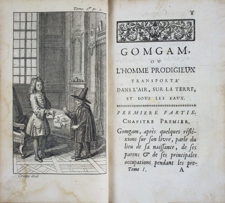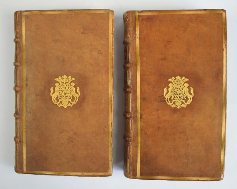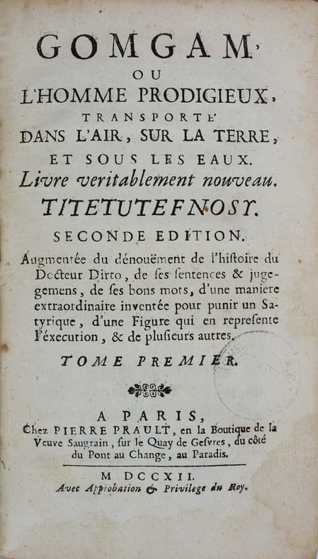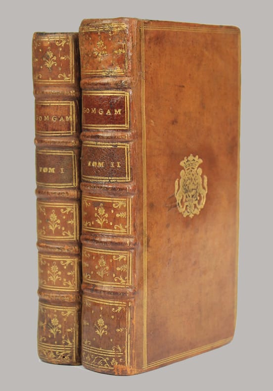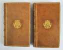 Illustré par 9 planches gravées hors-texte. Laurent Bordelon (1653-1730) était romancier, dramaturge, journaliste, utopiste, précepteur... et docteur en théologie (!) Il publia une quarantaine d'ouvrages, la plupart sont des romans ou des pièces satyriques. Dans celui-ci, Gomgam peut se transporter dans les airs en tenant une flèche d'or. Cela lui donne "beaucoup de facilités pour détruire bien des mensonges". On y trouve le projet d'un grand ouvrage de 100 volumes que Gomgam avait entrepris de faire, intitulé : "Le monde risible ou bibliothèque comique", le premier volume étant "L'agenda de ceux qui n'ont rien à faire". "Seconde édition, augmentée du dénouement de l'histoire du docteur Dirto, de ses sentences & jugemens, de ses bons mots, d'une manière extraordinaire inventée pour punir un satyrique, d'une figure qui en représente l'exécution, & de plusieurs autres". Bordelon "s'étant repenti quelques années avant sa mort, arrivée en 1730, de toutes les frivolités quil avait écrites, il fit tout ce quil put pour en ôter le souvenir ; ce qui est cause quon a si peu de ses ouvrages, qui sont tous en prose, & d'un style comique, & même bas." (Dictionnaire portatif historique et littéraire des théâtres, 1763). Provenance : Armes dorées sur les plats de Joseph de Bourguignon-Bussiere, marquis de la Mure (Marseille, 1722 -1789), aide de camp du maréchal de Richelieu au siège de Port Mahon, puis officier dans les gardes du corps de Stanislas, roi de Pologne, et grand collectionneur de dessins et de livres. Un cachet effacé sur les titres. Petites restaurations à la reliure. Bon exemplaire. Caillet, Manuel bibliographique des sciences psychiques ou occultes 1422. /// 2 volumes in-12 de (50), 343, (4) pp. / (8), 488 pp., 9 planches h.-t. Veau glacé, dos à nerfs orné, encadrements sur les plats avec armes au centre. (Reliure de l'époque.) //// Illustrated with 9 engraved plates out of text. Laurent Bordelon (1653-1730) was a novelist, playwright, journalist, utopian, tutor... and doctor of theology (!) He published some forty works, most of them novels or satirical plays. In this one, Gomgam can transport himself through the air by holding a golden arrow. This gives him great facility in destroying many lies. There's a project for a large 100-volume book that Gomgam had undertaken to make, entitled Le monde risible ou bibliothèque comique, the first volume being L'agenda de ceux qui n'ont rien à faire. Seconde édition, augmentée du dénouement de l'histoire du docteur Dirto, de ses sentences & jugemens, de ses bons mots, d'une maniere extraordinaire inventée pour punir un satyrique, d'une figure qui represente l'éxécution, & de plusieurs autres. Bordelon having repented a few years before his death, which occurred in 1730, of all the frivolities he had written, he did everything he could to remove the memory of them; which is why we have so few of his works, which are all in prose, & of a comic style, & even low. (Dictionnaire portatif historique et littéraire des théatres, 1763). Provenance: Gilded arms on boards of Joseph de Bourguignon-Bussiere, Marquis de la Mure (Marseille, 1722 -1789), aide-de-camp to Marshal de Richelieu at the siege of Port Mahon, then officer in the bodyguard of Stanislas, King of Poland, and a great collector of drawings and books. A faded stamp on the titles. Minor restorations to binding. A good copy.