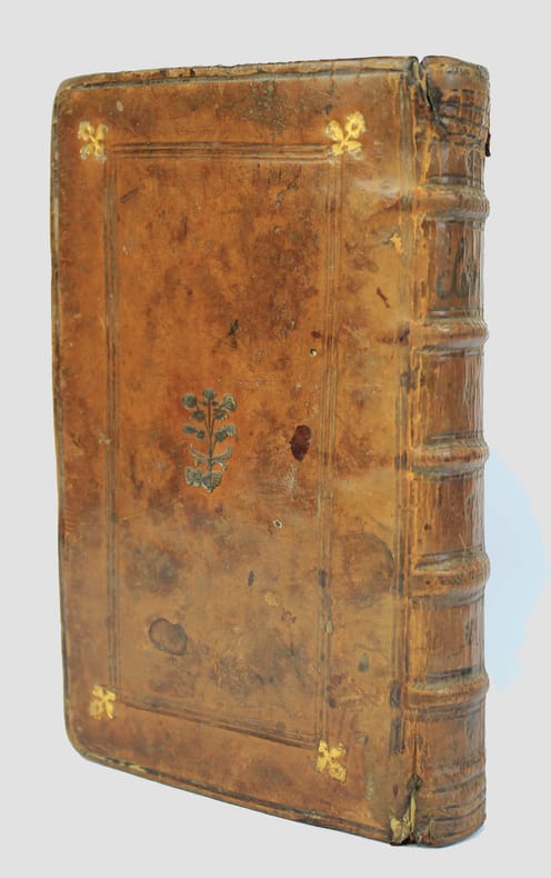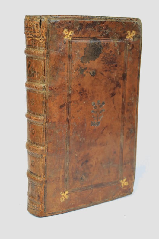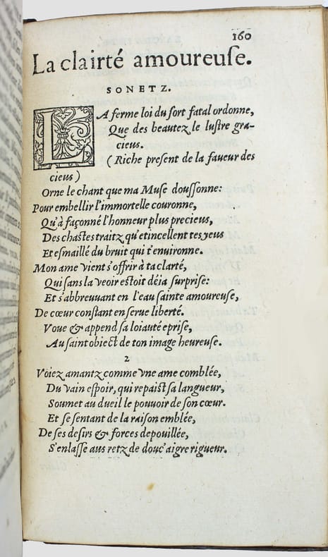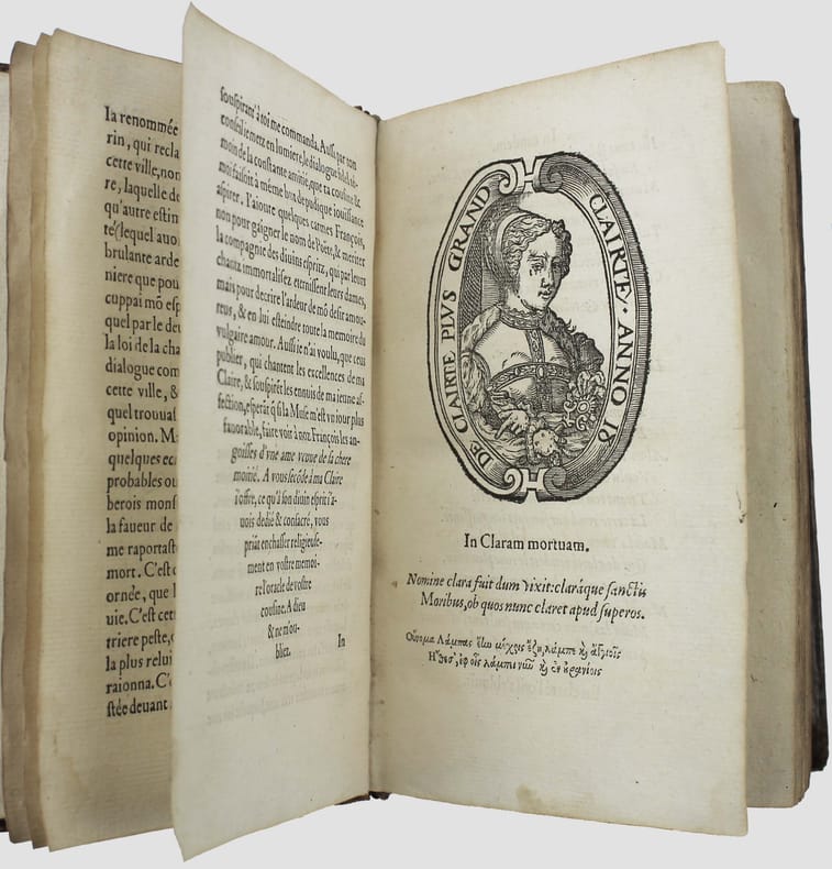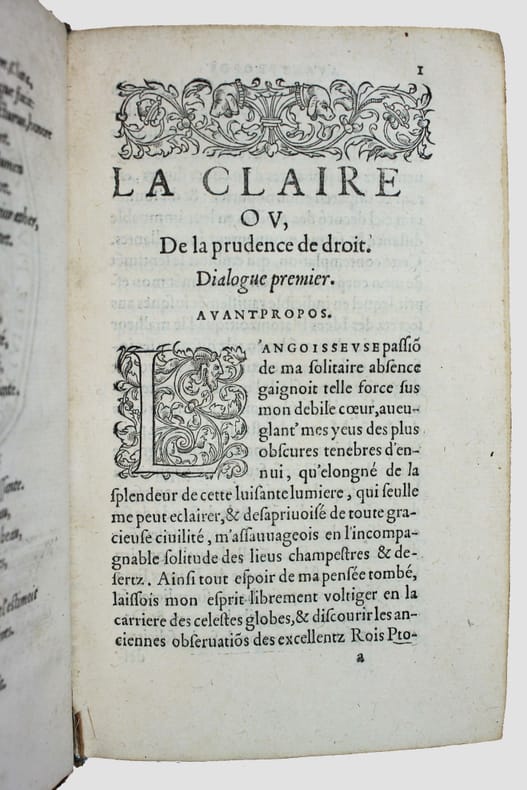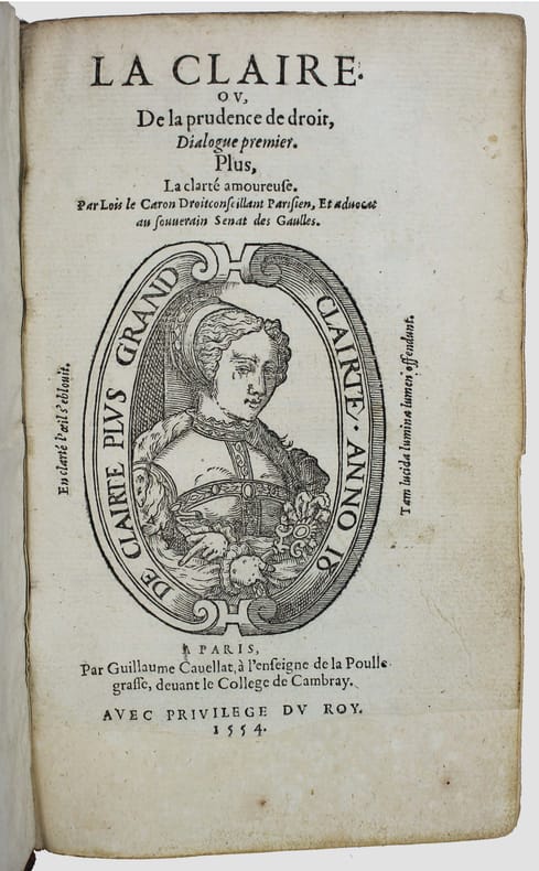 Edition originale. Il s'agit ici de la première oeuvre littéraire de Louis Le Caron (1534-1613), qui avait alors 19 ou 20 ans. C'est un monument dressé à son amour pour une certaine Claire, qui a été emportée par la peste, comme nous l'apprend une épître à la "très excellente et très vertueuse damoiselle cousine de Claire." La première partie est un dialogue entre l'auteur et Claire sur le droit et ses préceptes fondamentaux. Le Caron était alors étudiant à Bourges. Une suite de sonets sur l'amour, "La clairté amoureuse", occupe toute la fin du volume à partir du feuillet 160. On y trouve une ode "Au seigneur de Ronsard, prince des poètes français" et une "Elégie de l'amour désespéré." Avocat, juriconsulte et donc poète, Le Caron est l'auteur d'une très estimée Coutume de Paris. Le Caron publiera la même année un recueil "La poésie de Louis Le Caron" où l'on retrouve une bonne partie de ces vers, qu'il a remanié pour cette occasion. Portrait gravé sur bois de Claire sur le titre et sur le 8e feuillet. La pagination passe de 192 à 185 dans la seconde partie. La marge inférieure du titre a été refaite, de petits défauts à la reliure. Bel exemplaire dans sa première reliure. Livre rare : le Ccfr recense des exemplaires seulement à la BNF, la bibliothèque Mazarine (au nom de Gilles Corrozet) et à la BM de Toulouse (incomplet de la fin). Renouard, Imprimeurs & libraires parisiens, Marnef & Cavellat N° 71. /// In-8 de (16), 199 [noté 191], (1) ff. Veau brun, dos à nerfs orné, encadrements à froid sur les plats, un fleuron au centre et fleurons dorés aux angles. (Reliure de l'époque.) //// First edition. This is the first literary work of Louis Le Caron (1534-1613), who was then 19 or 20 years old. It is a monument to his love for a young lady named Claire, who was ravished by the plague, as we learn from an epistle. The first part is a dialogue between the author and Claire on the law and its fundamental precepts. Le Caron was then a student in Bourges. A series of poems on love, "La clairté amoureuse", occupies the entire end of the volume from folio 160 onwards. A lawyer, juriconsult and therefore a poet, Le Caron is the author of a highly regarded Coutume de Paris. WorldCat : Harvard, the others copies are apparently microforms.