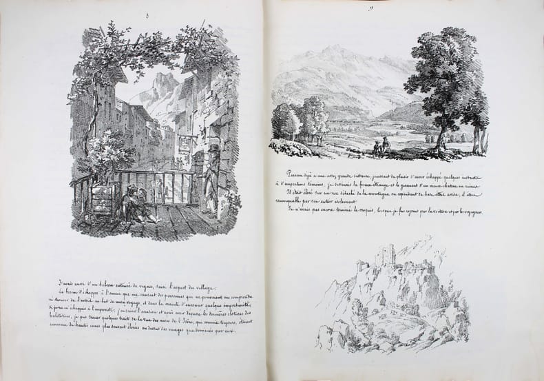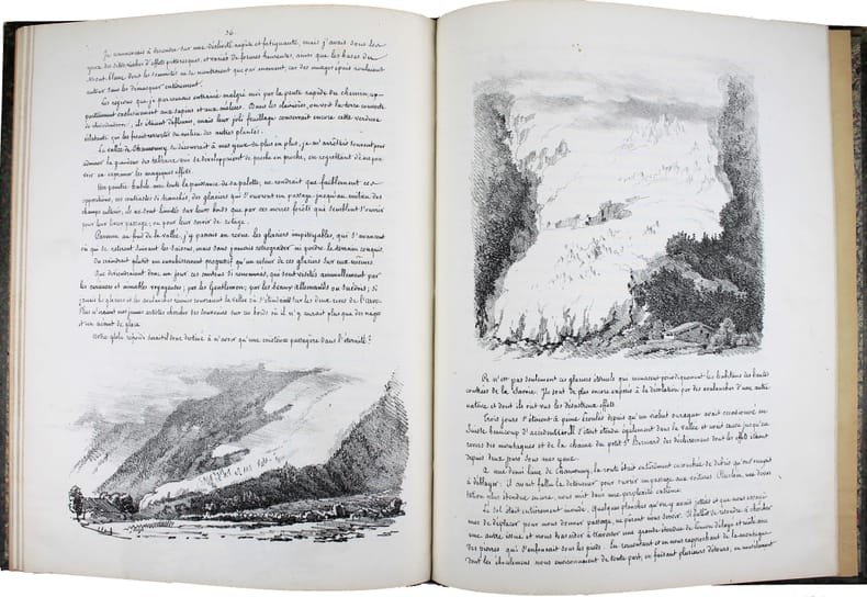 Seule édition. Ouvrage entièrement lithographié, illustré de 32 vues dans le texte. C'est le récit d'un voyage en Savoie et dans la vallée de Chamonix de Louis-Pierre Baltard, architecte, mais qui était fort connu en son temps comme graveur. Il a notamment gravé des planches pour le "Voyage dans la Basse et Haute-Égypte" de Vivant-Denon et le "Voyage en Espagne" de Laborde. Perret, Guide des livres sur la montagne et l'alpinisme 246 : "Bel album, rare et recherché". Perret, Regards sur les Alpes 36-b. /// In-4 de (4), 45 pp. Demi-basane verte. (Reliure de la fin du XIXe.) //// Only edition. Entirely lithographed, illustrated with 32 views in the text. This is the account of a trip to Savoy and the Chamonix valley by Louis-Pierre Baltard, an architect who was also well known in his day as an engraver. He notably engraved plates for Vivant-Denon's Voyage dans la Basse et Haute-Égypte and Laborde's Voyage en Espagne.
