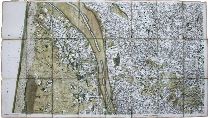 Carte entoilée et coloriée à l'époque, Blaye et l'estuaire de la Gironde. De la côte du Médoc à Monheu et Montguyon. Première carte de la France a utiliser les triangulations géodésiques, la carte de Cassini ne sera remplacée qu'à partir de 1866, par la carte d'Etat-Major à usage militaire. D'une grande précision, cette carte est une source incontournable sur la France du XVIIIe. Le travail géodésique débuta en 1756 et s'acheva en 1789. L'impression ayant prit du retard avec la Révolution ne s'acheva qu'en 1815. Bel exemplaire. /// In-plano, [59 x 104 cm] de ////
