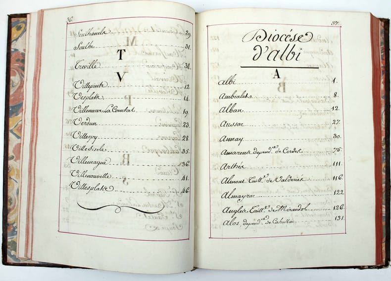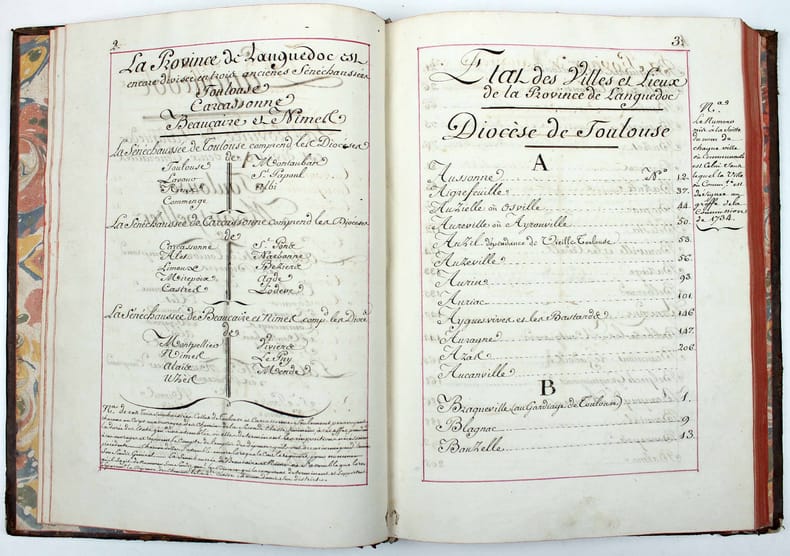 Joli manuscrit très proprement calligraphié. C'est un inventaire des 3445 villages du Languedoc, classés par sénéchaussée, puis par diocèse. Titre dans un médaillon à l'encre rouge, toutes les pages sont encadrées de rouge. La BM de Toulouse possède un manuscrit semblable, provenant de Mgr Dillon Archevêque de Narbonne, daté de 1785. Reliure frottée avec quelques petits manques. /// In-4 de titre, 242, (6) pp. Basane marbrée, dos à nerfs orné, encadrements dorés sur les plats, tranches rouges. (Reliure de l'époque.) //// /// PLUS DE PHOTOS SUR WWW.LATUDE.NET