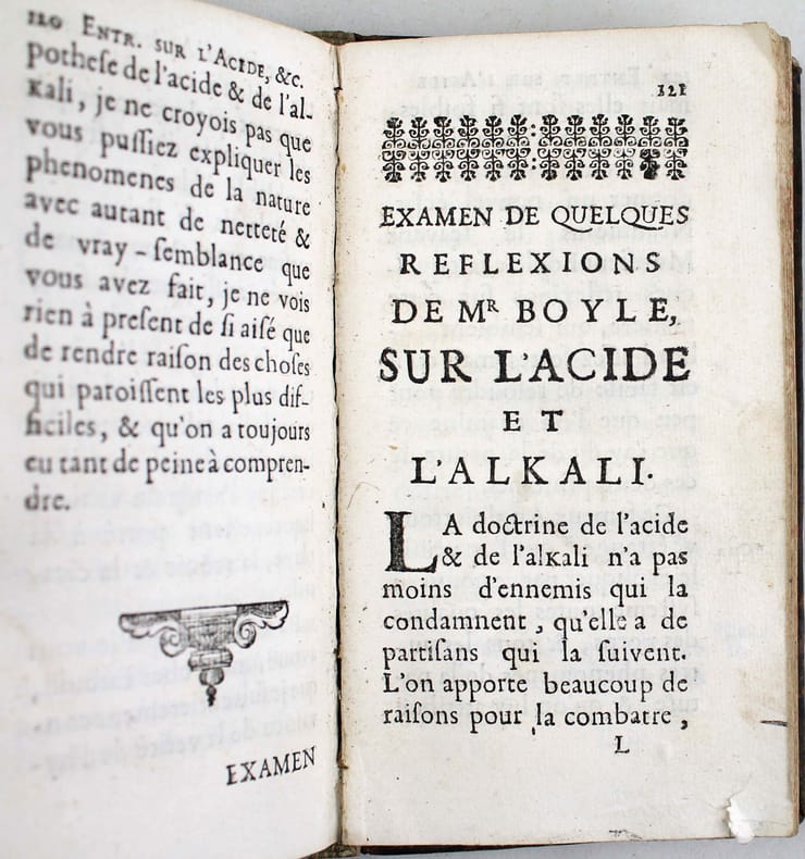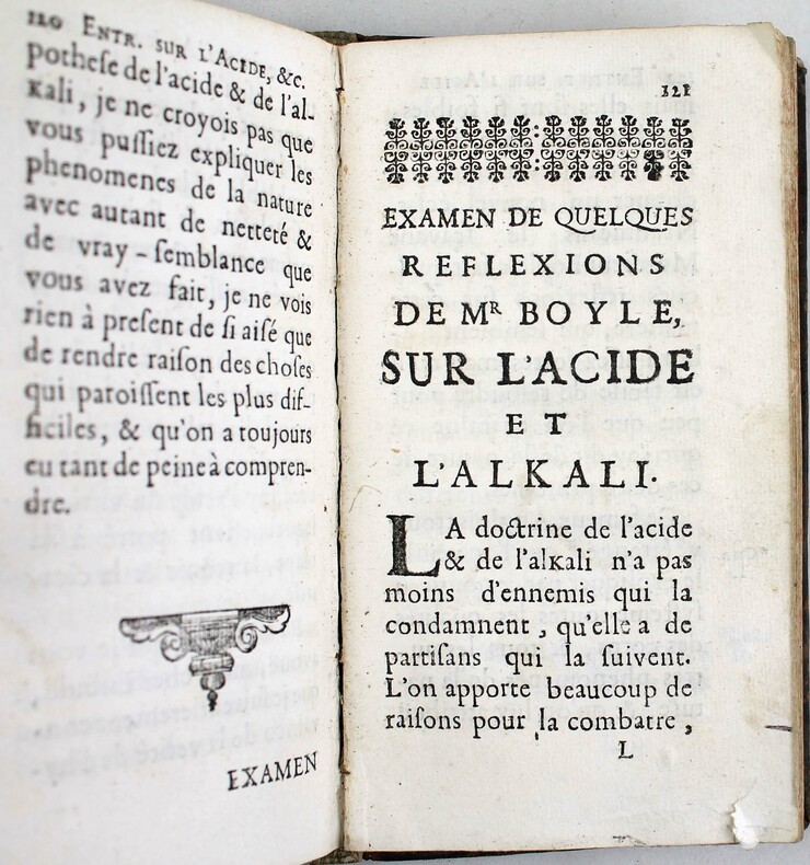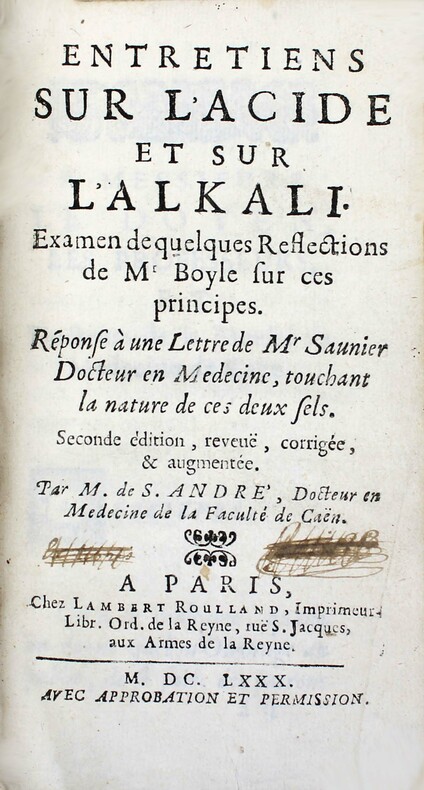 François de Saint-André, médecin à Caen, écrit ici une réfutation des 'Reflections upon the Hypothesis of Alcali and Acidum" de Robert Boyle (1675) et ré-affirme la doctrine "acide-alcali". Seconde édition, "revue, corrigée, & augmentée", la première en 1677. Reliure frottée. /// In-12 de (12), 189 pp. Veau brun, dos à nerfs orné, tranches marbrées. (Reliure de l'époque.) //// François de Saint-André, physician in Caen, writes here a refutation of Robert Boyle's 'Reflections upon the Hypothesis of Alcali and Acidum' (1675) and reaffirms the "acid-alkali" doctrine. Second edition, "revised, corrected, & enlarged", the first in 1677. Binding rubbed.
