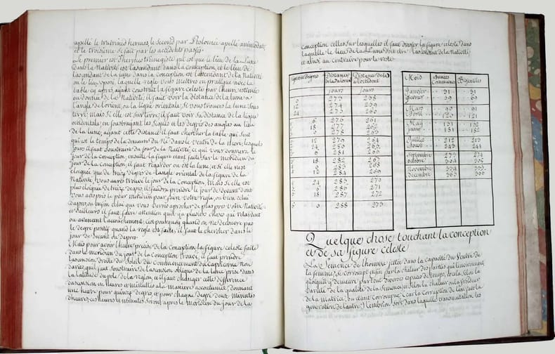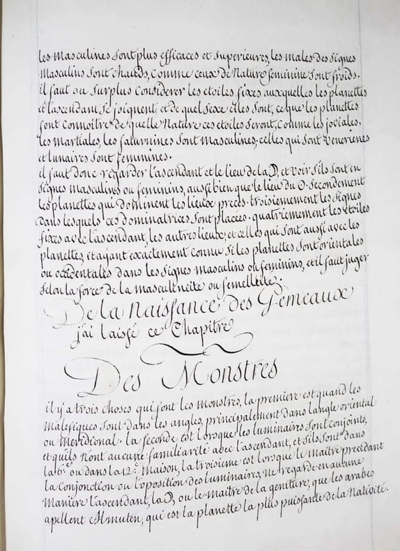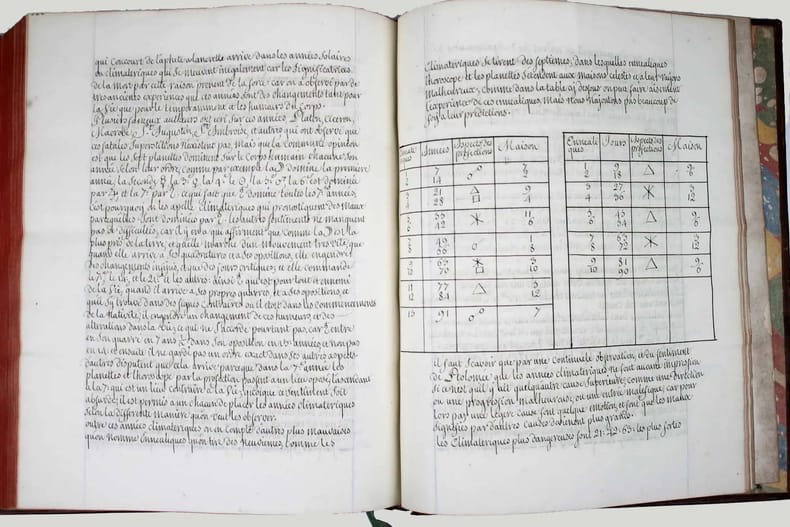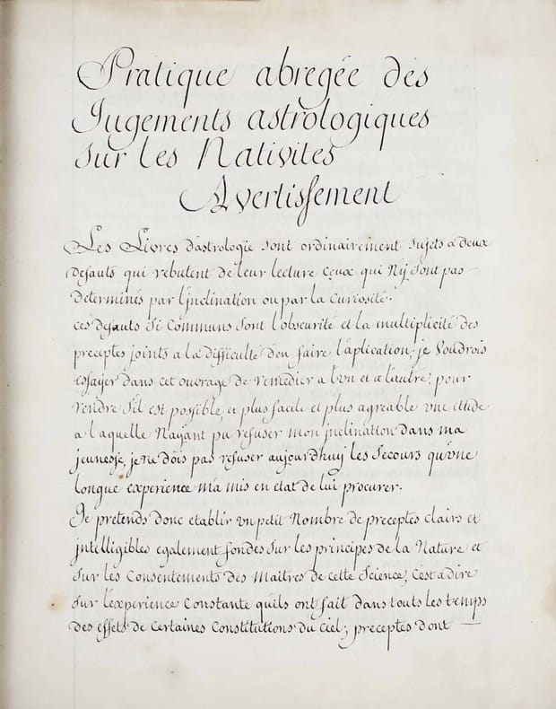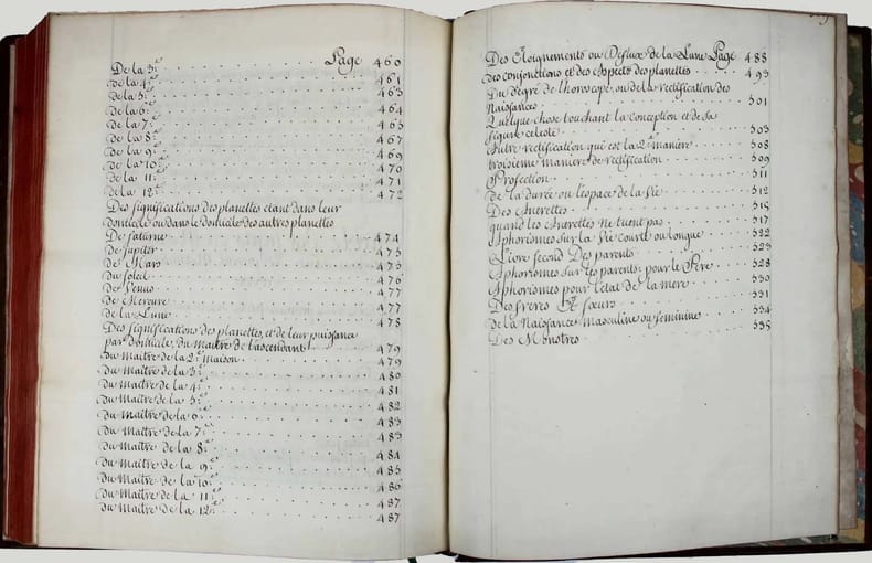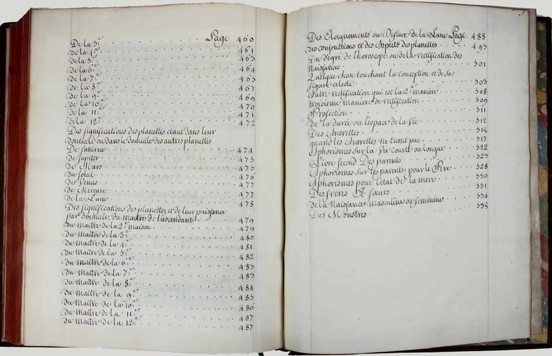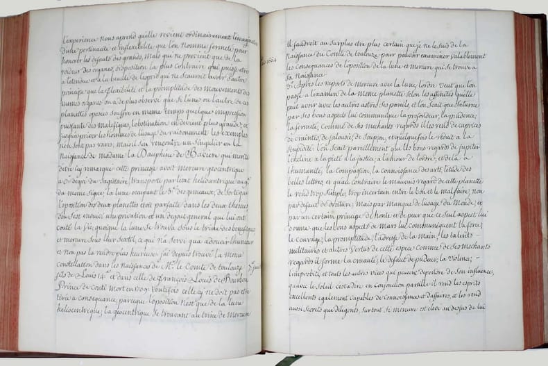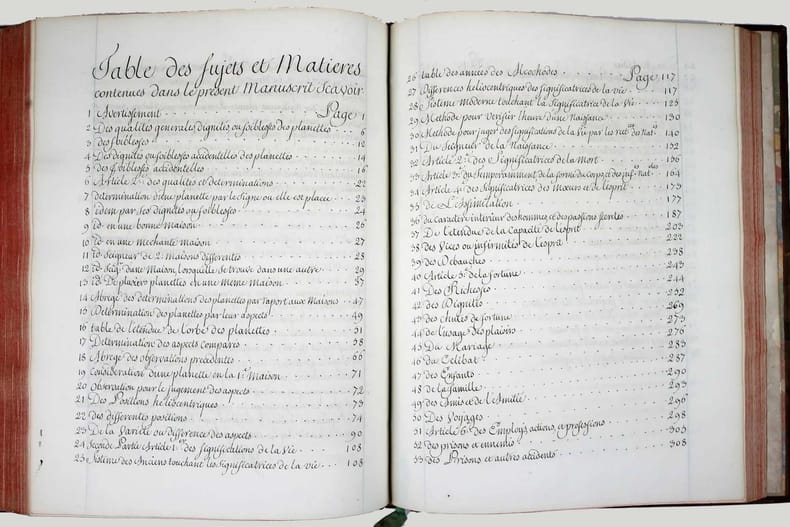Manuscrit d'une belle écriture ronde, très lisible, d'évidence de la main d'un copiste professionnel du XVIIIe siècle. Henri de Boulainvilliers, qui a compulsé plus de deux cents ouvrages pour rédiger son traité, a repris le titre et l'ordre du manuel d'astrologie d'Auger Ferrier de 1550, tout en tenant compte de la nouvelle place assignée au soleil, au centre des planètes. Le manuscrit s'achève par une traduction partielle du " Petit Ptolomée, par Argole", probablement le "Ptolomaeus parvus in genethliacis junctus Arabibus", d'Andea Argoli (1652). Le Comte de Boulainvilliers (1658-1722) a laissé une quantité de manuscrits, car il ne se souciait que fort peu de faire publier ses ouvrages; il en laissait volontiers ses amis en prendre copie. Il est célèbre pour ses recherches historiques, qui le conduisirent à déclarer que le système féodal est le chef-d'oeuvre de l'esprit humain. On lui attribue aussi des textes athéistes et anti-religieux. Celui-ci, sur l'astrologie, écrit en 1717, a circulé sous forme de manuscrit pendant plus de deux siècles. Il n'a été publié qu'en 1947 ! Il semble ne subsister de ce manuscrit que trois exemplaires dans les bibliothèques publiques (2 à la BN et un à la BM d'Angoulème). Charnières fendillées, manque à la coiffe supérieure. Bon exemplaire, très frais intérieurement. /// In-4 de (540) pp. Veau marbré, dos à nerfs orné, pièce de titre en basane rouge, tranches rouges. (Reliure de l'époque.) //// This manuscript is written in a beautiful round handwriting, very legible, obviously by a professional copyist of the 18th century. Henri de Boulainvilliers, who consulted more than two hundred books to write his treatise, took over the title and the order of Auger Ferrier's astrology manual of 1550, while taking into account the new place assigned to the sun, at the center of the planets. The manuscript ends with a partial translation of the "Petit Ptolomée, par Argole", probably the "Ptolomaeus parvus in genethliacis junctus Arabibus", by Andea Argoli (1652). The Count de Boulainvilliers (1658-1722) left a quantity of manuscripts, because he did not care much about publishing his works; he willingly let his friends take copies. He is famous for his historical researches, which led him to declare that the feudal system is the masterpiece of the human mind. He is also credited with atheistic and anti-religious texts. This one, on astrology, written in 1717, circulated in manuscript form for over two centuries. It was only published in 1947! There seem to be only three copies of this manuscript in public libraries (2 in the BN and one in the BM of Angoulème). Hinges cracked, lack of the upper cap. A good copy, very fresh inside.