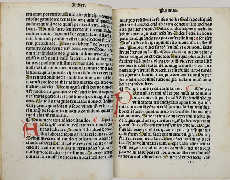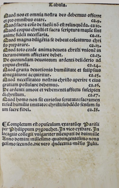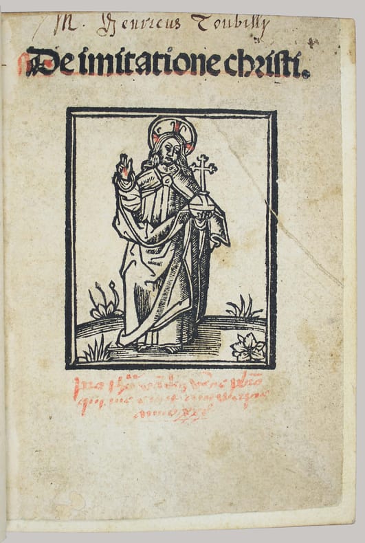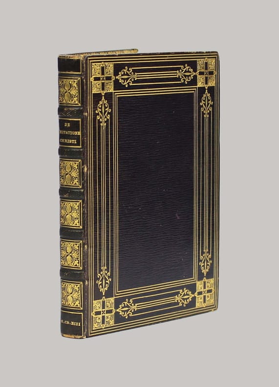 "Celui qui me suit ne marche pas dans les ténèbres". Ainsi commence le "De imitatione Christi", rédigé à la fin du XIVe siècle ou au début du XVe siècle. C'est " l'un des plus grands succès de librairie que l'Europe ait connu de la fin du Moyen Age au début de l'ère contemporaine." (Yann Sordet). Edition avec le "De meditatione cordis" de Jean Gerson. Achevé d'imprimer le 15 Juillet 1492, quelques semaines avant que Christophe Colomb ne s'embarque pour sa découverte de l'Amérique. Edition rare. Philippe Pigouchet a été un excellent imprimeur de la période incunable. Il a exercé sont art de 1488 à 1518, et imprima près de 150 livres, dont 90 éditions différentes de livres d'heures. Large initiale peinte en bleue et rouge en début de texte, toutes les initiales ont été peintes en début de chapitre. Le feuillet A1 qui porte seulement la marque de Philippe Pigouchet au recto, et dont le verso est blanc, manque ici et il a été remplacé par une page de titre avec un bois gravé d'une autre édition de l' Imitatio Christi. Bel exemplaire qu'un grand bibliophile du XIXe siècle a fait relié par Bauzonnet-Purgold vers 1820. /// In-8 gothique de (96) ff., [am8]. Maroquin violet, dos à nerfs orné, large encadrements dorés sur les plats, tranches dorées. (Reliure du XIXe.) //// "Whoever follows me will never walk in darkness" Thus begins the "De imitatione Christi", written at the end of the 14th century or the beginning of the 15th century. It is "one of the greatest successes of bookselling that Europe knew from the end of the Middle Ages to the beginning of the contemporary era." (Yann Sordet). Edition with the "De meditatione cordis" of Jean Gerson. Printed on July 15, 1492, a few weeks before Christopher Columbus embarked for his discovery of America. Rare edition. Philippe Pigouchet was an outstanding printer of the incunabula period. He practiced his art from 1488 to 1518, and printed nearly 150 books, including 90 different editions of books of hours. Large initial painted in blue and red at the beginning of the text, all initials were painted at the top of chapters. The leaf A1 which bears only the trademark of Philippe Pigouchet on the recto, and whose verso is blank, is missing here and has been substituted by a title page with a woodcut of another edition of the Imitatio Christi. A very fine copy bound by Bauzonnet-Purgold around 1820 for a great 19th century bibliophile. No copy in Great-Britain. GW M46796. ISTC ii00025000.