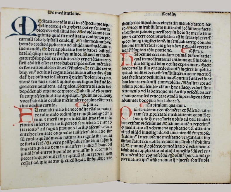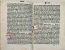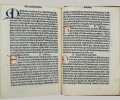 "Celui qui me suit ne marche pas dans les ténèbres". Ainsi commence le "De imitatione Christi", rédigé à la fin du XIVe siècle ou au début du XVe siècle. C'est " l'un des plus grands succès de librairie que l'Europe ait connu de la fin du Moyen Age au début de l'ère contemporaine." (Yann Sordet). Jolie édition en caractères romains, donnée par Jacobus Britannicus qui acheva d'imprimer son premier livre à Brescia le 7 Mai 1485. Celui-ci, datant du 6 Juin semble être son troisième livre. L' Imitatio Christi est attribué dans cette édition à Saint-Bernard. Grandes initiales peintes en rouge et titre de paragraphe souligné en rouge, petites initiales rehaussées en jaune. Il manque le premier feuillet A1 qui est blanc et le feuillet n2. Petite restauration feuillet m1. Colophon: Impressum Brixiæ per Jacobum Britannicum Brixianum di sexto Junii Mcccclxxxv. BMC VII974. ISTCii00009000. GW M46732. Relié à la suite : CLIMAX, Johannes. [Scala paradisi]. (Paris), Denis Roce, (vers 1505). In-8 de 158 ff. Une rare édition, classée parmi les incunables par certains bibliographes, mais que la BNF date autour de 1505. L'Echelle du paradis est un traité d'ascétisme monastique rédigé vers 600. Caractères gothiques. Initiales criblées rehaussées en jaune. Grande marque de limprimeur Denis Roce avec sa devise "A laventure tout vient à point qui peut attendre". Le livre a été imprimé par Jean Barbier, André Bocard ou Gaspard Philippe, d'après le matériel typographique. Colophon : "Finis tricesimi gradus huis celestis scale doctoris spûalis johannis scolastici abbatis montis sinay: qui ab edito libro cognominatus est Clymacus idest scalaris." Signatures: a-s8, t10. La marge supérieure du titre a été découpée sur 1 cm sans atteinte au texte. Un manque sans atteinte dans la marge du feuillet cxxxix. Brigitte Moreau I, 119. ISTC ij00311000. BMC VIII 229 (date around 1499). GW M13402. Goff J311. Une fente dans le haut et le bas de la première charnière. Les liens d'attaches manquent. Les plats de la reliure sont ornés de filets d'encadrement, avec quatre fleurons portant chacun le symbole des évangélistes. Bel exemplaire dans une très intéressante reliure. /// In-8 de (118) ff. Vélin sur ais de bois, décor estampé sur les plats, dos à trois nerfs. (Reliure de l'époque.) //// "Whoever follows me will never walk in darkness". Thus begins the "De imitatione Christi", written at the end of the 14th century or the beginning of the 15th century. It is "one of the greatest successes of bookselling that Europe knew from the end of the Middle Ages to the beginning of the contemporary era." (Yann Sordet). Nice edition in Roman type, given by Jacobus Britannicus who completed the printing of his first book in Brescia on May 7, 1485. This one, dated June 6, is apparently his third book. The Imitatio Christi is attributed in this edition to Saint Bernard. Large initials painted in red and paragraph title underlined in red, small initials highlighted in yellow. The first leaf A1 is missing, which is blank, and leaf n2. Small restoration of leaf m1. Colophon: Impressum Brixiæ per Jacobum Britannicum Brixianum di sexto Junii Mcccclxxxv. BMC VII 974. ISTC ii00009000. GW M46732. Bound after : CLIMAX, Johannes. [Scala paradisi]. (Paris), Denis Roce, (ca. 1505). In-8. 158 ff. A rare edition, listed among the incunabula by some bibliographers, but which the BNF dates around 1505. The Ladder of Paradise is a treatise on monastic asceticism written around 600. Gothic characters. Cribbed initials highlighted in yellow. Large printer mark of Denis Roce with his motto "A l'aventure tout vient à point qui peut attendre". The book was printed by Jean Barbier, André Bocard or Gaspard Philippe, according to the typographic material. Colophon: "Finis tricesimi gradus huis celestis scale doctoris spûalis johannis scolastici abbatis montis sinay: qui ab edito libro cognominatus est Clymacus idest scalaris." Signatures: a-s8, t10. The upper margin of the title has been trimmed for 1 cm without affecting the text. A gap without lost of printed material in the margin of folio cxxxix. Brigitte Moreau I, 119. ISTC ij00311000. BMC VIII 229 (date aroud 1499). GW M13402. Goff J311. A crack in the top and bottom of the first hinge. The binding ties are missing. The boards of the binding are decorated with filleted borders, with four fleurons each bearing the symbol of the evangelists. Beautiful copy in a very interesting binding.
