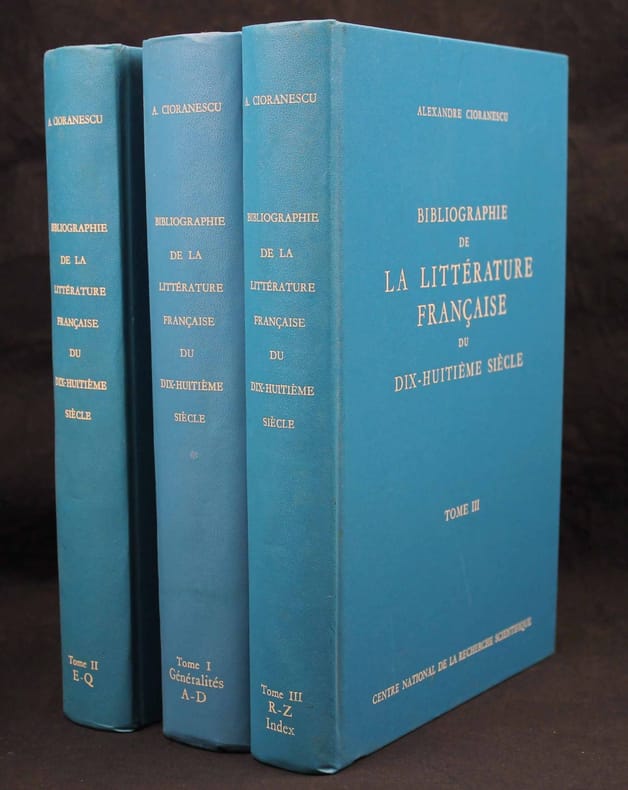 Bibliographie incontournable. 7233 entrées. Par thème en début d'ouvrage, puis par auteur. Avec aussi les études qui leur a été consacré jusqu'en 1960. Avec index des auteurs et des sujets. /// 3 volumes in-4 de IX, 2137 pp. Toile bleue de l'éditeur. //// Essential bibliography. 7233 entries. By theme at the beginning of the book, then by author. Also includes studies devoted to them up to 1960. With index of authors and subjects.