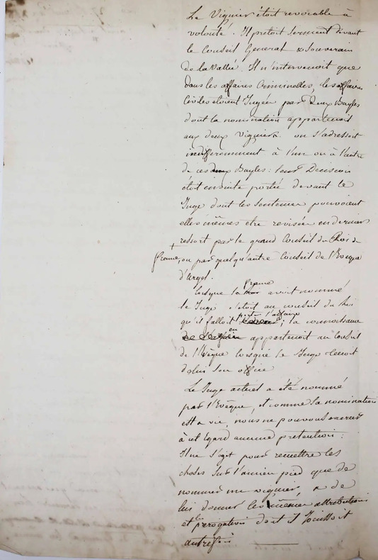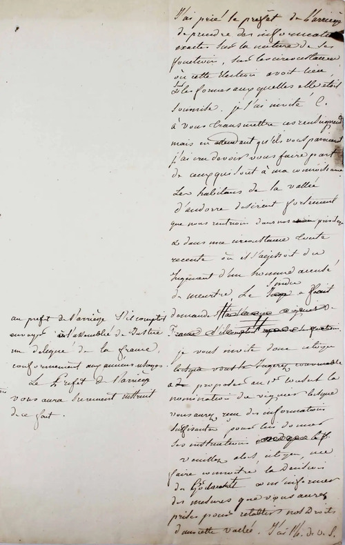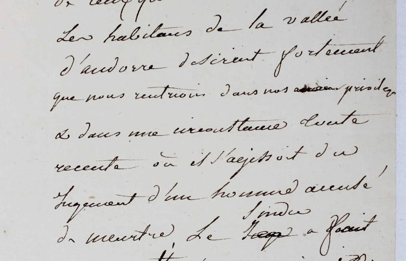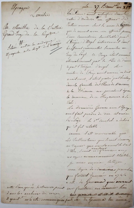 Une pièce historique du plus haut intérêt pour l'histoire de l'Andorre. Il s'agit du brouillon d'une lettre adressée au Ministre de la Justice, daté du 27 Brumaire an XI. "La France avait autrefois dans la vallée d'Andorre un officier de justice connu sous le nom de viguier qui de concert avec un officier pourvu d'une commission semblable par l'évêque d'Urgel intervenait dans les affaires criminelles soumises au juge du pays. (...) La dernière guerre avec l'Espagne avait fait perdre de vue cet ancien privilège: le 1er consul [Napoléon Bonaparte] a désiré qu'il fut rétabli. (...) Les habitants de la vallée d'Andorre désirent fortement que nous rentrions dans nos anciens privilèges & dans une circonstance toute récente où il s'agissait du jugement d'un homme accusé de meurtre. (...) Je vous invite donc citoyen de proposer au 1er Consul la nomination du viguier..." Le rédacteur de cette lettre a cru nécessaire d'ajouter dans la marge que l'Andorre est situé entre la Cerdagne espagnole & le Département de l'Ariège. /// In-folio de 3 pp. ////