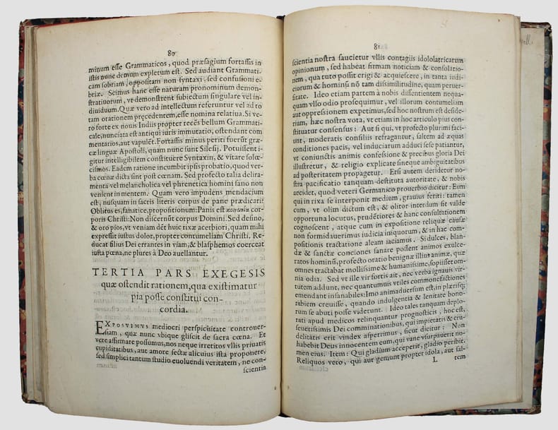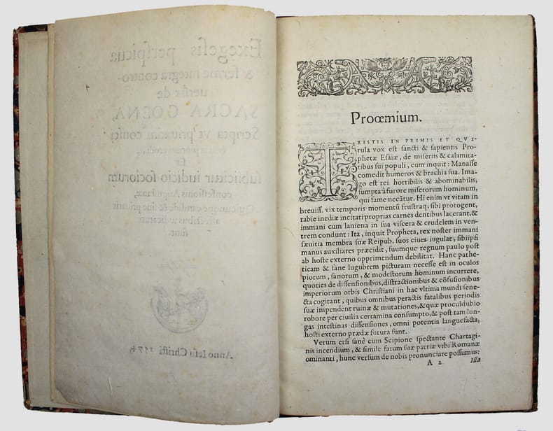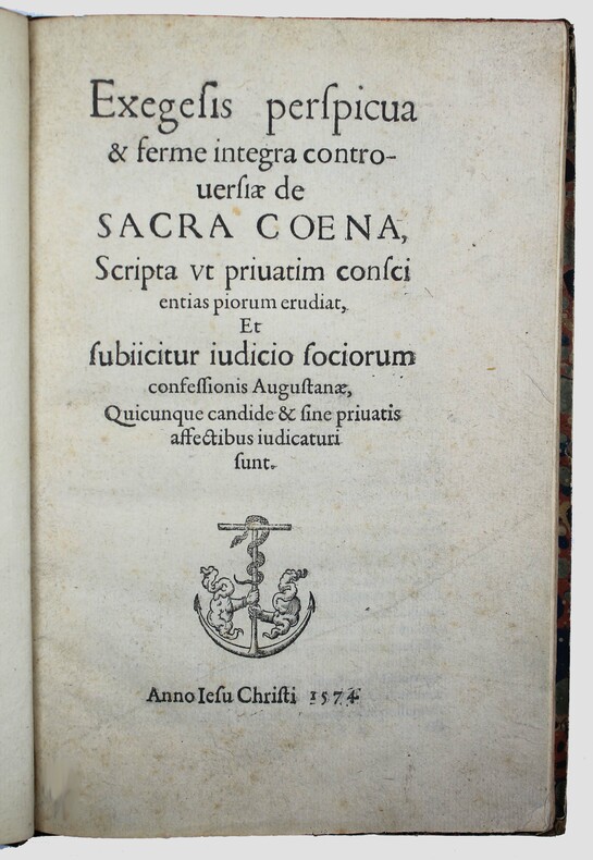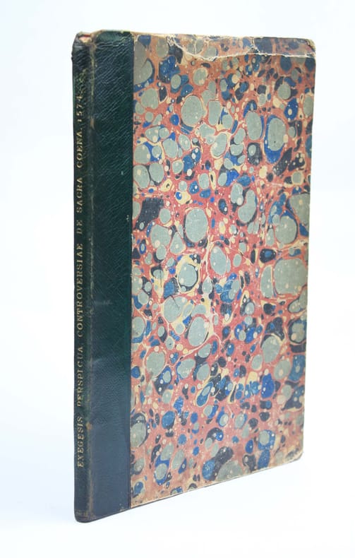 Edition posthume donnée par Théodore de Bèze. (Cfr Bèze, Correspondance, t. XV, p. 94, note 7.) Il existe deux tirages : l'un, comme celui-ci sans colophon, l'autre, (exemplaires de la Bibliothèque de Genève et de la Bayerische Staatsbibliothek.) avec la mention au bas du dernier feuillet : "Genevae, excudebat Eustathius Vignon, anno 1574". Joachim Cureus (1532 - 1573) était l'un des étudiants de Philipp Melanchthon. Il devint syndic de la ville de Glogau et y joua un rôle décisif dans l'introduction de la Réforme en 1564. C'est ici son écrit le plus important. L' "Exegesis perspicua" porte sur la doctrine de la Cène, qui a conduit à la persécution des Philippistes, par les gnésio-luthériens et les crypto-calvinistes sous l'électeur August de Saxe. Marque sur le titre de Eustache Vignon à l'ancre et au serpent. Coiffe supérieure abimée. USTC 450669. GLN-2505. /// In-4 de 96 pp., [A-M4] Demi-chagrin vert, titre doré. (Reliure du XIXe.) //// Posthumous edition given by Theodore de Bèze. (Cfr Bèze, Correspondance, t. XV, p. 94, note 7.) There are two editions: one, like this one without colophon, the other (copies of the Bibliothèque de Genève and of the Bayerische Staatsbibliothek.) with the mention at the bottom of the last page: "Genevae, excudebat Eustathius Vignon, anno 1574". Joachim Cureus (1532 - 1573) was a student of Philipp Melanchthon. He became a syndic of the city of Glogau and played a decisive role in the introduction their of the Reformation in 1564. This is his most important writing. The "Exegesis perspicua" deals with the doctrine of the Lord's Supper, which led to the persecution of the Philippians and the Crypto-Calvinists by the Gnesio-Lutherans under Elector August of Saxony. Mark on title of Eustache Vignon. USTC 450669. GLN-2505.