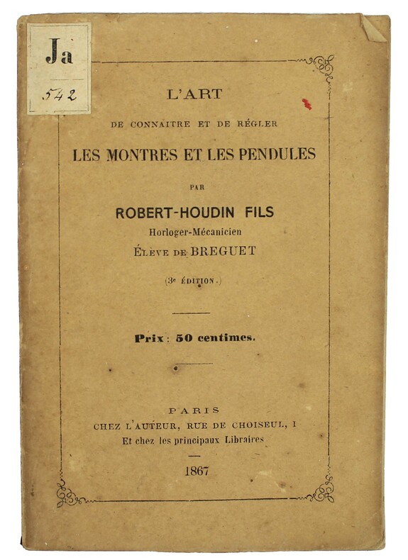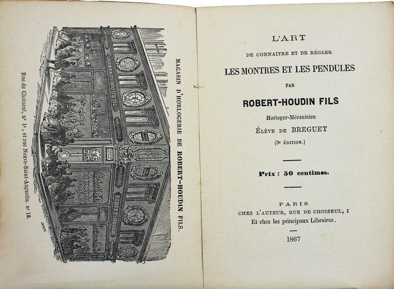 Emile Robert-Houdin était petit-fils d'horloger et fils de Jean-Eugène Robert-Houdin, le plus grand prestidigitateur de tous les temps, qui avait été lui aussi horloger. On trouve dans ce rare livret une gravure montrant sa vaste boutique à Paris, à l'angle de la rue de Choiseul et de la rue Neuve-Saint-Augustin. Il hérita du "Théâtre des soirées fantastiques", que sa veuve vendit à Georges Mélies. Bel exemplaire. /// In-16 de 62, (2) pp. Broché, couverture imprimée. //// /// PLUS DE PHOTOS SUR WWW.LATUDE.NET