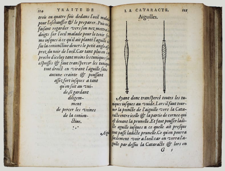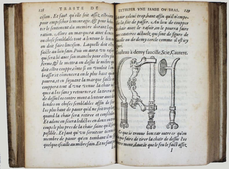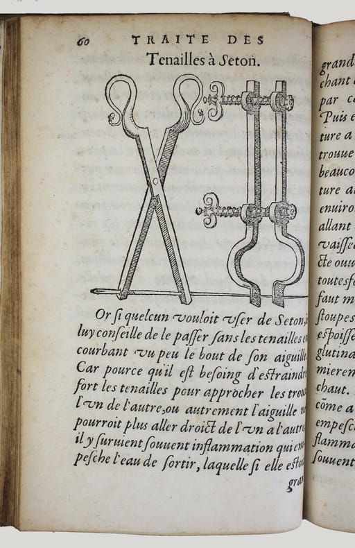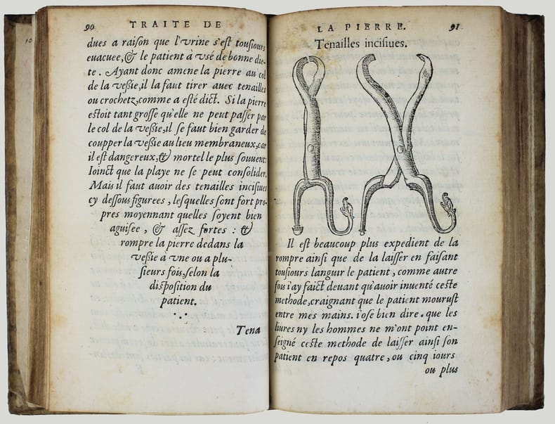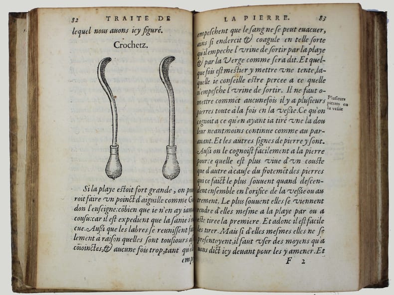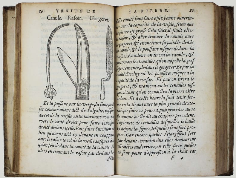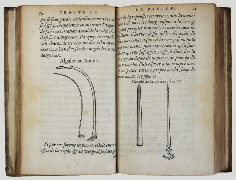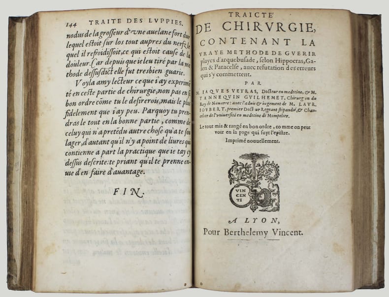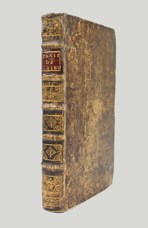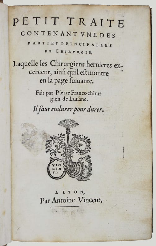 Première édition. Premier ouvrage de Pierre Franco, très rare. Il est illustré par 14 bois gravés montrant des instruments de chirurgie. Pauvre, et largement autodidacte, il a grandement amélioré la technique de l'herniotomie. "La gloire qui s'est attaché au nom d'Ambroise Paré ne doit pas nous faire oublier celui qui fut au moins son égal, Pierre Franco, et qui ne laissa pourtant que deux ouvrages. (...) La très grande rareté de ces volumes fait aujourd'hui tout leur prix." (Hahn, Dumaitre). Pour une raison inconnue, la date sur le titre a été grattée et curieusement c'est aussi le cas de l'exemplaire de la National Library of Medicine. Petit cachet gratté sur le titre. Manque à la BNF. UN SEUL EXEMPLAIRE dans le CCfr (Clermont-Ferrand). Hahn, Dumaitre, Histoire de la médecine et du livre médical 172. Relié à la suite : VEYRAS, Jacques, GUILHEMET, Tannequin, JOUBERT. Traicté de chirurgie, contenant la vraye méthode de guérir playes d'arquebusades, selon Hippocras, Galen & Paracelse, avec réfutation des erreurs qui s'y commettent. Lyon, Barthelemy Vincent, 1581. (28), 184 pp. Première édition. Veyras critique l'utilisation des onguents et des cataplasmes pour les soins des blessures par balle, les "arcquebusades", tels que préconisé par Laurent Joubert. Elle contient la manière de guérir les arcquebusades par Jacques Veyras, la réfutation par Tannequin Guilhemet du texte de Veyras, la réponse de Veyras, etc... Veyras était un médecin «semi-paracelsien» selon Didier Khan, Alchimie et Paracelsisme en France à la fin de la Renaissance. On trouve aux pages 97-184 : "Trois discours de M. Laurent Joubert lesquels contiennent trois belles questions, scavoir est, 1 S'il est meilleur se coucher de bonne heure et se lever matin ; 2 Si on peut guérir méthodiquement les pestiférez... ; 3 Si quelqu'un peut mourir de sa blessure ayant passé le quarantiesme jour... le tout recueilly et rédigé en script par Pierre Veyras, escolier en médecine, escrivant sous ledict sieur Joubert." Comme l'ouvrage précédent la date du titre a été grattée, ce qui est aussi le cas de l'exemplaire de la bibliothèque Sainte-Geneviève et de celui de la Bibliothèque Universitaire de Santé (la date y est manuscrite). Comme la moitié des exemplaires connus (Bibliothèque Universitaire de Santé, Sainte Geneviève, Versailles, Toulouse...) les feuillets de dédicace (alpha 3 et 4) ont été enlevés. (L'auteur a sans doute était mécontent de la réponse du dédicataire !) Bon exemplaire. /// Petit in-8 de (6), 144 pp. Vélin peint en brun, dos à nerfs orné. (Reliure du XVIIIe.) //// First edition and first book of Pierre Franco. He was "the best lithotomist of the 16th century. His skill in extracting the stone by the perineal route was of a high order; in 1556 he introduced the operation of suprapubic cystotomy in operating for stone. Franco also provided thefirst description of an operation for strangulated hernia. Franco, in 1556, was the first to perform suprapubic cystotomy. Poor, and largely self-taught, he greatly improved the technique of herniotomy". Garrison-Morton 3573 and 4279. "This edition is one of the rarest incunabula, and originals can only be secured with the greatest difficulty, and when obtained at all, at extravagant prices. ... This book is characterised by a simplicity and sincerity of diction that marks the work of a man accustomed rather to wield the scalpel than to handle the pen. ... The book of Franco have been spoken of for three centuries as work on hernia, although, as is clearly stated in the the title of the first edition, they are rather treaties 'on thoses branches of surgery commonly practised by hernia surgeons', and include in the first edition the widely diverse topics of hernia, stone, cataract, hare-lip, amputations, pterygium, and tumors." James E. Pilcher, Some sixteenth century surgery as seen in the works of Felix Wurtz and Pierre Franco, The Annals of Surgery 1896. "The glory, attached to the name of Ambroise Paré should not make us forget Pierre Franco who was at least his equal, and who nevertheless left only two books. (...) The very great rarity of these volumes makes their price today." ( Hahn, Dumaitre). Illustrated with 14 woodcuts showing surgical instruments. For some reason imprint date is erased on title, and it is strange to note that it is the same for the NLM copy. Small stamp scratched on title. No copy in Worldcat. Bound with : - VEYRAS, Jacques, GUILHEMET, Tannequin, JOUBERT. Traicté de chirurgie, contenant la vraye méthode de guérir playes d'arquebusades, selon Hippocras, Galen & Paracelse, avec réfutation des erreurs qui s'y commettent. Lyon, Barthelemy Vincent, 1581. (28), 184 pp. First edition. Veyras criticizes the use of ointments and cataplasms for the treatment of bullet wounds, the "arcquebusades", as recommended by Laurent Joubert. It contains Jacques Veyras' manner of curing 'arcquebusades', Tannequin Guilhemet's refutation of Veyras' text, Veyras' reply to it, etc... Veyras was a "semi-paracelsian" physician according to Didier Khan, Alchimie et Paracelsisme en France à la fin de la Renaissance. We find on pages 97-184: "Three discourses of Laurent Joubert which contain three beautiful questions", collected by Pierre Veyras, student in medicine, and nefew of Jacques Veyras. Like the previous work the date on the title has been erased, like the Bibliothèque Sainte-Geneviève's copy and the one at the Bibliothèque Universitaire de Santé (the date is handwritten). Like half of the known copies (Bibliothèque Universitaire de Santé, Sainte Geneviève, Versailles, Toulouse...) the dedication leaves (alpha 3 and 4) have been removed. (The author was probably unhappy with the answer of the dedicatee!) Fine copy