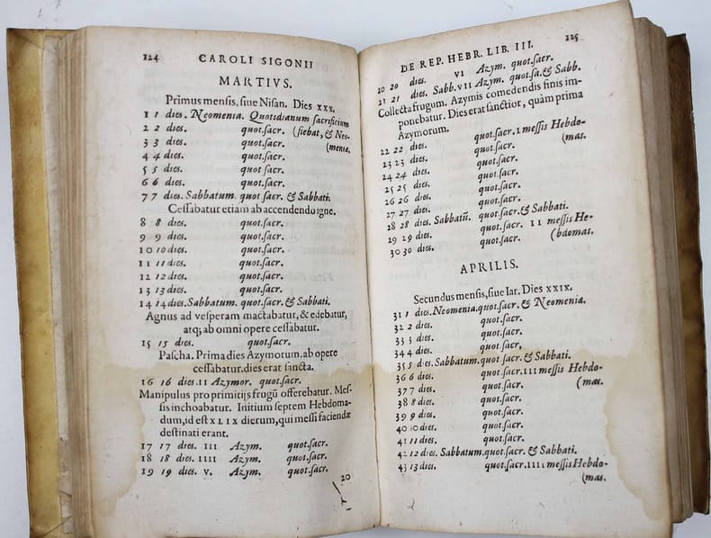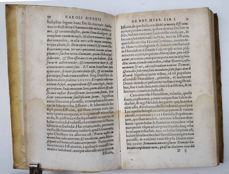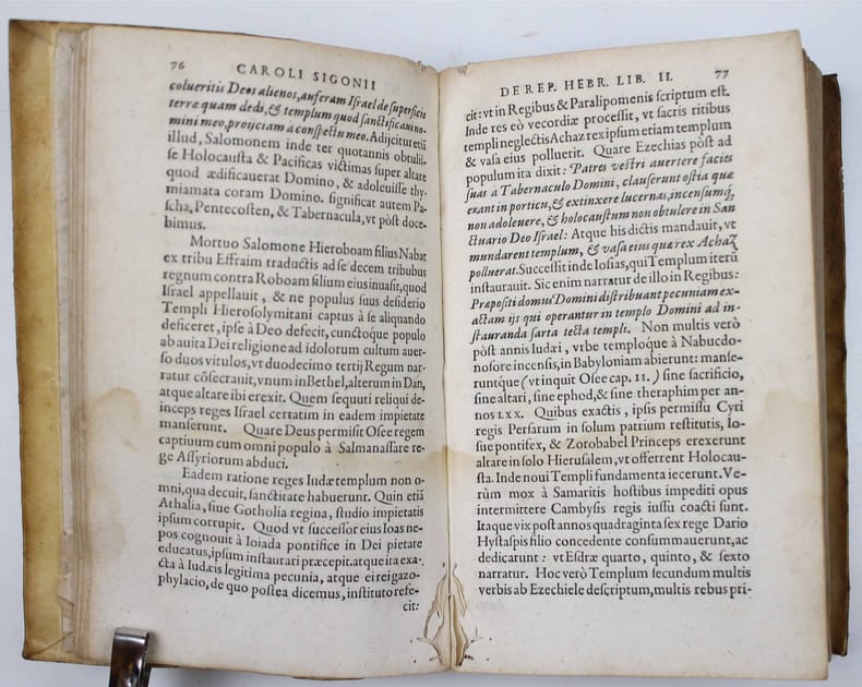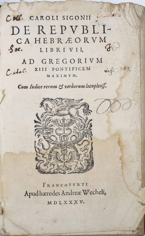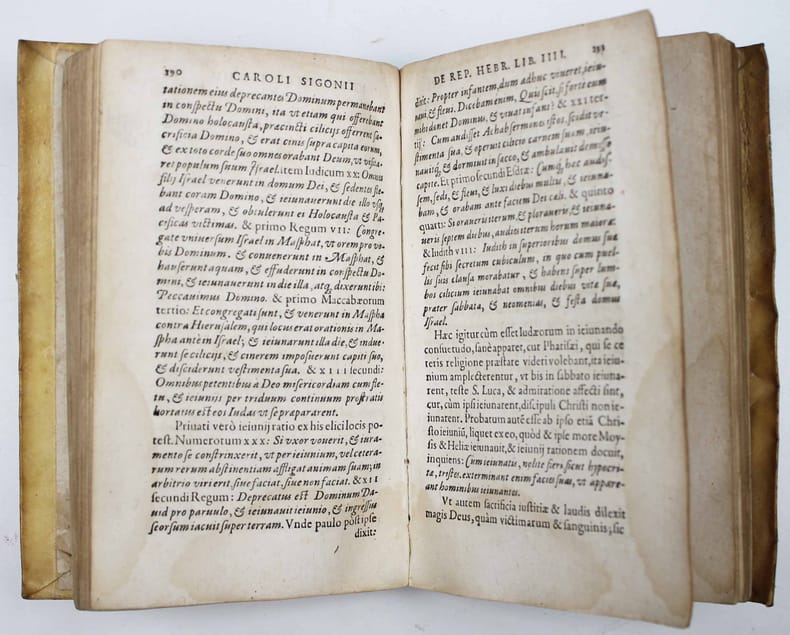Histoire politique, religieuse et culturelle du peuple juif. La première édition a été publiée en 1582. L'ouvrage a fait longtemps autorité puisqu'il a été réédité jusqu'au 19e siècle. Carlo Sigonio ou Carolus Sigonius (1520-1584) était historien et homme de lettres, professeur de grec et d'éloquence à Modène, Venise, Padoue et Bologne. Les deux premiers feuillets effrangés dans ses bordures, petits manques en coin et dans la marge supérieure des premiers feuillets. Travaux de vers très fins dans la marge inférieure, plus marqués cahiers F et G. Quelques traces d'humidité claires. La reliure est fraiche. USTC 619606. /// In-8 de 393, (23) pp. Vélin. (Reliure de l'époque.) //// Political, religious and cultural history of the Jewish people. The first edition was published in 1582. It was an authoritative work for a long time and was reprinted until the 19th century. Carlo Sigonio or Carolus Sigonius (1520-1584) was a historian and man of letters, professor of Greek and eloquence in Modena, Venice, Padua and Bologna. The first two leaves chipped in its edges, small lacks in the corner and in the upper margin of the first leaves. Very thin worm work in the lower margin, more marked quires F and G. Some light traces of dampness. Binding is fresh. USTC 619606.