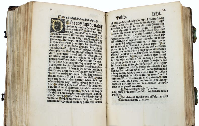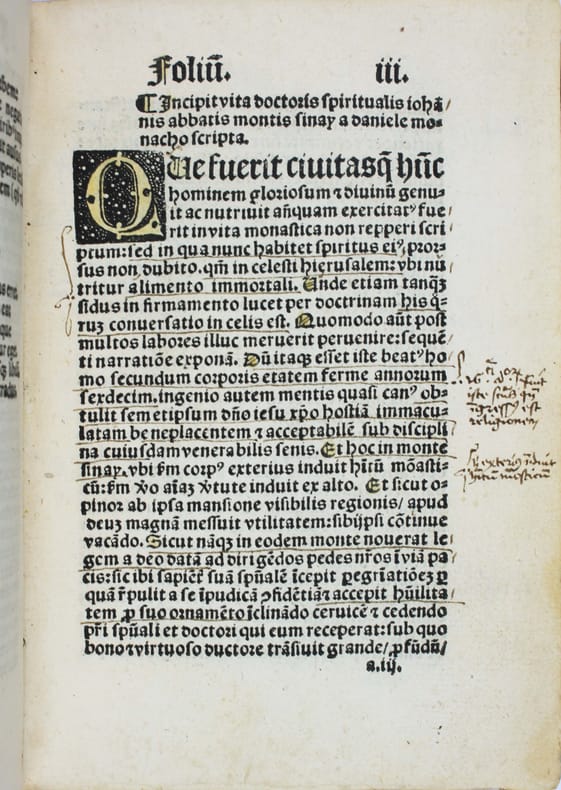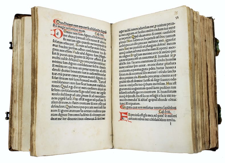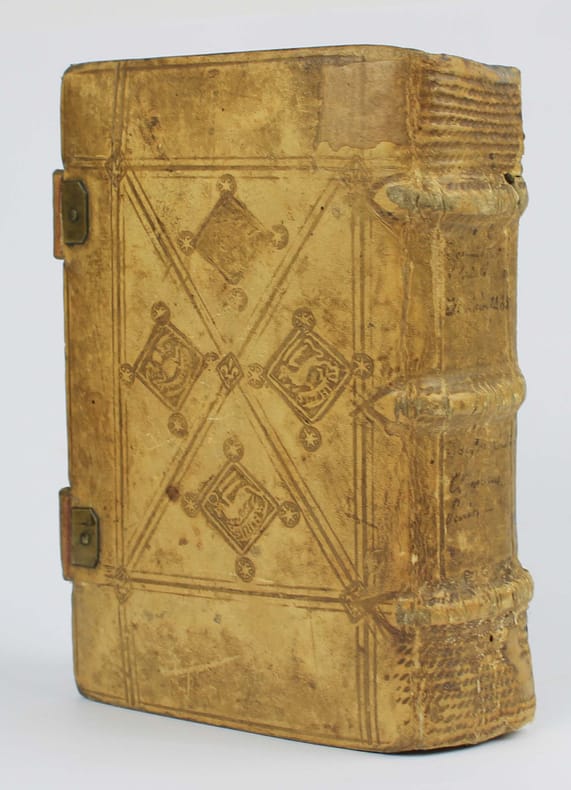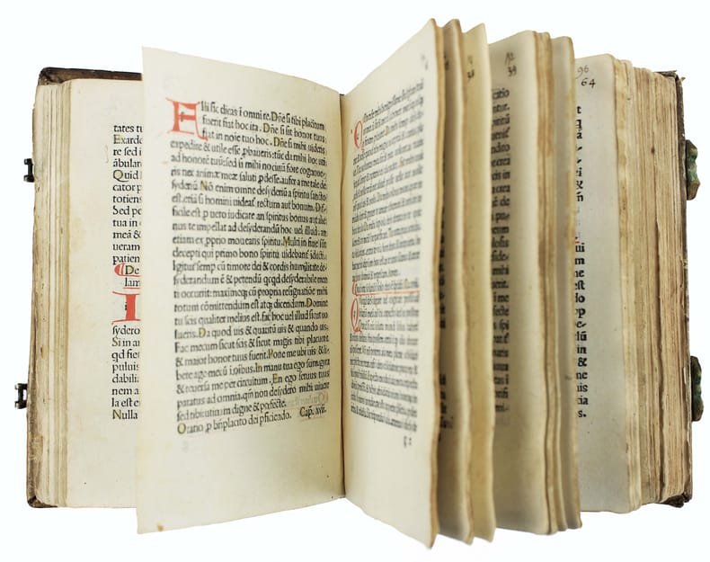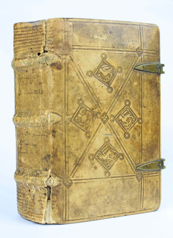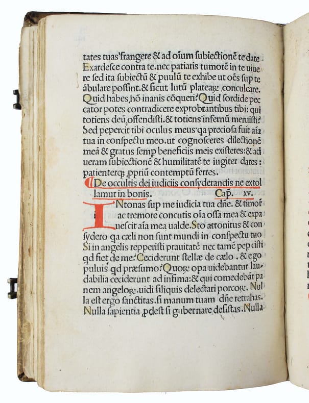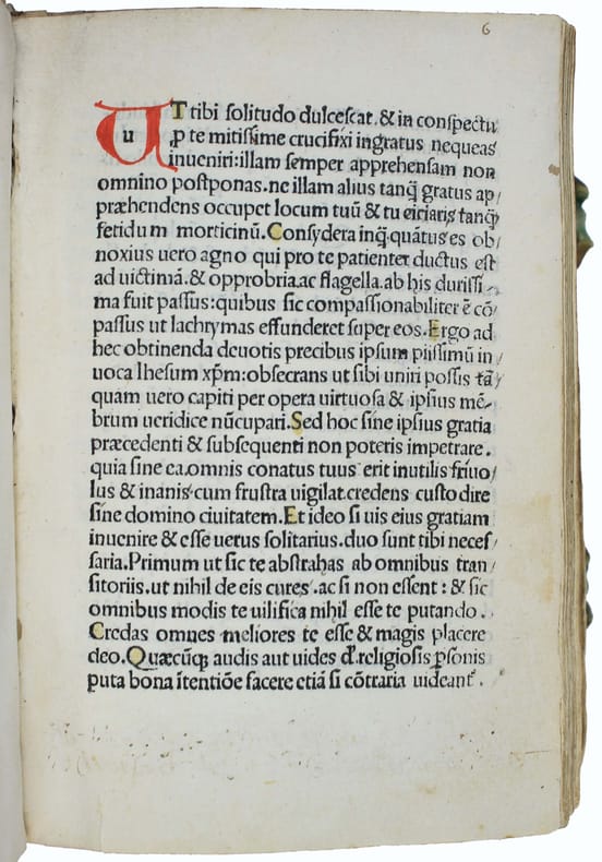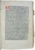 "Celui qui me suit ne marche pas dans les ténèbres". Ainsi commence le "De imitatione Christi", rédigé à la fin du XIVe siècle ou au début du XVe siècle. C'est " l'un des plus grands succès de librairie que l'Europe ait connu de la fin du Moyen Age au début de l'ère contemporaine." (Yann Sordet). Jolie édition en caractères romains, donnée par Jacobus Britannicus qui acheva d'imprimer son premier livre à Brescia le 7 Mai 1485. Celui-ci, datant du 6 Juin semble être son troisième livre. L' Imitatio Christi est attribué dans cette édition à Saint-Bernard. Grandes initiales peintes en rouge et titre de paragraphe souligné en rouge, petites initiales rehaussées en jaune. Il manque le premier feuillet A1 qui est blanc et le feuillet n2. Petite restauration feuillet m1. Colophon: Impressum Brixiæ per Jacobum Britannicum Brixianum di sexto Junii Mcccclxxxv. BMC VII974. ISTCii00009000. GW M46732. Relié à la suite : CLIMAX, Johannes. [Scala paradisi]. (Paris), Denis Roce, (vers 1505). In-8 de 158 ff. Une rare édition, classée parmi les incunables par certains bibliographes, mais que la BNF date autour de 1505. L'Echelle du paradis est un traité d'ascétisme monastique rédigé vers 600. Caractères gothiques. Initiales criblées rehaussées en jaune. Grande marque de limprimeur Denis Roce avec sa devise "A laventure tout vient à point qui peut attendre". Le livre a été imprimé par Jean Barbier, André Bocard ou Gaspard Philippe, d'après le matériel typographique. Colophon : "Finis tricesimi gradus huis celestis scale doctoris spûalis johannis scolastici abbatis montis sinay: qui ab edito libro cognominatus est Clymacus idest scalaris." Signatures: a-s8, t10. La marge supérieure du titre a été découpée sur 1 cm sans atteinte au texte. Un manque sans atteinte dans la marge du feuillet cxxxix. Brigitte Moreau I, 119. ISTC ij00311000. BMC VIII 229 (date around 1499). GW M13402. Goff J311. Une fente dans le haut et le bas de la première charnière. Les liens d'attaches manquent. Les plats de la reliure sont ornés de filets d'encadrement, avec quatre fleurons portant chacun le symbole des évangélistes. Bel exemplaire dans une très intéressante reliure. /// In-8 de (118) ff. Vélin sur ais de bois, décor estampé sur les plats, dos à trois nerfs. (Reliure de l'époque.) //// "Whoever follows me will never walk in darkness". Thus begins the "De imitatione Christi", written at the end of the 14th century or the beginning of the 15th century. It is "one of the greatest successes of bookselling that Europe knew from the end of the Middle Ages to the beginning of the contemporary era." (Yann Sordet). Nice edition in Roman type, given by Jacobus Britannicus who completed the printing of his first book in Brescia on May 7, 1485. This one, dated June 6, is apparently his third book. The Imitatio Christi is attributed in this edition to Saint Bernard. Large initials painted in red and paragraph title underlined in red, small initials highlighted in yellow. The first leaf A1 is missing, which is blank, and leaf n2. Small restoration of leaf m1. Colophon: Impressum Brixiæ per Jacobum Britannicum Brixianum di sexto Junii Mcccclxxxv. BMC VII 974. ISTC ii00009000. GW M46732. Bound after : CLIMAX, Johannes. [Scala paradisi]. (Paris), Denis Roce, (ca. 1505). In-8. 158 ff. A rare edition, listed among the incunabula by some bibliographers, but which the BNF dates around 1505. The Ladder of Paradise is a treatise on monastic asceticism written around 600. Gothic characters. Cribbed initials highlighted in yellow. Large printer mark of Denis Roce with his motto "A l'aventure tout vient à point qui peut attendre". The book was printed by Jean Barbier, André Bocard or Gaspard Philippe, according to the typographic material. Colophon: "Finis tricesimi gradus huis celestis scale doctoris spûalis johannis scolastici abbatis montis sinay: qui ab edito libro cognominatus est Clymacus idest scalaris." Signatures: a-s8, t10. The upper margin of the title has been trimmed for 1 cm without affecting the text. A gap without lost of printed material in the margin of folio cxxxix. Brigitte Moreau I, 119. ISTC ij00311000. BMC VIII 229 (date aroud 1499). GW M13402. Goff J311. A crack in the top and bottom of the first hinge. The binding ties are missing. The boards of the binding are decorated with filleted borders, with four fleurons each bearing the symbol of the evangelists. Beautiful copy in a very interesting binding.
