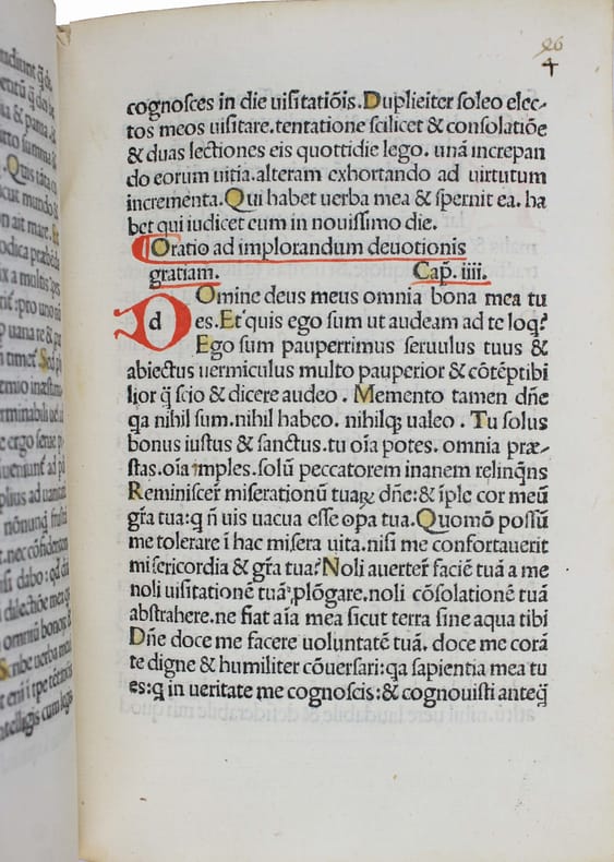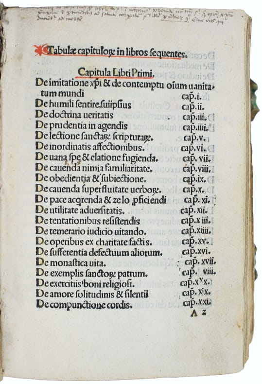 "Celui qui me suit ne marche pas dans les ténèbres". Ainsi commence le "De imitatione Christi", rédigé à la fin du XIVe siècle ou au début du XVe siècle. C'est " l'un des plus grands succès de librairie que l'Europe ait connu de la fin du Moyen Age au début de l'ère contemporaine." (Yann Sordet). Edition avec le "De meditatione cordis" de Jean Gerson. Achevé d'imprimer le 15 Juillet 1492, quelques semaines avant que Christophe Colomb ne s'embarque pour sa découverte de l'Amérique. Edition rare. Philippe Pigouchet a été un excellent imprimeur de la période incunable. Il a exercé sont art de 1488 à 1518, et imprima près de 150 livres, dont 90 éditions différentes de livres d'heures. Large initiale peinte en bleue et rouge en début de texte, toutes les initiales ont été peintes en début de chapitre. Le feuillet A1 qui porte seulement la marque de Philippe Pigouchet au recto, et dont le verso est blanc, manque ici et il a été remplacé par une page de titre avec un bois gravé d'une autre édition de l' Imitatio Christi. Bel exemplaire qu'un grand bibliophile du XIXe siècle a fait relié par Bauzonnet-Purgold vers 1820. /// In-8 gothique de (96) ff., [am8]. Maroquin violet, dos à nerfs orné, large encadrements dorés sur les plats, tranches dorées. (Reliure du XIXe.) //// "Whoever follows me will never walk in darkness" Thus begins the "De imitatione Christi", written at the end of the 14th century or the beginning of the 15th century. It is "one of the greatest successes of bookselling that Europe knew from the end of the Middle Ages to the beginning of the contemporary era." (Yann Sordet). Edition with the "De meditatione cordis" of Jean Gerson. Printed on July 15, 1492, a few weeks before Christopher Columbus embarked for his discovery of America. Rare edition. Philippe Pigouchet was an outstanding printer of the incunabula period. He practiced his art from 1488 to 1518, and printed nearly 150 books, including 90 different editions of books of hours. Large initial painted in blue and red at the beginning of the text, all initials were painted at the top of chapters. The leaf A1 which bears only the trademark of Philippe Pigouchet on the recto, and whose verso is blank, is missing here and has been substituted by a title page with a woodcut of another edition of the Imitatio Christi. A very fine copy bound by Bauzonnet-Purgold around 1820 for a great 19th century bibliophile. No copy in Great-Britain. GW M46796. ISTC ii00025000.