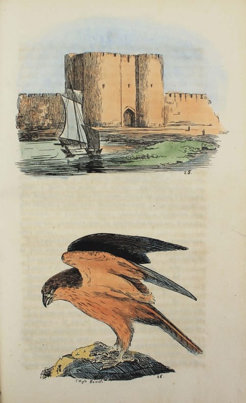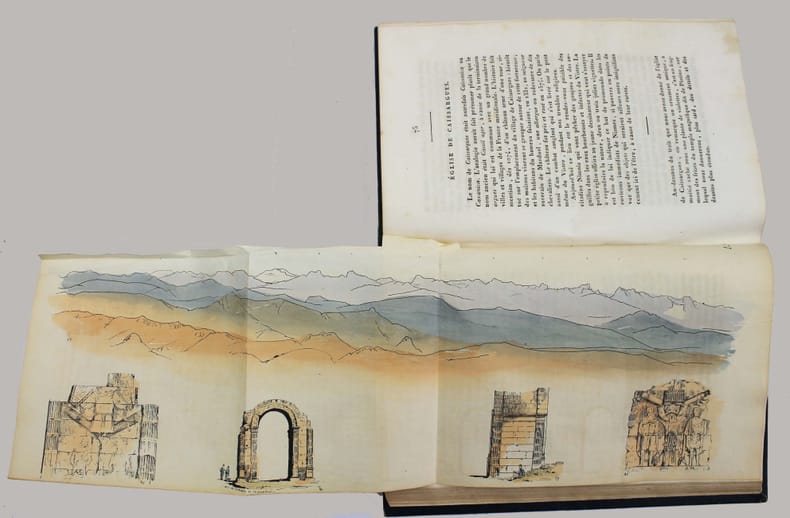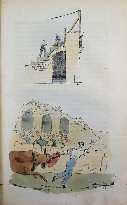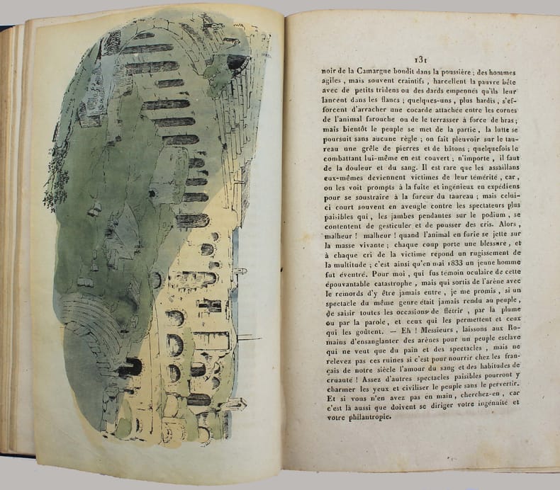 Nismes chez BIANQUIS-GIGNOUX, 1834-1835 1834 Deux volumes in-8°, VIII (2) (titre illustré) 160 et XII (2) (titre illustré) 232pp. Reliures en demi-basane fauve, dos lisses ornés (reliure époque). (dos et plats frottés, une coiffe manquante, présence de quelques rousseurs pâles, rares salissures, petite coupure à 4 feuillets). Deux premiers volumes seuls, un troisième et dernier volume paraîtra en 1838. Nombreuses illustrations (lithographie) en couleurs : 86 hors-texte, deux planches dépliants (un plan, un graphique) et 7 dans le texte. Deux portraits en noir. Table analytique.
