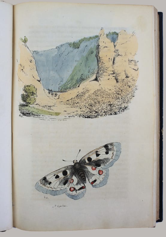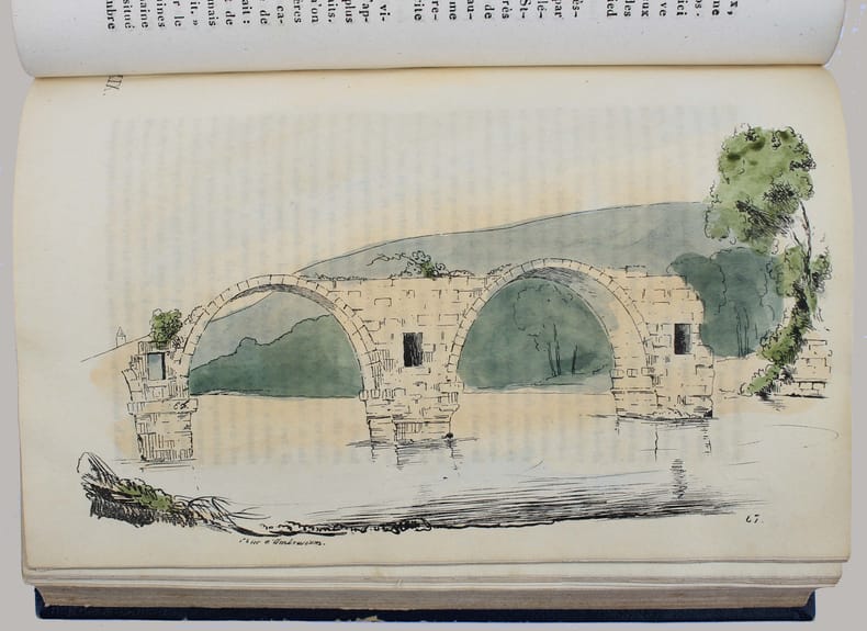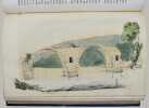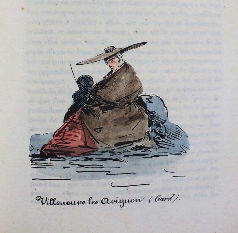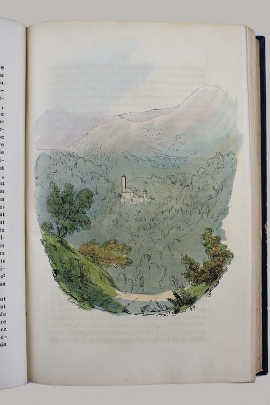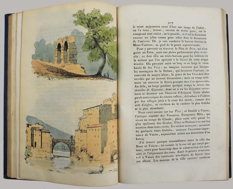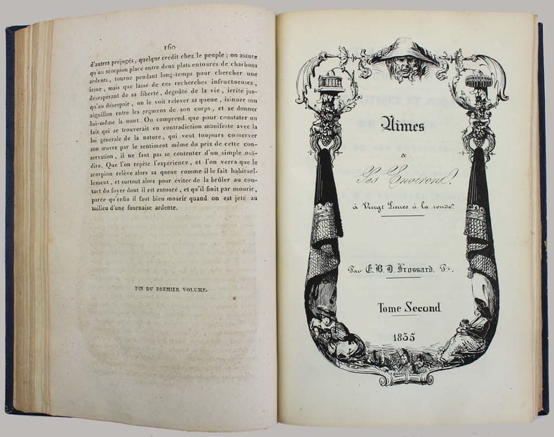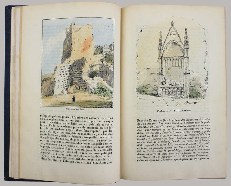Première édition. Un des rares exemplaire en couleurs. Il est illustré par 2 frontispices, 94 planches, dont 3 dépliantes et 7 gravures à mi-page. Toutes sont des lithographies et la majorité ont été délicieusement coloriées à l'aquarelle. Complet des trois parties, dont le supplément. Dans cette description du Gard mais aussi du Vaucluse et de l'Hérault, on trouve les sujets les plus variés : les baux de Provence, les Arènes, le rollier, le flamant, les bohémiens, l'ascension du Mont-Ventoux, les Quakers de Congéniès, Nostradamus, Avignon, Uzès, grottes de Gange, Montpellier, ascension du Pic Saint-Loup, Arles, la mante religieuse, le Vigan, etc ... Le pasteur Emilien Froissard est un des fondateurs la société Ramond pour l'étude scientifique des Pyrénées. Il a aussi publié deux ouvrages sur les Pyrénées qui sont illustrés dans le même style. La charmante illustration de ce volume ne laissera pas indifférent tout amateur de lithographie. L'exemplaire de la Bibliothèque Nationale, et tous ceux que nous avons pu repérer sont en noir. Dans celui-ci, plus de la moitié des illlustrations sont en couleurs. Papier des planches inévitablement bruni, mais bon exemplaire. /// In-8 de frontispice, VIII, 160 pp. / frontispice, XII, 232 pp. / (4), 104 pp. Demi-chagrin bleu, dos à nerfs. (Reliure de l'époque.) //// First edition. One of the few copies in color. It is illustrated with 2 frontispieces, 94 plates, including 3 folding plates and 7 mid-page engravings. All are lithographs, and most have been exquisitely colored in watercolor. Complete with all three parts, including the supplement. This description of the Gard, Vaucluse and Hérault regions covers a wide range of subjects: Baux de Provence, Arènas, the flamingo, the gypsies, ascent of Mont Ventoux, the Quakers of Congéniès, Nostradamus, Avignon, Uzès, caves of Gange, Montpellier, ascent of Pic Saint-Loup, Arles, le Vigan, etc... Pastor Emilien Froissard is one of the founders of the Ramond Society for the Scientific Study of the Pyrenees. He has also published two books on the Pyrenees, illustrated in the same style. The charming illustrations in this volume will not leave any lithography enthusiast indifferent. The Bibliothèque Nationale copy, and all the others we've been able to locate, are in black. In this one, more than half the illustrations are in color. Paper of the plates inevitably browned, but a good copy.