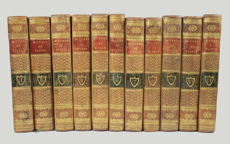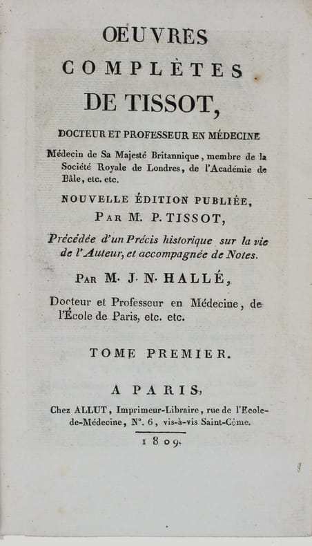 Nouvelle édition, publiée par Pascal Tissot, précédée d'un Précis historique sur la vie de l'auteur et accompagnée de notes, par J.-N. Hallé. Samuel Auguste Tissot (1728 -1797) a connu de son vivant une renommée extraordinaire. Son "Avis au peuple sur sa santé" a été traduit en 17 langues en moins de 25 ans. Mais, Tissot n'a pas écrit que sur l' "Onanisme", autre grand succès de librairie. Il a été très favorable à l'inoculation, et a défendu une médecine douce, fondée sur un régime de vie en accord avec la nature, et sur des remèdes à base de plantes, récusant à la fois la médecine populaire et la médecine savante. Le portrait que l'on devrait trouver dans le premier volume manque. Bon exemplaire. /// 11 volumes in-8 de Basane marbrée, dos orné, encadrements dorés sur les plats, tranches dorées. (Reliure de l'époque.) //// /// PLUS DE PHOTOS SUR WWW.LATUDE.NET