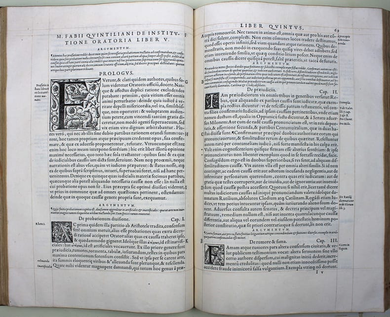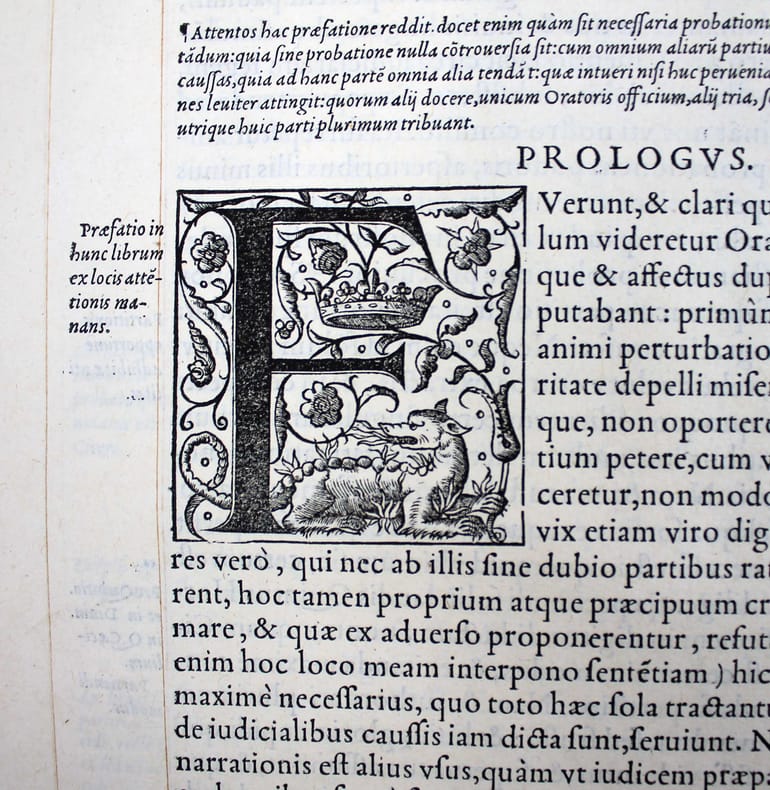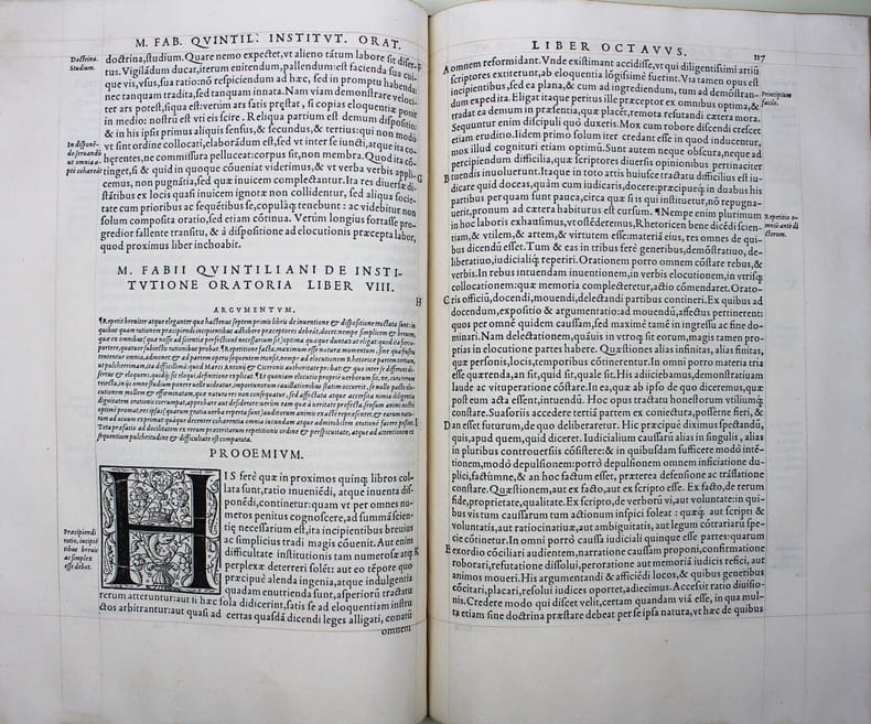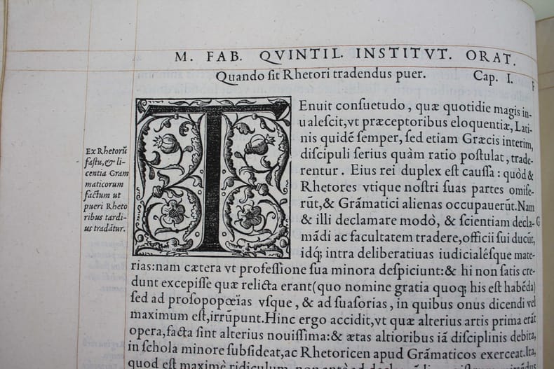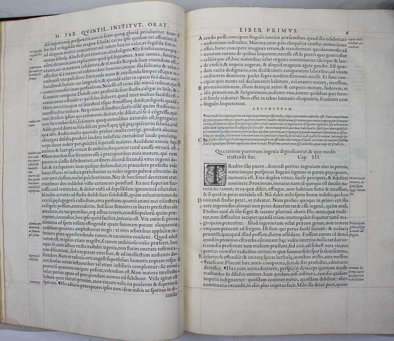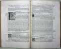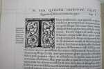 Belle impression de Michel Vascosan, l'un des plus meilleurs imprimeurs français du XVIe siècle, pour le compte du libraire Audouin Petit. Edition donnée et commentée par Pierre Galland (1510-1559), lecteur du roi François Ier pour le latin. Il était l'ami de Guillaume Budé, de François Vatable et de Joachim du Bellay. Elle est suivie des commentaires de Petrus Mosellanus, Joachim Camerarius et Antoine Pini. Le titre dans un encadrement gravé. Initiales historiées. La seconde partie "Declamationes XIX" a sa propre page de titre avec la marque gravée d'Audouin Petit. Exemplaire réglé. Très belle reliure parisienne qui a été habilement restaurée. Colophon (Bb6v): "Ex officina chalcographica Michaëlis Vascosani, Anno salutis Christianæ M.D. XLIX. Mense Martio". USTC 154020. /// In-folio de (22), 198, 58, 58 ff. Veau glacé, encadrements à froid sur les plats, avec fleurons dorés au centre et aux coins, dos à nerfs orné. (Reliure de l'époque.) //// Beautiful printing by Michel Vascosan, one of the best French printers of the 16th century, for the bookseller Audouin Petit. Edited and commented by Pierre Galland (1510-1559), King François I's Latin reader. He was a friend of Guillaume Budé, François Vatable and Joachim du Bellay. It is followed by commentaries by Petrus Mosellanus, Joachim Camerarius and Antoine Pini. Title in woodcut border Historiated initials. The second part "Declamationes XIX" has its own title page with the engraved mark of Audouin Petit. Ruled copy. Very fine Parisian binding which has been skilfully restored. Colophon (Bb6v): "Ex officina chalcographica Michaëlis Vascosani, Anno salutis Christianæ M.D. XLIX. Mense Martio". USTC 154020.