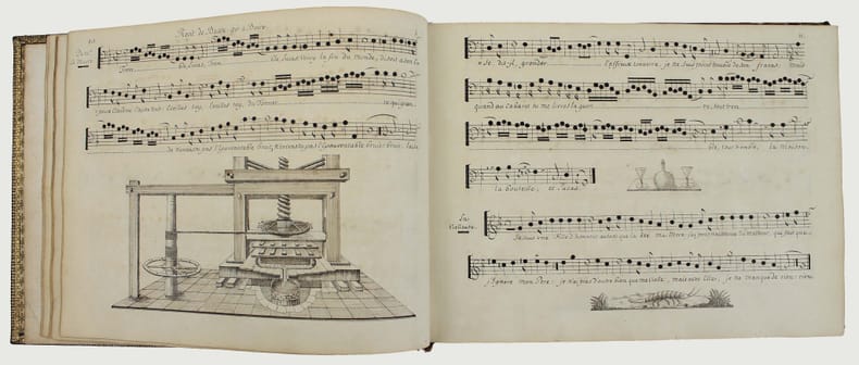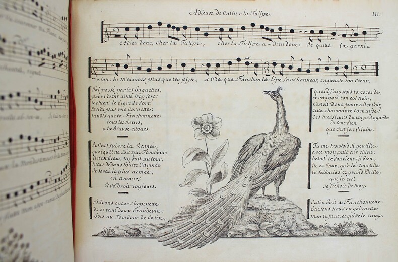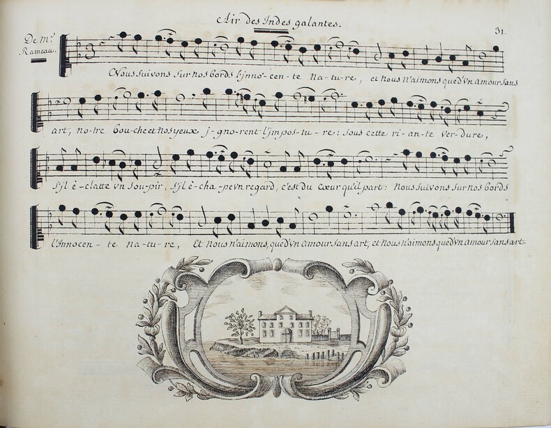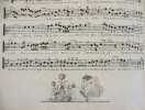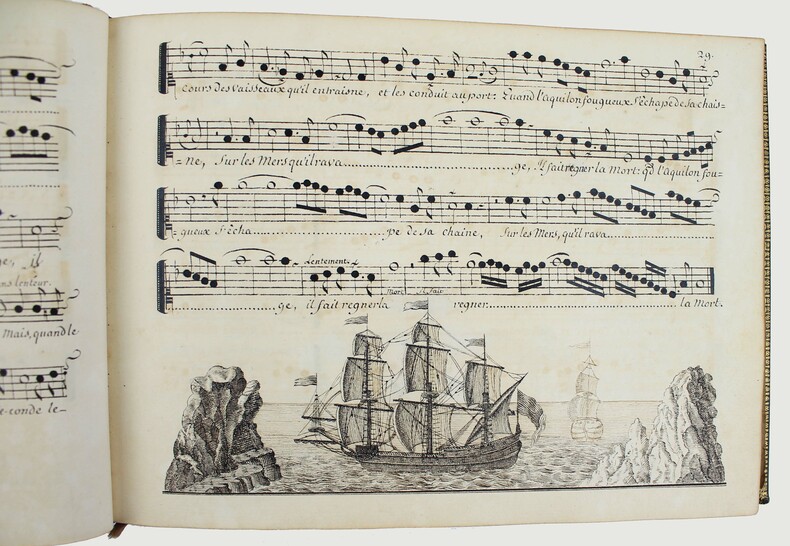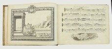 Magnifique manuscrit, oeuvre d'un calligraphe professionnel. C'est un recueil d'airs de musique illustré d'innombrables dessins à la plume. Parmi tous les compositeurs, Jean-Philippe Rameau, alors au sommet de sa gloire, y figure en première place par le nombre d'extraits de musique que l'on y trouve : les Indes Galantes, Dardanus, Hippolyte et d'Aricie, Zaïs, Pygmalion ... Ces deux derniers opéras avaient été joués pour la première fois l'année précédente. Et aussi l'Amadis de Lully, des airs de vaudevilles, des chansons à boire, les cantates de la Musette et de Medée, de Clerambault, et des airs de musiciens moins connus aujourd'hui comme Bertin, Mouret, Rochard, de La Garde, de Monteclair... Il n'y a pas d'ordre apparent dans la suite des airs contenus dans ce recueil, ce sont des "airs choisis" comme il est inscrit sur la pièce de titre de la reliure. On trouve au recto et au verso du premier feuillet les armes du commanditaire de cet ouvrage : Girard de Vannes. Il s'agit de Pierre-Jacques Girard de Vannes (1705-1767) lieutenant des maréchaux de France pour le Nivernais, puis conseiller à la Chambre des Comptes et grand-Bailli d'épée du Nivernais. (Armorial du Nivernais, tome II, planche XVII). La belle reliure en maroquin, aux gardes de papier étoilé peut-être attribué à Derome. La date de Mai 1749 figure à la fin, avant une table alphabétique. La pagination passe par erreur de 59 à 80 sans manque. Charnière frottée. Très bel exemplaire de ce manuscrit étonnant par le raffinement de ses dessins. in-4 oblong, [176 x 235 mm] de (2), 170 [i. e. 150], (8) pp. Maroquin noir, encadrements de filets dorés avec fleuron aux angles sur les plats, dos à nerfs orné, tranches dorées. (Reliure de l'époque.) - - - - - - - - - - - - - - - - - - - - A splendid manuscript, the work of a professional calligrapher. It is a collection of musical arias illustrated with countless pen-and-ink drawings. Of all the music composers, Jean-Philippe Rameau, then at the height of his fame, is at the top of the list in terms of the number of musical excerpts included: Les Indes Galantes, Dardanus, Hippolyte et d'Aricie, Zaïs, Pygmalion... These last two operas had been performed for the first time the previous year. And also Lully's Amadis, vaudeville arias, chansons à boire, Clerambault's cantatas de la Musette et de Medée, and arias by lesser-known musicians such as Bertin, Mouret, Rochard, de La Garde, de Monteclair... There is no apparent order to the arias contained in this collection; they are "airs choisis" (chosen arias), as inscribed on the title-piece of the binding. On the front and back of the first leaf are the arms of the book's patron: Girard de Vannes. This was Pierre-Jacques Girard de Vannes (1705-1767), lieutenant of the marshals of France for the Nivernais region, then counselor to the Chambre des Comptes and Grand-Bailli d'épée du Nivernais. (Armorial du Nivernais, tome II, plate XVII). The fine morocco binding, with starred paper endpapers, may be attributed to Derome. The date 'May 1749' appears at the end, before an alphabetical table. The pagination erroneously skips from 59 to 80, with no gaps. A very fine copy of this surprisingly refined manuscript. . -