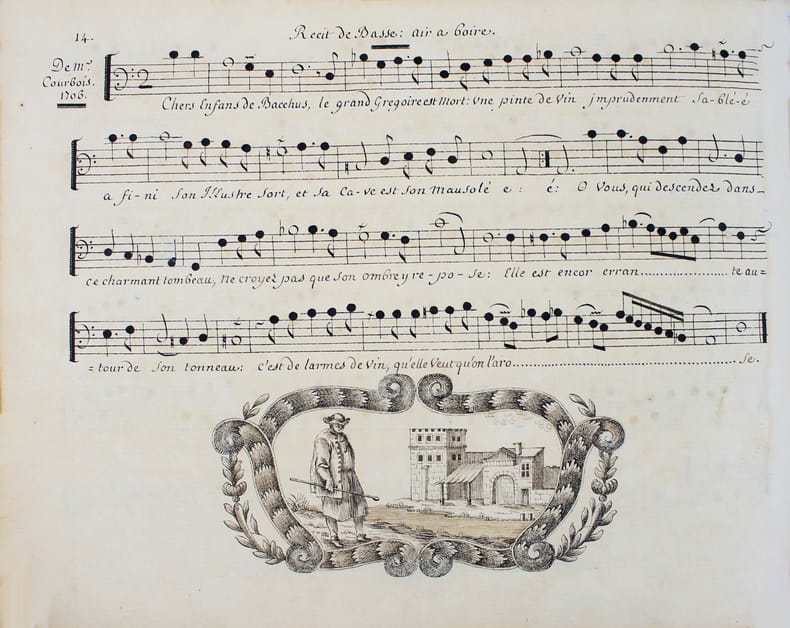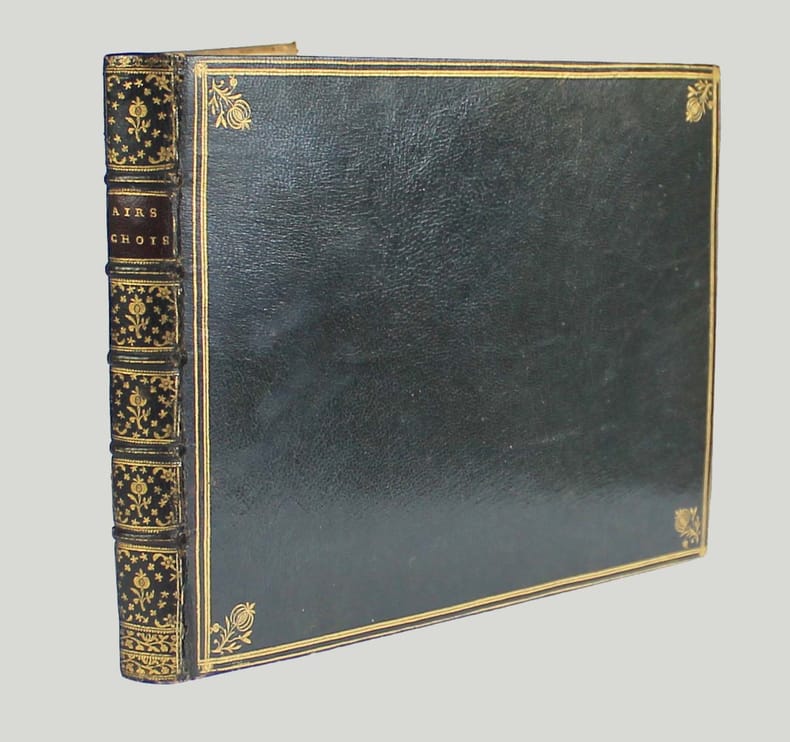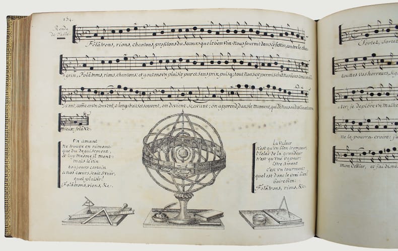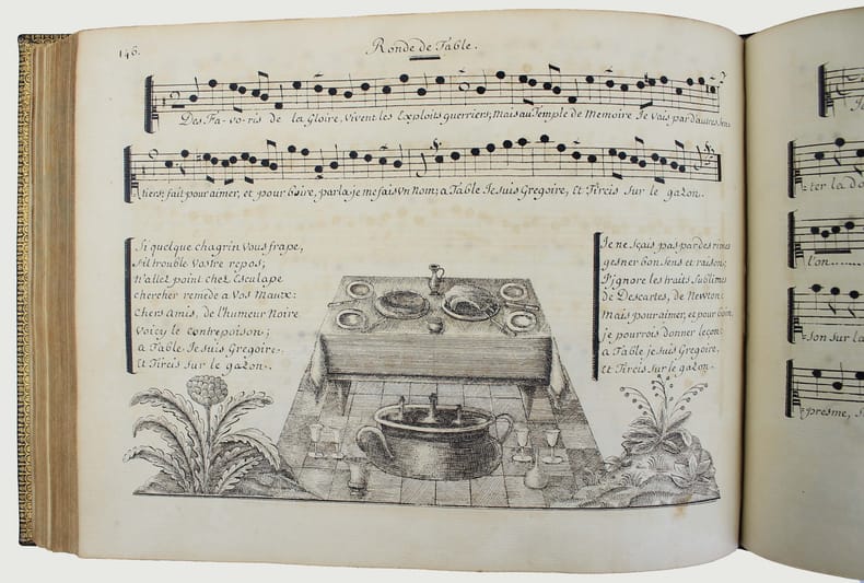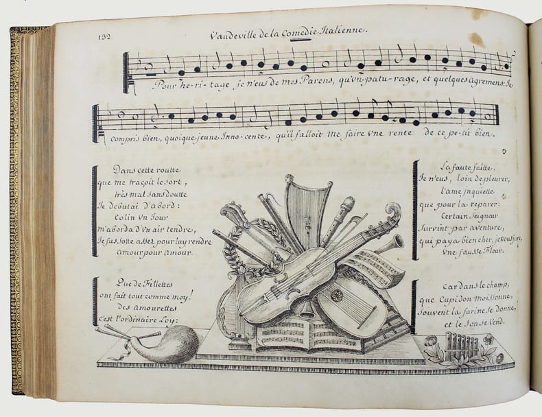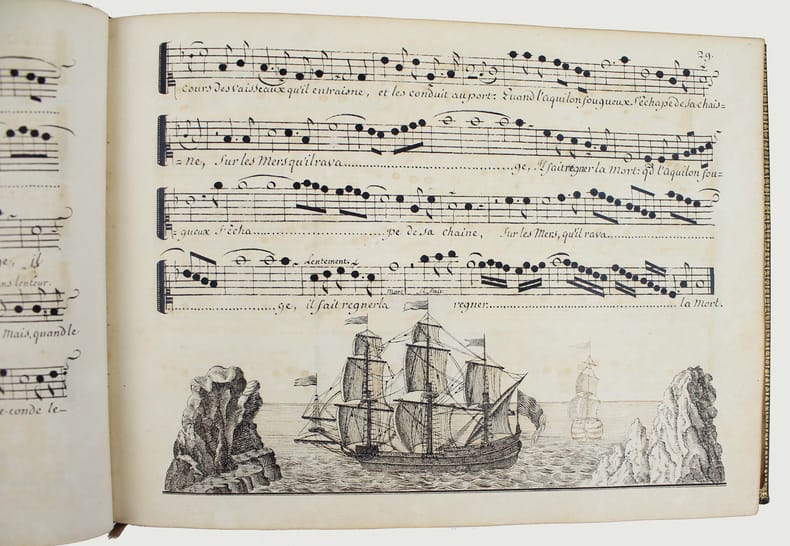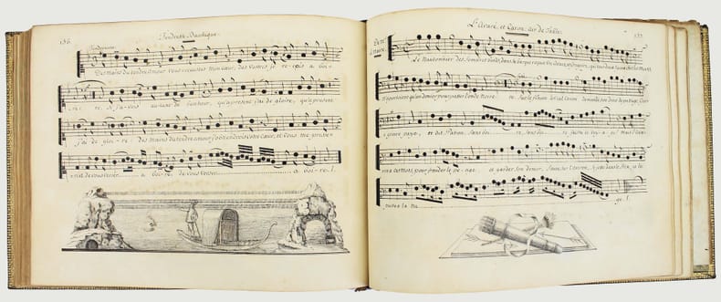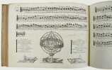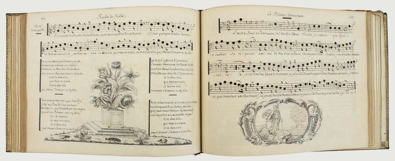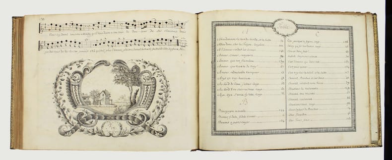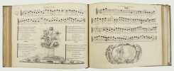 Magnifique manuscrit, oeuvre d'un calligraphe professionnel. C'est un recueil d'airs de musique illustré d'innombrables dessins à la plume. Parmi tous les compositeurs, Jean-Philippe Rameau, alors au sommet de sa gloire, y figure en première place par le nombre d'extraits de musique que l'on y trouve : les Indes Galantes, Dardanus, Hippolyte et d'Aricie, Zaïs, Pygmalion ... Ces deux derniers opéras avaient été joués pour la première fois l'année précédente. Et aussi l'Amadis de Lully, des airs de vaudevilles, des chansons à boire, les cantates de la Musette et de Medée, de Clerambault, et des airs de musiciens moins connus aujourd'hui comme Bertin, Mouret, Rochard, de La Garde, de Monteclair... Il n'y a pas d'ordre apparent dans la suite des airs contenus dans ce recueil, ce sont des "airs choisis" comme il est inscrit sur la pièce de titre de la reliure. On trouve au recto et au verso du premier feuillet les armes du commanditaire de cet ouvrage : Girard de Vannes. Il s'agit de Pierre-Jacques Girard de Vannes (1705-1767) lieutenant des maréchaux de France pour le Nivernais, puis conseiller à la Chambre des Comptes et grand-Bailli d'épée du Nivernais. (Armorial du Nivernais, tome II, planche XVII). La belle reliure en maroquin, aux gardes de papier étoilé peut-être attribué à Derome. La date de Mai 1749 figure à la fin, avant une table alphabétique. La pagination passe par erreur de 59 à 80 sans manque. Charnière frottée. Très bel exemplaire de ce manuscrit étonnant par le raffinement de ses dessins. /// in-4 oblong de (2), 170 [i. e. 150], (8) pp. Maroquin noir, encadrements de filets dorés avec fleuron aux angles sur les plats, dos à nerfs orné, tranches dorées. (Reliure de l'époque.) //// A splendid manuscript, the work of a professional calligrapher. It is a collection of musical arias illustrated with countless pen-and-ink drawings. Of all the music composers, Jean-Philippe Rameau, then at the height of his fame, is at the top of the list in terms of the number of musical excerpts included: Les Indes Galantes, Dardanus, Hippolyte et d'Aricie, Zaïs, Pygmalion... These last two operas had been performed for the first time the previous year. And also Lully's Amadis, vaudeville arias, chansons à boire, Clerambault's cantatas de la Musette et de Medée, and arias by lesser-known musicians such as Bertin, Mouret, Rochard, de La Garde, de Monteclair... There is no apparent order to the arias contained in this collection; they are "airs choisis" (chosen arias), as inscribed on the title-piece of the binding. On the front and back of the first leaf are the arms of the book's patron: Girard de Vannes. This was Pierre-Jacques Girard de Vannes (1705-1767), lieutenant of the marshals of France for the Nivernais region, then counselor to the Chambre des Comptes and Grand-Bailli d'épée du Nivernais. (Armorial du Nivernais, tome II, plate XVII). The fine morocco binding, with starred paper endpapers, may be attributed to Derome. The date 'May 1749' appears at the end, before an alphabetical table. The pagination erroneously skips from 59 to 80, with no gaps. A very fine copy of this surprisingly refined manuscript. .