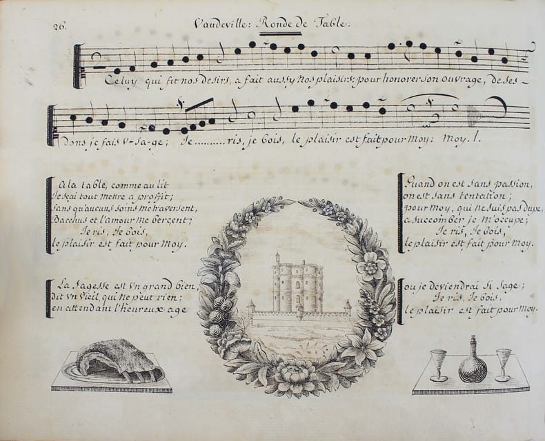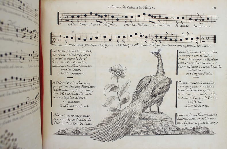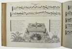 1760 A Paris: Chez De Lormel, 1760. In-4: 17.5 x 22.5 cm, 1 front, 4 ff. de titre, épître et avis de l'éditeur, 63-[1] pp., + 4 pl. grav., 1 f. d'errata, 1 front., 25 ff. d'airs avec partition. Belle édition illustrée d'un frontispice, d'une vignette de titre et de quatre figures hors-texte toutes de Martinet. Le frontispice est répété deux fois. "Fort joli volume, rare avec toutes les planches". (Cohen, 826). Reliure postérieure en maroquin vert signée Allô. Dos à cinq nerfs avec titre en capitales dorées et caissons ornés de roses. En encadrement des plats, large frise à motifs floraux. Belle dentelle aux chasses. Gardes recouvertes de papier marbré. Ex-libris: "André Gutzwiller". Dos insolé. Rares rousseurs. Bien complet de toutes les gravures et de toutes les partitions musicales.