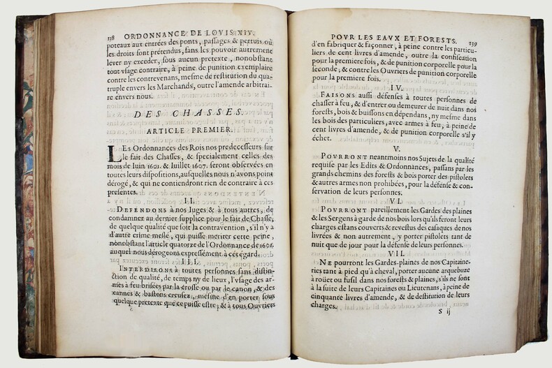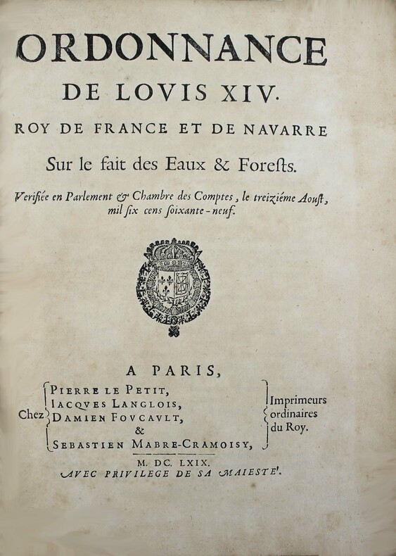 Rare édition originale de cette célèbre ordonnance de Colbert, qui fit autorité jusqu'à la Révolution. Notre Code forestier actuel est son héritier direct. L' "Ordonnance de Colbert" a favorisé le chêne et a permis la restauration des hautes futaies et l'indépendance du Royaume en matière de bois de marine. Cette ordonnance a connu de nombreuses rééditions, mais cette première édition est fort rare. Thiébaud, Bibliographie des ouvrages français sur la chasse 702 : "Rare". Relié à la suite : - Ordonnance de Louis XIV, Roy de France et de Navarre donnée à Saint Germain en Laye au mois d'Aoust 1670 pour les matières criminelles. Paris, chez les associés choisis par ordre de sa Majesté, 1670. In-4 de (8), 165, (47) pp. Reliure portant un chiffre doré sur les plats et entre les nerfs que nous n'avons pas pu déterminer. Des feuillets brunis. La reliure a été très restaurée. In-4 de (8), 192 pp. Veau brun, chiffre doré au quatres coins des plats, dos à nerfs orné du même chiffre, tranches mouchetées. (Reliure de l'époque.) - - - - - - - - - - - - - - - - - - - - -