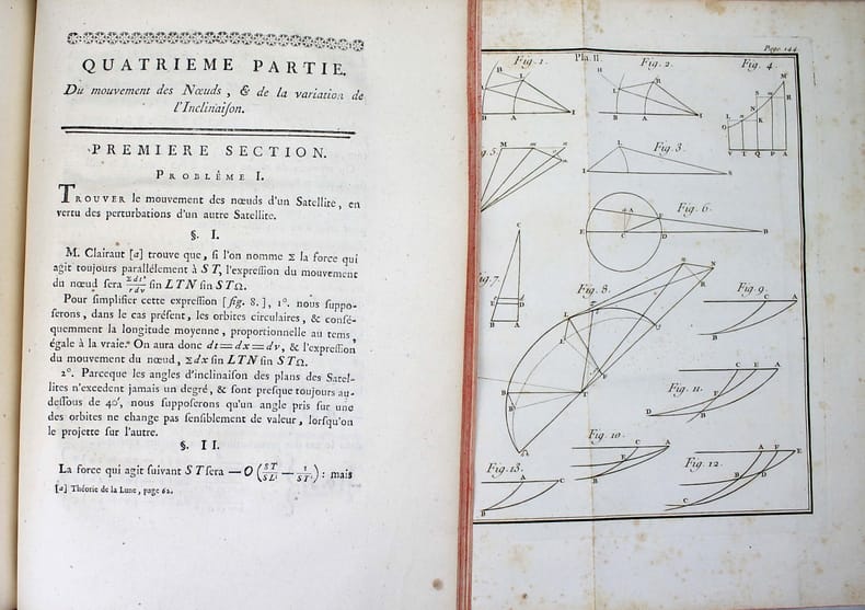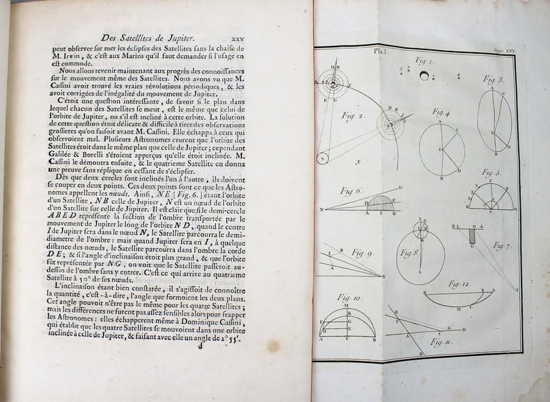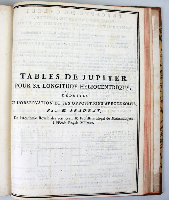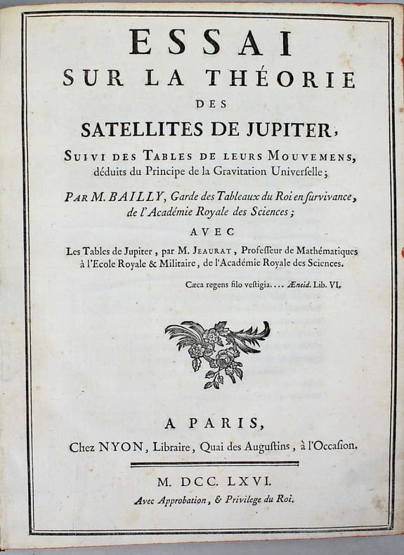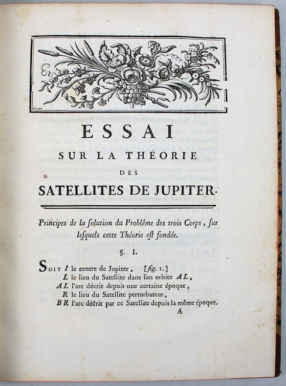 First edition. The major work of Jean-Sylvain Bailly (1736-1793), who succeded Lacaille as a member of Académie des Sciences. "Bailly approached the problem of inequalities in the motions of the four known satellites of Jupiter with Clairaut's lunar theory in mind. Improvements had been made in tables of the motions since Cassinis 1668 ephemerides, but these improvements had been made empirically. Bailly was the first to attempt to achieve better tables theoretically, by treating each satellite in turn as the third body in a three-body problem. His success was not complete - there were considerable discrepancies between his theoretical formulation of orbitary elements and their observed values - but he did demonstrate that the problem was amenable to solution by Newtonian principles." DSB 1, 400. Bailly's theoretical astronomy works were all published in the Mémoires de l'Académie des Sciences, with only this "Essai" published separately. Small scrach at the cap. Very fine copy. /// In-4 de LIII, (3), 114, 40 pp., 2 planches. Demi-basane brune, dos à nerfs orné, tranches rouges. (Reliure de l'époque.) //// Première édition. L'ouvrage majeur de l'astronome Jean-Sylvain Bailly (1736-1793), qui succéda à Lacaille comme membre de l'Académie des Sciences. "Bailly a abordé le problème des inégalités dans les mouvements des quatre satellites connus de Jupiter avec la théorie lunaire de Clairaut à l'esprit. Des améliorations avaient été apportées aux tables des mouvements depuis les éphémérides de Cassini en 1668, mais ces améliorations avaient été faites de manière empirique. Bailly fut le premier à tenter d'obtenir de meilleures tables sur le plan théorique, en traitant chaque satellite à tour de rôle comme le troisième d'un problème à trois corps. Son succès ne fut pas total - il y avait des divergences considérables entre sa formulation théorique des éléments orbitaux et leurs valeurs observées - mais il démontra que le problème pouvait être résolu par les principes newtoniens". DSB 1, 400. Les travaux d'astronomie théorique de Bailly ont été tous été publiés dans les Mémoires de l'Académie des Sciences, seul cet "Essai" a été publié de manière séparée. Petite éraflure à la coiffe. Très bel exemplaire.