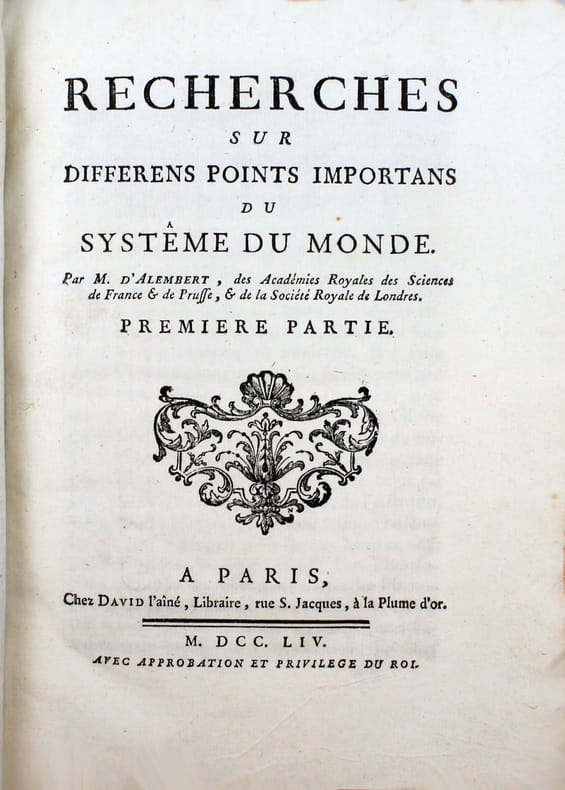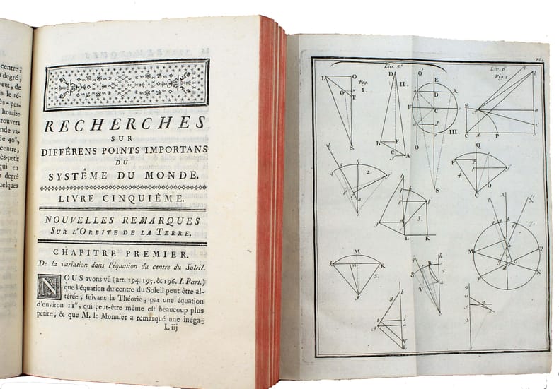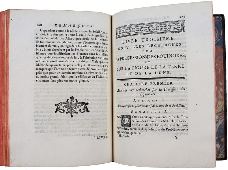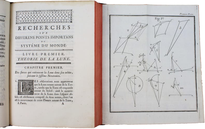 First edition. "Devoted primarily to the motion of the moon (volume III included a new set of lunar tables), it was written at least partially to guard d'Alembert's claims to originality against those of Clairaut. As was so often the case, d'Alembert's method was mathematically more sound, but Clairaut's method was more easily used by astronomers." DSB I, 114. A complete copy with the "Nouvelles Tables de la Lune par M. d'Alembert" which occupies the end of the last volume with its own pagination; these last 32 pages are often missing. Lalande, p. 453 and 459: "The first volume contains scholarly research on the three-body problem. The third volume contains a great deal of research into the construction of moon tables." Very fine copy. /// 3 volumes in-4 de LXVIII, 260 pp., 1 planche / VI, 290 pp., 3 planches / XLVIII, 263, (1), 32 pp., 2 planches. Veau marbré, dos à nerfs orné, tranches rouges. (Reliure de l'époque.) //// Première édition. "Consacré principalement au mouvement de la lune (le volume III comprend une nouvelle série de tables de la lunes), il a été écrit au moins en partie pour protéger les prétentions à l'originalité de d'Alembert contre celles de Clairaut. Comme ce fut souvent le cas, la méthode de d'Alembert était mathématiquement plus solide, mais celle de Clairaut était plus facilement utilisable par les astronomes". DSB I, 114. Exemplaire complet des "Nouvelles Tables de la Lune par M. d'Alembert" qui occupent la fin du dernier tome avec sa propre pagination; ces 32 dernières pages manquent souvent. Lalande, p. 453 et 459. "On trouve dans le premier volume des recherches savantes sur le problème des trois corps. Le troisième volume contient beaucoup de recherches sur la construction des tables de la lune." Très bel exemplaire.
