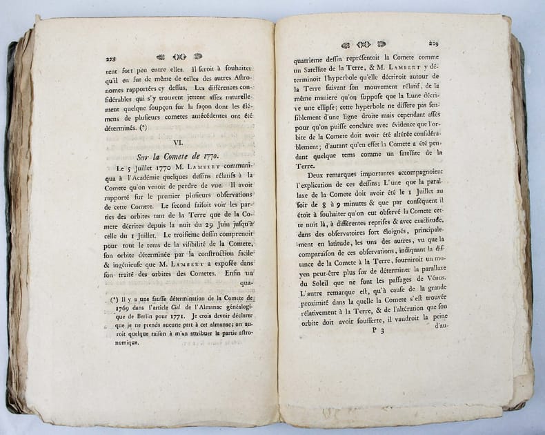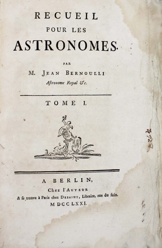 Premier volume de cet ouvrage périodique "fournissant de petits mémoires nouveaux d'astronomie, des tables subsidiaires, des observations, &c... présentant le tableau de tout ce qui paraît de nouveau en astronomie." Deux autres volumes seront publiés par la suite (1772 et 1776). Johan (ou Jean) (III) Bernoulli (Bâle,1744-1807) était le fils du mathématicien Jean (II) Bernoulli. Il a été un pionnier de la presse scientifique en particulier astronomique. "La curiosité universelle [de J. Bernoulli] et son prosélytisme scientifique incontestable font de ses écrits - périodiques ou autres - une mine de renseignements variés." (Sgard, Dict. des journalistes). Papier bruni, auréoles sur les premiers feuillets. Exemplaire dans son cartonnage de l'époque. /// In-8 de X, (2), 284 pp., 1 planche et 5 tableaux h.-t. dépliants. Cartonnage bleu de l'époque. //// First volume of this periodical work "furnishing small new memoirs of astronomy, subsidiary tables, observations, &c... presenting an overview of everything new in astronomy." Two further volumes were subsequently published (1772 and 1776). Johan (or Jean) (III) Bernoulli (Basel, 1744-1807) was the son of the mathematician Jean (II) Bernoulli. He was a pioneer of the scientific press, particularly astronomical. "J. Bernoulli's] universal curiosity and unquestionable scientific proselytism make his writings - periodical or otherwise - a mine of varied information." (Sgard, Dict. des journalistes). Paper browned, stains on first few leaves. Copy in its original boards. /// PLUS DE PHOTOS SUR WWW.LATUDE.NET
