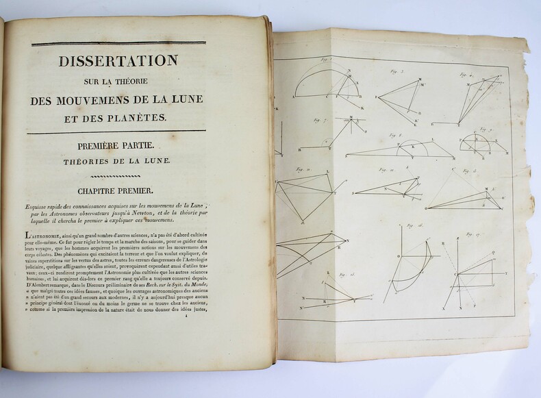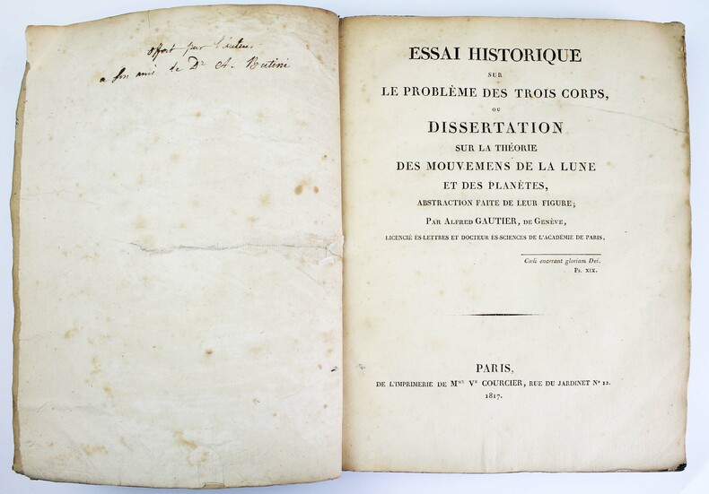 Première édition. Un historique très complet et détaillé du problème des trois corps en mécanique céleste : Newton, Clairaut, d'Alembert, Euler, Poisson, Laplace, Lagrange... Poisson a souligné le mérite de cet ouvrage dans un rapport fait à l'Académie des Sciences. L'ouvrage est aussi cité par Tisserand, Traité de mécanique céleste, III, p. 64. L'astronome suisse Alfred Gautier (1793-1881) a été directeur de l'Observatoire de Genève de 1821 à 1839. Il avait obtenu un doctorat en mécanique céleste à Paris. ENVOI à la plume de l'auteur sur la page de garde : "Offert par l'auteur à son ami le Dr. A. Butini". Le Docteur Adolphe Butini, de Genève (1792-1877), philantrope, fonda en 1859 avec sa femme, l'hôpital qui porte leur nom. Bon exemplaire. /// In-4 de XII, 283 pp., 1 planche h.-t. Couverture en papier éponge, étiquette imprimée au dos. (Brochure de l'époque.) //// First edition. A very complete and detailed history of the three-body problem in celestial mechanics: Newton, Clairaut, d'Alembert, Euler, Poisson, Laplace, Lagrange... Poisson praised this work in a report to the Académie des Sciences. The work is also cited by Tisserand, Traité de mécanique céleste, III, p. 64. Swiss astronomer Alfred Gautier (1793-1881) became director of the Geneva Observatory from 1821 to 1839. He had obtained a doctorate in celestial mechanics in Paris. INSCRIBED by the author on the flyleaf: "Offered by the author to his friend Dr. A. Butini". Doctor Adolphe Butini, of Geneva (1792-1877), philanthropist, founded in 1859 with his wife, the hospital that bears their name. A good copy.