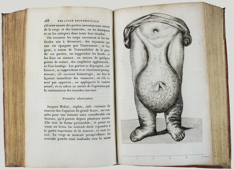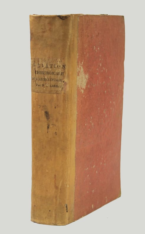 Paris, Demonville et Soeurs, 1803, in-8, 10-[1]-480 pp, 2 pl, Basane marbrée de l'époque, dos lisse et fleuronné, pièce de titre rouge, tranches rouges, Ouvrage illustré de deux planches gravées sur cuivre représentant des tumeurs éléphantiasiques chez l'homme et chez la femme. Première édition. Le baron Larrey (1766-1842), célèbre chirurgien des campagnes militaires de Napoléon Ier, décrit ici ses observations concernant les plaies de la tête et de la poitrine; une large part est faite aussi aux amputations des membres. Étiquette ex-libris du Dr Bonnette : Pierre Bonnette était médecin-major de 2e classe de l'armée française. Il est l'auteur d'une étude sur la conscription (Du choix des conscrits. Paris, Douin, 1910). Rousseurs. Coiffes arasées, coins usés. Waller, 5612. Wellcome III, 451. Hirsch III, 680. Couverture rigide
