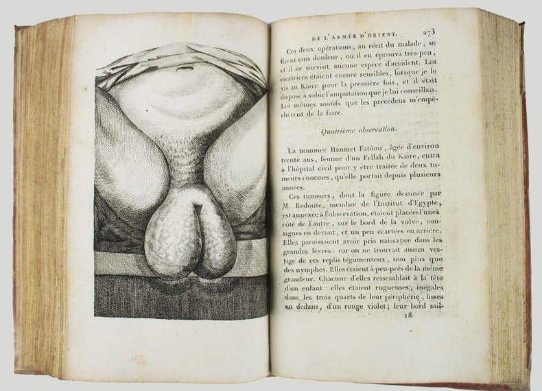 Première édition. Publiée neuf ans avant ses "Mémoires", il s'agit du premier ouvrage de Larrey sur l'expédition d' Egypte. Son récit débute par l'embarquement à Toulon et narre abondamment les péripéties de l'expédition, dont Aboukir et la relation de l'assassinat de Kléber. Il expose les problèmes médicaux rencontré par l'expédition : tétanos, peste, installation d'hôpitaux, développement de vers dans les plaies, fièvre jaune, hépatite, syphilis, amputations, etc. Le volume contient son "Mémoire sur l'ophtalmie régnante en Egypte" qui avait paru séparément au Caire deux ans plus tôt. Exemplaire complet avec le feuillet d'errata et les deux planches hors-texte montrant une éléphantiasis des parties génitales. Notes sur le titre de l'époque et signature caviardée. Bon exemplaire. /// In-8 de 10, (2), 480 pp., 2 planches h.-t. Demi-vélin. (Reliure de l'époque.) //// First edition. Published nine years before his "Mémoires", this is Larrey's first work on the Egyptian Expedition. His account begins with the embarkation in Toulon, and recounts the adventures of the expedition at length, including Aboukir and the assassination of Kléber. He describes the medical problems encountered, including tetanus, plague, the setting up of hospitals, the development of worms in wounds, yellow fever, hepatitis, syphilis and amputations. The volume contains his "Mémoire sur l'ophtalmie régnante en Egypte", which had appeared separately in Cairo two years earlier. Copy complete with errata page and two out-of-text plates showing elephantiasis of the genitals. A good copy. Garrison-Morton 12942 : "Larrey's history of his experiences with Napoleon and Napoleon's armies during the Egypt campaign. Includes a reprint of Larrey's treatise on trachoma, which was first published at Napoleon's press in Cairo." Contemporary notes on title and one blacked-out signature. Good copy.