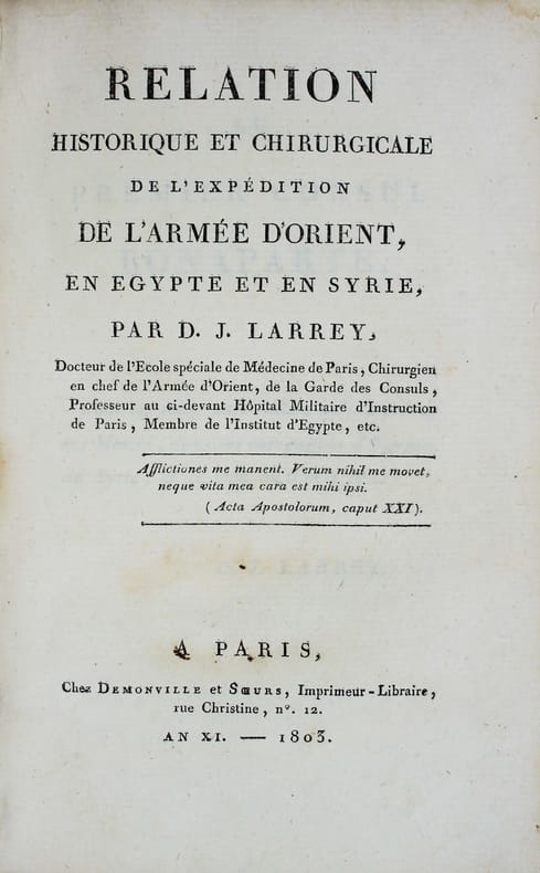 ---- EDITION ORIGINALE ---- ENVOI DE LARREY au chirurgien Joseph Athanase BARBIER ainsi libellé : "à Monsieur BARBIER professeur chirurgien de la part de son ancien collègue et ami", signé D.J. LARREY" ---- BEL EXEMPLAIRE ---- Comme LARREY, J.A. BABIER fut chirurgien militaire au Val de Grace dont il prit la direction en 1804. Il améliora le trépan, les ligatures artérielles sous-clavières et les greffes osseuses. (cf. Larousse "Dictionnaire historique des médecins") ---- Cet ouvrage, publié 9 ans avant les mémoires de médecine et de chirurgie, divisé en dix sections qui formant autant d'époques remarquables où sont classés, par ordre, les évènements principaux de l'armée d'orient, présente le tableau de toutes les maladies qui se sont manifestées pendant le séjour de Larrey en Egypte, telles que l'ophthalmie, le tétanos, la peste, les plaies de tête, de la face et de la gorge, pénétrantes à la poitrine, les amputations, paralysie des membres lésés, le sarcocèle, la fièvre jaune... ---- "The great military surgeon Larrey served during the Napoleonic campaign in Egypt, where he was the first to observe the contagiousness of trachoma shortly after the successful invasion in 1798. The disease spread to Europe thereafter under the name of 'military ophthalmia' or 'Egyptian ophthalmia'. Reprinted in Larrey's Relation historique et chirurgicale de l'expédition de l'armée d'orient, Paris 1803". (Garrison N° 5837)**3122/ARM1A