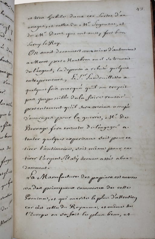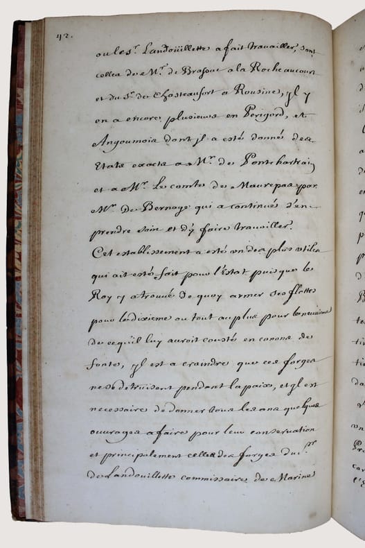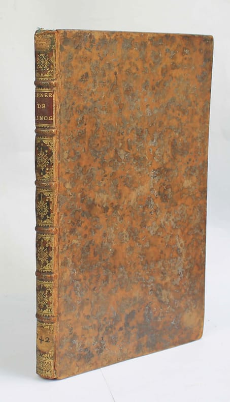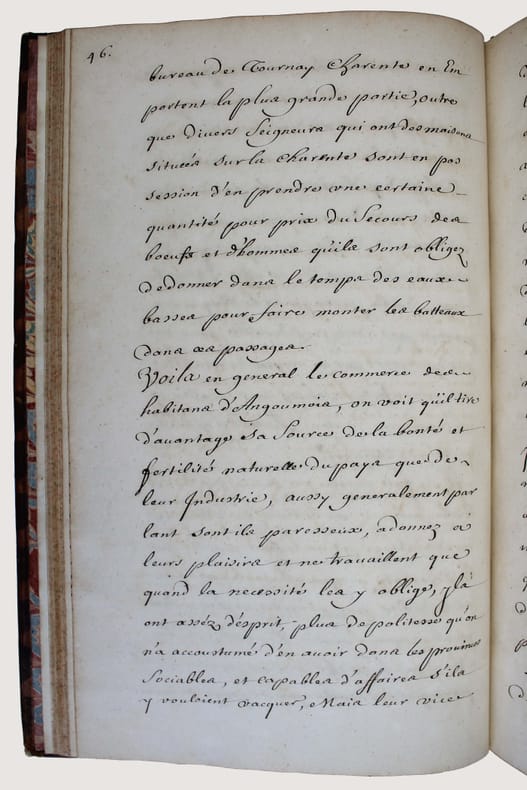 Manuscrit, d'une écriture lisible, d'un rapport établi par Louis de Bernage, intendant de la Généralité de Limoges à la suite de la demande faite dans toutes les provinces de France à la fin du XVIIe siècle, par le Duc de Beauvillier, pour l'instruction de son élève le Duc de Bourgogne, petit-fils de Louis XIV. L'enquête se déroula de 1697 à 1700 et avait pour but de présenter un tableau exact du royaume. Ce mémoire circulait sous forme manuscrite et rares sont les exemplaires qui nous sont parvenus. Cet important document fournit sur cette province à l'époque de Louis XIV un tableau des plus complets. Citons quelques phrases : - "Les habitants du bas Limousin, et principalement ceux de la ville de Tulle et des environs, sont désliés, insinuants, cachant sous des dehors plus nobles des inclinations, du moins aussi intéressés, mais plus sujets encore à leur vengeance qu'à leurs intérêts, accoutumés à former des brigues pour servir leur haine ..." Les habitants d'Angoumois sont "paresseux, adonnés à leurs plaisirs, et ne travaillant que quand la nécessité les y force, ils ont assez d'esprit, plus de politesse qu'on a accoutumé d'en avoir..." - "La manufacture des papiers est encore un des principaux commerces de cette province, et qui mérite le plus d'attention, car c'est celle du Royaume, même de l'Europe où se fait le plus beau et le meilleur papier." Seul un extrait de 23 pages de ce texte a été publié à Londres en 1727, dans l' "Etat de la france" de Boulainvillier. Puis, intégralement, en 1885 dans les "Documents historiques sur la Marche et le Limousin". Petits défauts à la relire. /// In-folio de (2), 197 pp. Veau marbré, dos à nerfs orné, tranches mouchetées. (Reliure de l'époque.) ////