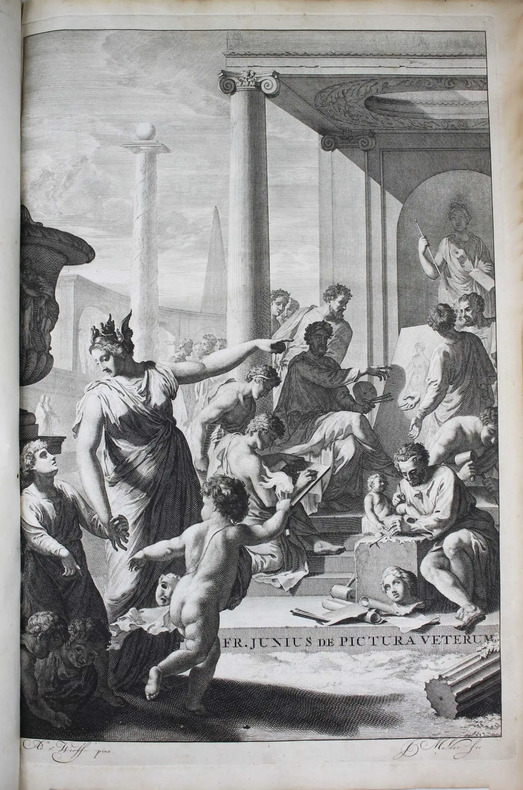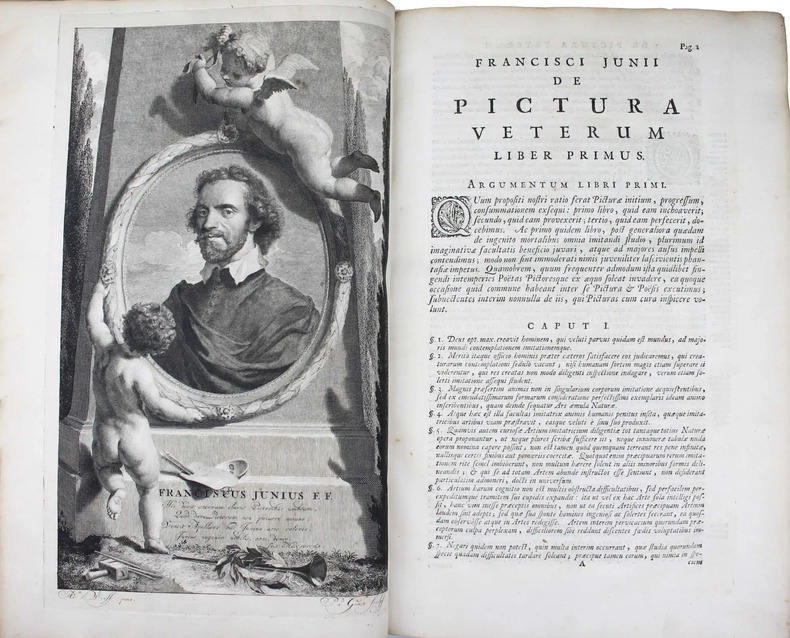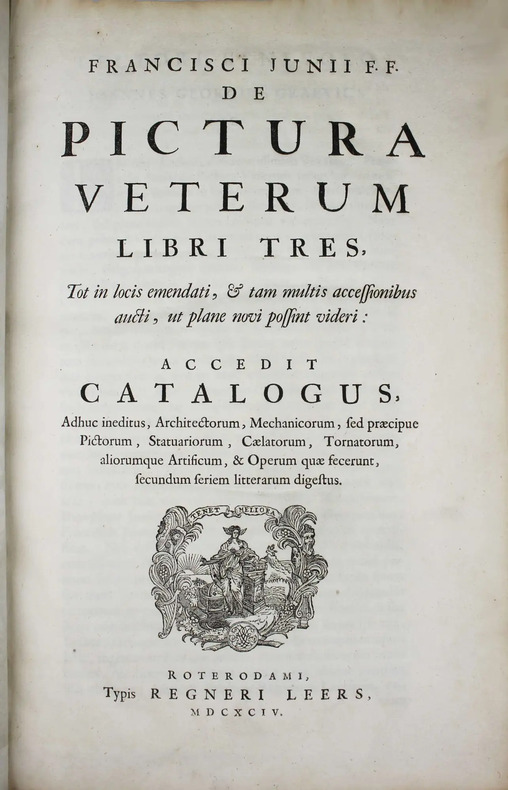 De l'art dans l'Antiquité. Junius juxtapose tous les passages connus des auteurs anciens concernant la peinture pour reconstituer, sans souci de chronologie, l'histoire de cet art et il élabore une théorie picturale qui prend en compte les facteurs psychologiques (livre I) et pédagogiques (livre II) de la création artistique, le troisième livre étudiant les 'parties de la peinture' dans une perspective rhétorique et poétique." (Colette Nativel). Tous les auteurs de traités sur l'art au XVIIe siècle, comme Fréart de Chambray, Roger de Piles, Félibien, ont étudié cette seconde édition et y ont fait de nombreux emprunts. C'est l'édition la plus complète, très différente de la première, avec une seconde partie inédite, un catalogue alphabétique des artistes - peintres, sculpteurs, architectes, ingénieurs - de l'Antiquité grecque et latine, avec ce que nous apprennent les textes anciens sur leurs oeuvres. La première édition de 1637, elle aussi posthume, était un petit in-4 de 318 pages. "Le modeste volume de 1637 est devenu un élégant ouvrage". Junius ou François Du Jon (Bourges, 1545-Leyde, 1602), philologue et professeur de théologie réformée, disciple de Calvin et de Théodore de Bèze, a laissé un grand nombre d'ouvrages, tous d'une très grande érudition. L'édition est illustrée d'un beau frontispice allégorique et d'un portrait de lauteur. La seconde partie, le Catalogus, a sa propre page de titre. Cette édition a été donnée par Johann Georg Graevius, à partir du manuscrit donné par la famille de Junius. Il n'avait pas réussi à trouver un éditeur qui accepte de se lancer dans une entreprise aussi couteuse. Fente en haut et en bas se la première charnière, petite découpe au coin dune garde. Très bel exemplaire en vélin hollandais de l'époque. Brunet III, 600 : "Bonne édition de cet ouvrage estimé." Colette Nativel, Le De pictura veterum (1694) de Franciscus Junius et les Académies, in Comptes rendus des séances de l'Académie des Inscriptions et Belles-Lettres, 2013. /// In-folio de (24), 296, (20), (32), 236, (16) pp. Vélin rigide, grand médaillon estampé au centre des plats, dos à nerfs. (Reliure de l'époque.) //// On art in Antiquity. Junius juxtaposes all the passages known to ancient authors concerning painting to reconstruct, without concern for chronology, the history of this art and he develops a pictorial theory which takes into account the psychological (Book I) and pedagogical (Book II) factors of artistic creation, the third book studying the 'parts of painting' in a rhetorical and poetic perspective". (C. Nativel). All the authors of treatises on art in the 17th century, such as Fréart de Chambray, Roger de Piles, Félibien, have studied this second edition and have borrowed from it on numerous occasions. It is the most complete edition, very different of the first, with a second unpublished part, an alphabetical catalogue of the artists - painters, sculptors, architects, engineers - of Greek and Latin Antiquity, with what the ancient texts tell us about their works. The first edition of 1637, also posthumous, was a small quarto of 318 pages. "The modest 1637 volume has become an elegant work." Junius or François Du Jon (Bourges, 1545-Leyden, 1602), philologist and professor of reformed theology, disciple of Calvin and Theodore de Bèze, left a large number of works, all of great erudition. The edition is illustrated with a beautiful allegorical frontispiece and a portrait of the author. The second part, the Catalogus, has its own title page. This edition was prepared by Johann Georg Graevius, based on the manuscript donated by Junius family. Junius had not been able to find a publisher willing to take on such an expensive volume. "An early work by a member or the circle of Rubens. According to Schlosser (A49) it is even today a rich source of antiquarian erudition." Artntzen H64. Small split at top and bottom of the the first hinge, a small cut-out at the corner of a guard. Very nice copy in contemporary Dutch vellum.