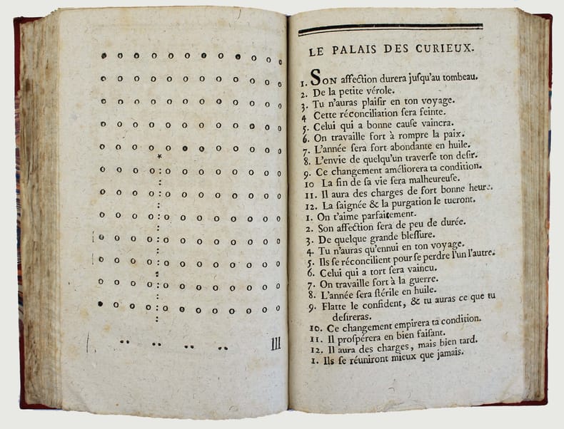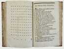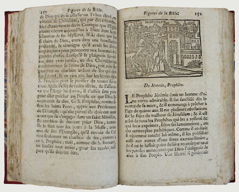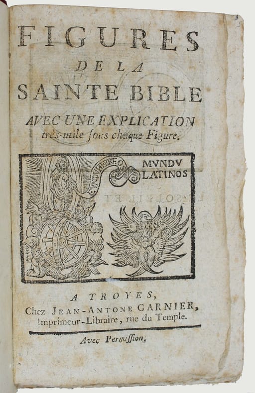 - Figures de la Sainte Bible, avec une explication très utile sous chaque figure. Troyes, Jean-Antoine Garnier, (entre 1765 et 1780). 166, (2) pp. Illustré par une gravure sur bois sur chaque feuillet, soit en tout 84 gravures. Comme toujours les bois sont usés et ont probablement été gravés pour des impressions du XVIe siècle. Le privilège à la fin de 1728, est donné à Pierre Garnier. Son fils, Jean-Antoine Garnier a exercé entre 1765 et 1780. - La grande Bible renouvellée ou Noëls nouveaux, où tous les mystères de la naissance & de l'enfance de Jesus-Christ son expliqués. Troyes, Jean-Antoine Garnier, (entre 1765 et 1780). 64 pp. - Vulson de La Colombière. Le palais des curieux, ou l'algèbre et le sort donnant la décision des questions les plus douteuses et où les songes & les visions nocturnes sont expliqués selon la doctrine des anciens. Troyes, Citoyenne Garnier, (entre 1795 et 1804). VII, (1), 151 pp. "Rare et curieux ouvrage. La partie qui traite des songes mérite d'être signalé. Ceux-ci classés suivant les quatre éléments, les trois règnes, les corps célestes, les phénomènes atmosphériques et les choses de l'Enfer, sont interprètés d'après les règles de l'analogie et du symbolisme." Dorbon 5219. Bon exemplaire. /// Petit in-8 de Demi-chagrin rouge, dos à nerfs orné. (Reliure du XIXe.) //// 3 chapbooks printed at Troyes.