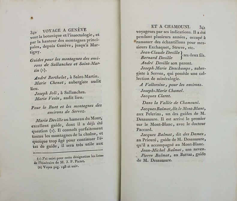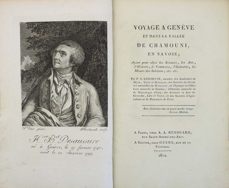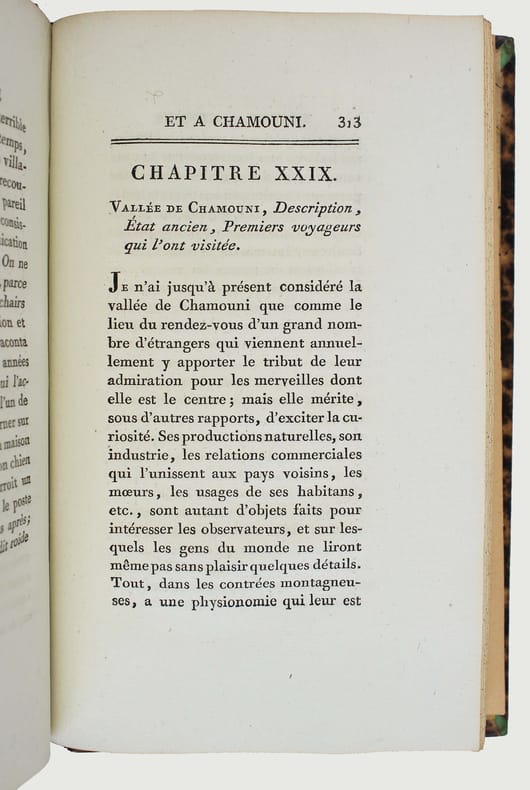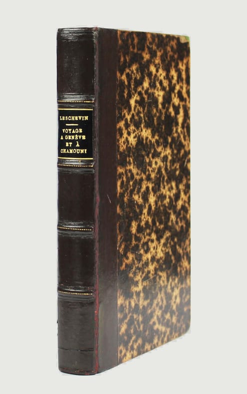 Première édition. Récit de voyage accompli en partie en compagnie de Bourrit, qui comporte des descriptions intéressantes sur la vie des habitants. Page 245, on trouve cité l'ouvrage de Paccard : "Premier voyage fait à la cime de la plus haute montagne du continent, 1786, in-8.", livre dont, malheureusement, il n'a jamais été publié que le prospectus. "Les appréciations (plutôt flatteuses) portées sur Bourrit sont du plus grand intérêt. Enfin, Leschevin est sans doute le premier voyageur à s'être intéressé aux inscriptions portées sur les registres à la disposition des voyageurs. L'ouvrage contient une bibliographie des livres relatifs au Mont-Blanc et à la vallée de Chamonix (61 notices). Très rare et recherché." Perret 2646. Bien complet du portrait gravé de Saussure en frontispice, d'après Saint-Ours. L'étiquette au dos du volume semble avoir été renouvellée. Bon exemplaire. /// In-12 de portrait, (6), 385 pp. Demi-basane brune, dos à nerfs. (Reliure de la seconde moitié du XIXe.) //// /// PLUS DE PHOTOS SUR WWW.LATUDE.NET