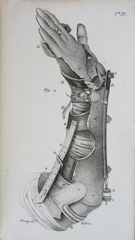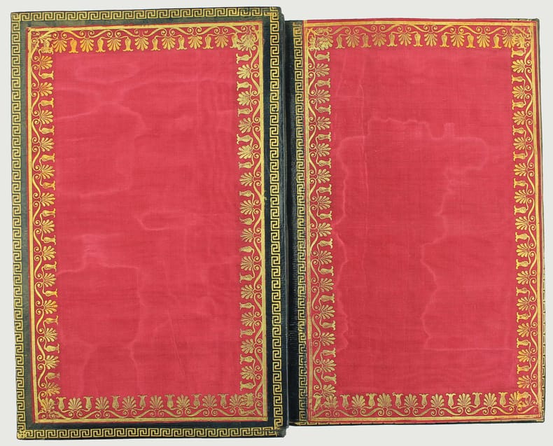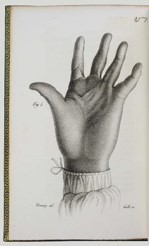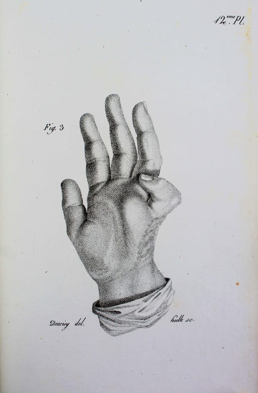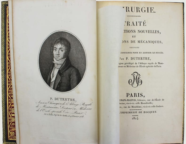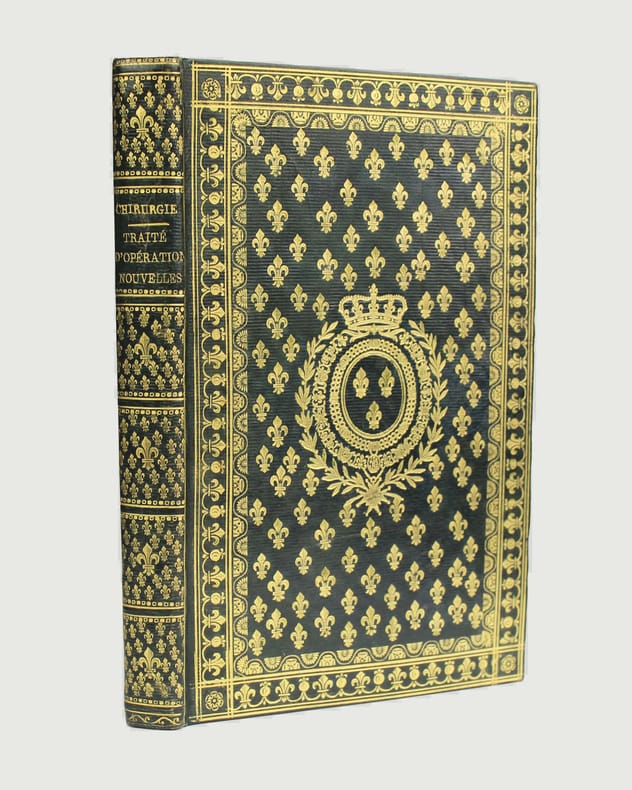 Première édition. C'est le premier livre exclusivement consacré à la chirurgie de la main. Dans sa dédicace à Louis XVIII, Pierre Dutertre déclare que son "ouvrage n'est, à la vérité, qu'un simple recueil d'opérations chirurgicales, mais elles ont été couronnées de succès. Quelques-unes n'avaient pas encore été tentées, et m'ont fait obtenir en 1798 le prix démulation de la Société de médecine de Paris. Les appareils sont de mon invention. Par les moyens que j'ai combinés, des malheureux que différents accidents avaient privés de l'exercice de leurs mains, en ont recouvrés l'usage." Illustré d'un portrait et de 21 jolies planches en lithographie. Né en 1758, Pierre Dutertre a été reçu docteur à Paris en 1805 et a été chirurgien de lAbbaye royale de Montmartre. Exemplaire sur grand papier de dédicace au roi Louis XVIII. Il est relié dans une somptueuse reliure aux chiffres et armes du roi. Exemplaire d'une étonnante fraicheur. /// In-8 de portrait, 85 pp., 21 planches h.-t. Maroquin bleu, dos à nerfs orné, plats ornés d'un semis de fleur de lys avec au centre les armes du Roi, encadrements dorés, tranches dorées, gardes de tabis rouge. (Reliure de l'époque.) //// First edition. This is the first book devoted exclusively to hand surgery. In his dedication to the King, Pierre Dutertre declares that his "work is, in truth, a simple collection of surgical operations, but they have been crowned with success. Some of them had not yet been undertaken, and in 1798 I was awarded the Prix d'Emulation by the Société de Médecine de Paris. The apparatus is my own invention. By the means I have combined, unfortunate people who had been deprived by various accidents of the exercise of their hands, have recovered the use of them." Illustrated with a portrait and 21 attractive lithograph plates. Born in 1758, Pierre Dutertre received his doctorate in Paris in 1805 and was surgeon at the Royal Abbey of Montmartre. Large paper dedication copy to French King Louis XVIII. It is bound in a sumptuous binding with the king's coat of arms. An astonishingly fresh copy.