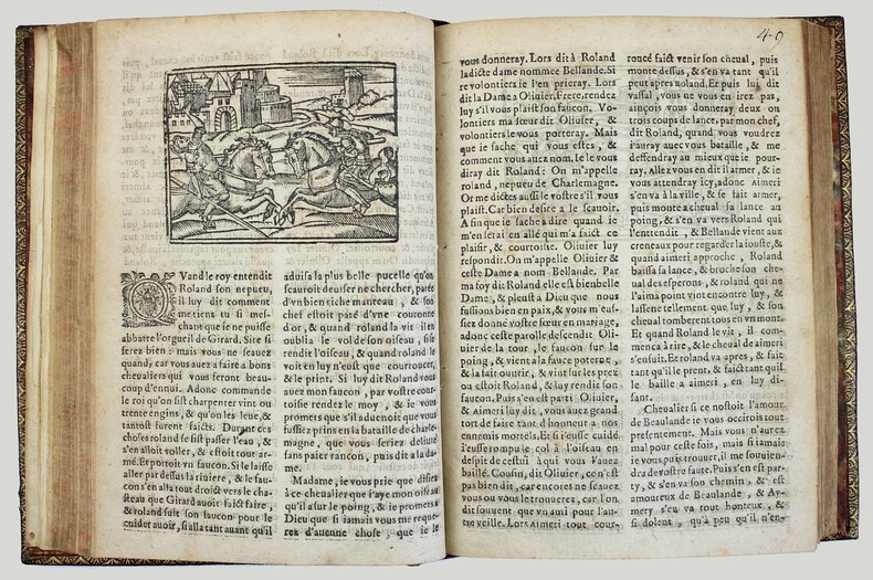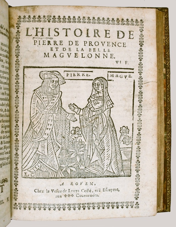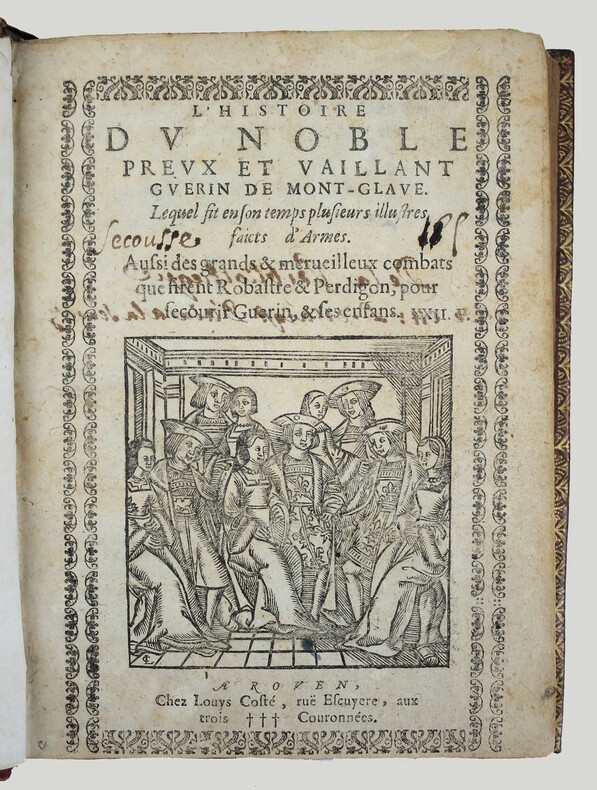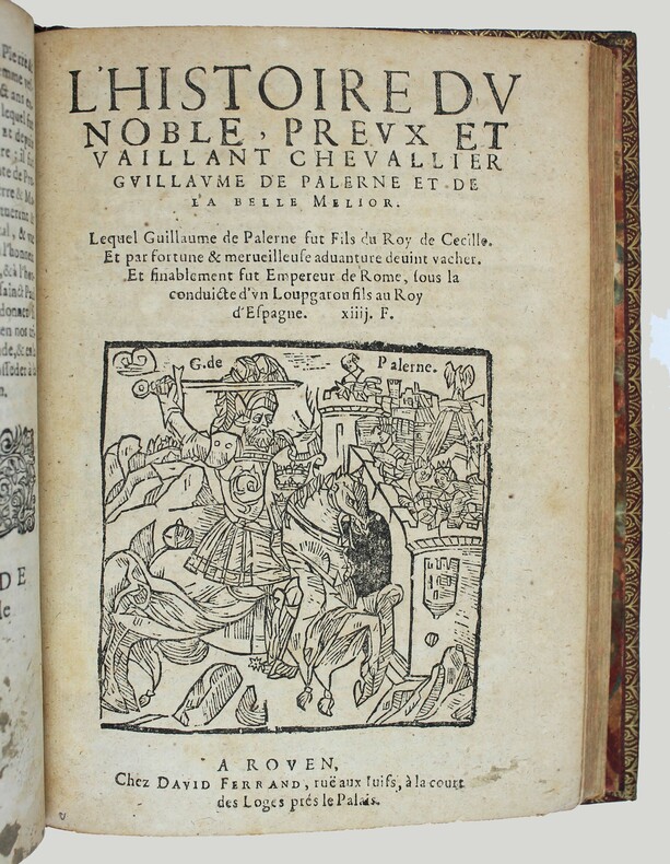Trois éditions rarissimes : - Histoire du noble, preux et vaillant Guerin de Mont-Glave. Lequel fit en son temps plusieurs illustres faicts d'armes. Aussi des grands & merveilleux combats qui firent Robastre & Perdigon pour secourir Guerin & ses enfans. Rouen, Louys Costé, 1626. In-4 de (176) pp. [A-Y8]. Illustré par 7 gravures sur bois. Comme souvent dans les imprimeries provinciales, ses gravures proviennent d'un vieux stock de bois de libraires parisiens (ou lyonnais) du XVIe siècle. Celui sur le feuillet O2 date probablement du XVe siècle. Il est monogrammé RLP. Seul exemplaire connu de ce roman de chevalerie. Aucun exemplaire dans les catalogues BNF, Ccfr, Worldcat. - L'histoire de Pierre de Provence et de la belle Maguelonne. Rouen, Veuve de Louys Costé, (vers 1634). In-4 de (48) pp. [A-F4]. Illustré par une gravure sur bois sur le titre du XVe ou du début du XVIe siècle monogrammée LC. Aucun exemplaire dans les catalogues BNF et le Ccfr. Un exemplaire dans le Worlcat : Queen's University Belfast ("copy has suffered damage by fire"). La veuve de Louys Costé a été active de 1632 à 1677. - L'histoire du noble, preux et vaillant chevallier Guillaume de Palerme et de la belle Melior. Lequel Guillaume de Palerme fut fils du roy de Cecille, et par fortune et merveilleuse adventure devint vacher. Et finalement fut empereur de Rome sous la conduicte d'un loupgarou fils au Roy d'Espaigne. Rouen, David Ferrand, (vers 1634 ?). In-4 de (104) pp. [A-O4] Avec une gravure sur bois d'un bloc du XVe siècle sur titre. Seul exemplaire connu. Aucun exemplaire dans les catalogues BNF, Ccfr, Worldcat. La BNF possède une édition de ce roman à Rouen par la Veuve de Louys Costé, daté par la BNF vers 1634, différente de celle-ci par son illustration. Le texte a été entièrement recomposé (avec beaucoup de coquilles dans les deux éditions !) mais le matériel typographique semble identique. Peut-être s'agit-il d'une impression de la veuve de Louys Costé pour le compte de David Ferrand. Le libraire David Ferrand, qui était aussi poète, exerça de 1615 à 1660. Provenances - Secousse (inscription sur le titre). - Victor-Amédée de Seyssel, marquis d'Aix (1679-1754) ("De la bibliothèque de Mr le Marq.s d'Aix, à la Serraz" , inscription au verso du titre). - Ambroise Firmin-Didot (figure au catalogue de 1881, n° 397). Un trou (2 x 1 cm) sur le dernier feuillet de l'histoire de Pierre de Provence et deux petits manques au coin supérieur des deux premiers feuillets. Probablement vendus par colportage, ces livres populaires apparaissent comme des précurseurs de la Bibliothèque bleue. Ces "vieux romans" n'étaient plus imprimés à Paris et quelques imprimeurs de Normandie se sont attachés à ce marché populaire qui sera repris par les imprimeurs de Troie. Nous devons la survie des ces ouvrages aux grands bibliophiles du XVIIe, comme ceux du XVIIIe et XIXe, qui les ont collectionnés et fait relier. Très bel exemplaire réunissant trois éditions rarissimes. /// de Maroquin rouge, dos à nerfs orné, encadrements dorés sur les plats avec fleurons aux angles, tranches dorées. (Reliure de la fin du XVIIe.) //// Three extremely rare editions of chivalric romances printed in Rouen in the 17th century. - Histoire du noble, preux et vaillant Guerin de Mont-Glave. Lequel fit en son temps plusieurs illustres faicts d'armes. Aussi des grands & merveilleux combats qui firent Robastre & Perdigon pour secourir Guerin & ses enfans. Rouen, Louys Costé, 1626. In-4 of (176) pp. [A-Y8]. Illustrated with 7 woodcuts. As is often the case in provincial printing, these engravings come from an old stock of 16th-century Parisian (or Lyonnais) booksellers' woodcuts. The one on folio O2 probably dates from the 15th century. It is monogrammed RLP. The only known copy of this chivalric novel. No copies in BNF, Ccfr or Worldcat catalogs. - L'histoire de Pierre de Provence et de la belle Maguelonne. Rouen, Veuve de Louys Costé, (circa 1634). In-4, (48) pp [A-F4]. Illustrated with a 15th or early 16th-century woodcut on the title, monogrammed LC.No copy in the BNF and Ccfr catalogs. One copy in the Worlcat: Queen's University Belfast ("copy has suffered damage by fire").The widow of Louys Costé was active from 1632 to 1677. - - L'histoire du noble, preux et vaillant chevallier Guillaume de Palerme et de la belle Melior. Lequel Guillaume de Palerme fut fils du roy de Cecille, et par fortune et merveilleuse adventure devint vacher. Et finalement fut empereur de Rome sous la conduicte d'un loupgarou fils au Roy d'Espaigne. Rouen, David Ferrand, (circa 1634 ?). In-4, (104) pp. [A-O4]. With a woodcut of a 15th-century block on the title. Only known copy. No copies in BNF, Ccfr, Worldcat catalogs. The BNF owns an edition of this novel published in Rouen by the Veuve de Louys Costé, dated by the BNF around 1634, which differs from this one in its illustration.The text has been entirely recomposed (with many misprint in both editions!) but the typographic material appears identical. Perhaps it was printed by Louys Costé's widow on behalf of David Ferrand. The bookseller David Ferrand, who was also a poet, practiced from 1615 to 1660. Provenances - Secousse (inscription on title). - Victor-Amédée de Seyssel, Marquis d'Aix (1679-1754) ("De la bibliothèque de Mr le Marq.s d'Aix, à la Serraz", inscription on verso of title). - Ambroise Firmin-Didot (listed in the 1881 catalog, no. 397). A hole (2 x 1 cm) on the last leaf of the histoire de Pierre de Provence and two small chips at the top corner of the first two leaves. Probably sold by peddlers, these chapbooks appear to be precursors of the Bibliothèque bleue. These "old novels" were no longer printed in Paris, and a few printers in Normandy took on this popular market, which was later taken over by the printers of Troy. We owe the survival of these works to the great bibliophiles of the 17th, 18th and 19th centuries, who collected them and had them boun