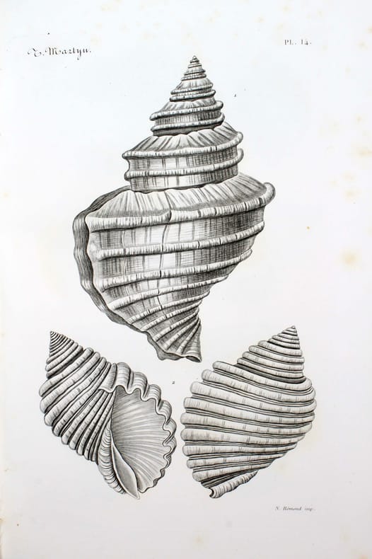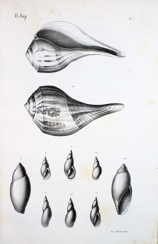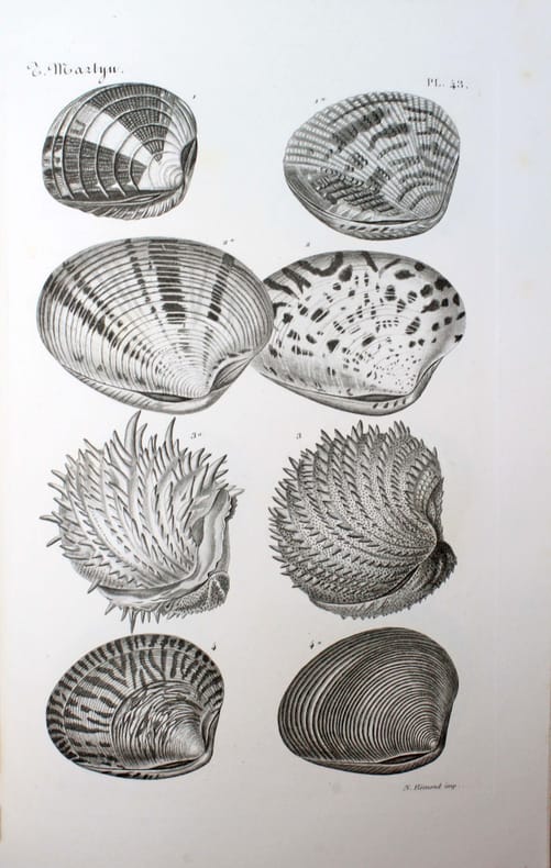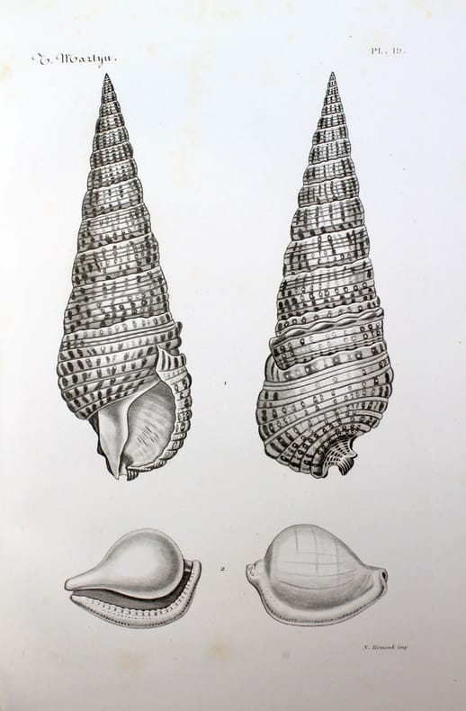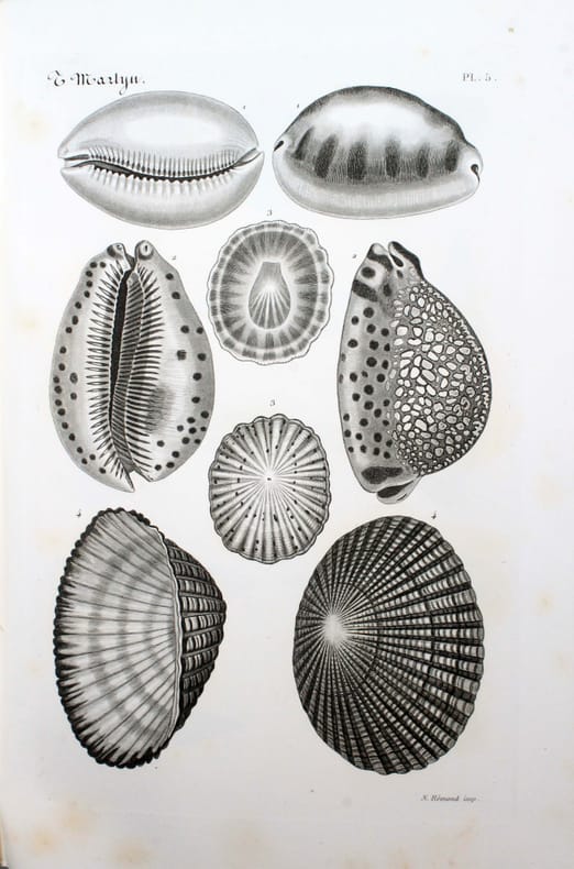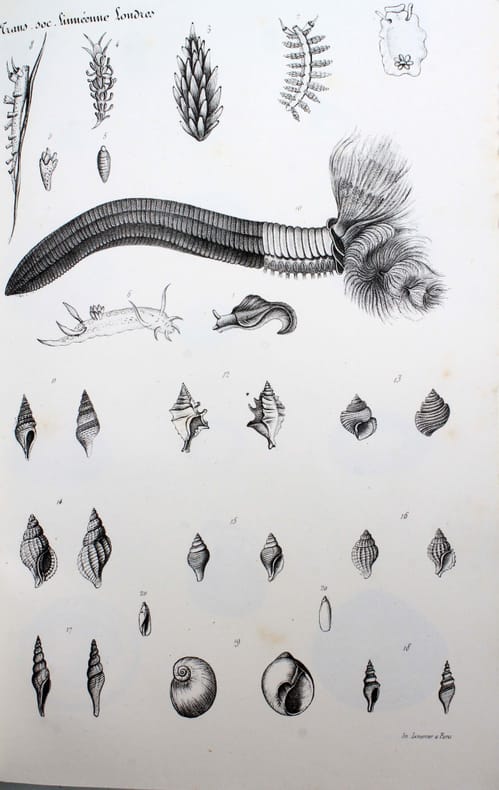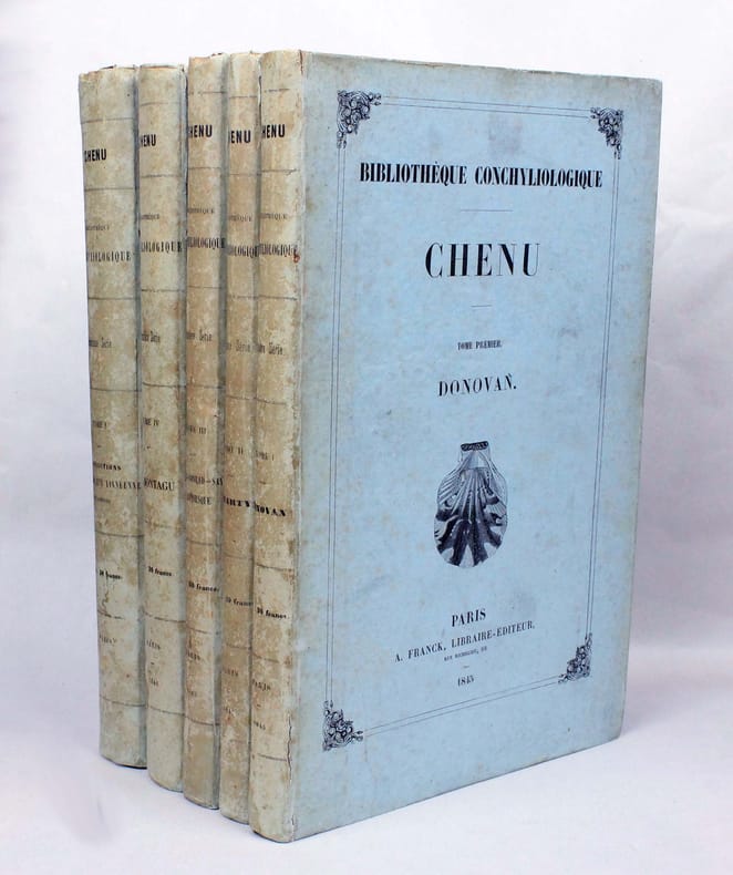 Illustré au total par 195 planches lithographiques hors-texte. Traductions françaises par J. C. Chenu de publications conchyliologiques importantes de langue anglaise. Contient : - 8 pp. d'introduction - DONOVAN, E. Histoire naturelle des coquilles d'Angleterre comprenant la figure et la description de toutes les espèces découvertes jusqu'ici dans ce pays, classées d'après le système de Linné. Paris, Franck, 1845. 127, (1) pp., 48 planches. - MARTYN, Thomas. Le conchyliologiste universel ou figures des coquilles jusqu'à présent inconnues recueillies en divers voyages à la mer du sud depuis l'année 1764. Paris, Franck, 1845. 32 pp., 56 planches. - SAY, Th. Conchyliologie américaine ou descriptions et figures des coquilles du nord de l'Amérique. Paris, Franck, 1845. 64 pp., 17 planches. - LEACH, W. E. Mélanges zoologiques. Paris, Franck, 1845. 23, (1) pp., 9 planches. - CONRAD, T. A. Nouvelles coquilles d'eau douce des Etats-Unis. Paris, Franck, 1845. 33, (3) pp., 4 planches. - RAFFINESQUE, M. C. S. Monographie des coquilles bivalves fluviatiles de la rivière Ohio. Paris, Franck, 1845. 30, (2) pp., 4 planches. - MONTAGU. Testacea Britannica ou histoire naturelle des coquilles marines, fluviatiles et terrestres d'Angleterre. 1846. (4), XIX, (1), 364 pp., 14 planches. - TRANSACTIONS de la Société Linnéenne de Londres. Partie Conchyliologique. 1845. VIII, 376 pp., 43 planches. Tout ce qui a paru de cette belle publication, fort bien illustrée. Exemplaire frais en cartonnage de l'éditeur. /// 5 volumes in-4 de Cartonnage imprimé de l'éditeur. //// Illustrated with a total of 195 lithographic plates out of text. French translations by J. C. Chenu of important English-language conchyliological publications. Contains: - 8 pp. introduction - DONOVAN, E. Histoire naturelle des coquilles d'Angleterre comprenant la figure et la description de toutes les espèces découvertes jusqu'ici dans ce pays, classées d'après le système de Linné. Paris, Franck, 1845. 127, (1) pp. 48 plates. - MARTYN, Thomas. Le conchyliologiste universel ou figures des coquilles jusqu'à présent inconnues recueillies en divers voyages à la mer du sud depuis l'année 1764. Paris, Franck, 1845. 32 pp. 56 plates. - SAY, Th. Conchyliologie américaine ou descriptions et figures des coquilles du nord de l'Amérique. Paris, Franck, 1845. 64 pp. 17 plates. - LEACH, W. E. Mélanges zoologiques. Paris, Franck, 1845. 23, (1) pp. 9 plates. - CONRAD, T. A. Nouvelles coquilles d'eau douce des Etats-Unis. Paris, Franck, 1845. 33, (3) pp. 4 plates. - RAFFINESQUE, M. C. S. Monographie des coquilles bivalves fluviatiles de la rivière Ohio. Paris, Franck, 1845. 30, (2) pp. 4 plates. - MONTAGU. Testacea Britannica ou histoire naturelle des coquilles marines, fluviatiles et terrestres d'Angleterre. 1846. (4), XIX, (1), 364 pp., 14 plates. - TRANSACTIONS of the Linnaean Society of London. Conchyliological part. 1845. VIII, 376 pp. 43 plates. All that has been published of this fine, well-illustrated publication. Fresh copy in publisher's printed boards. /// PLUS DE PHOTOS SUR WWW.LATUDE.NET