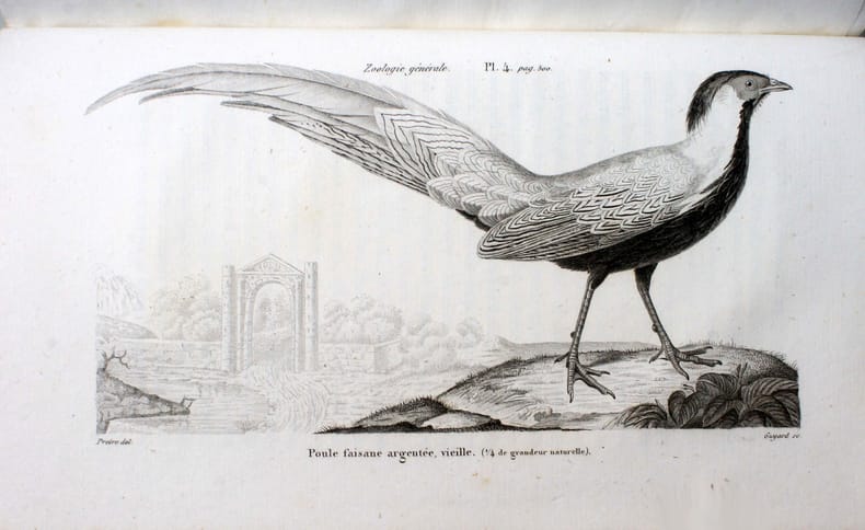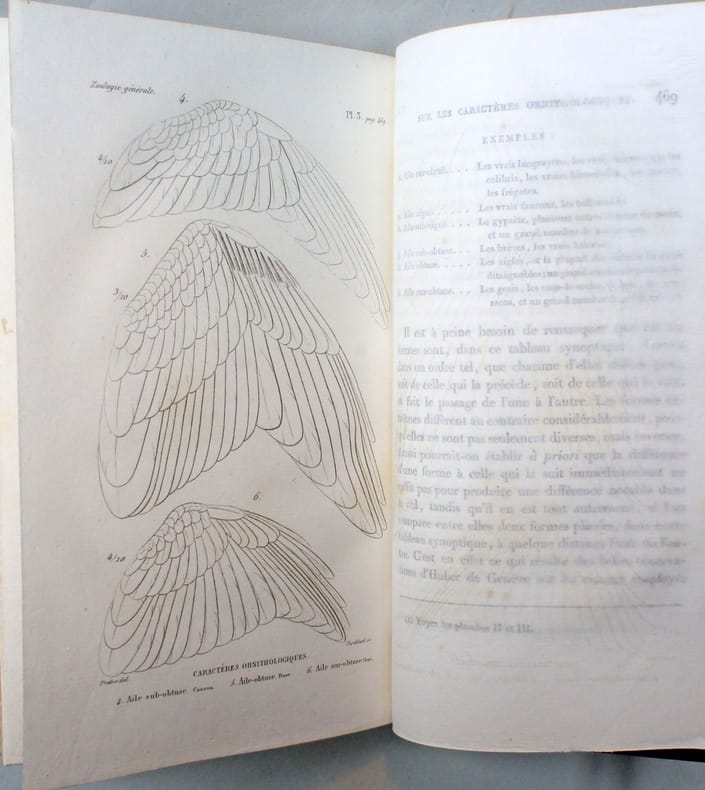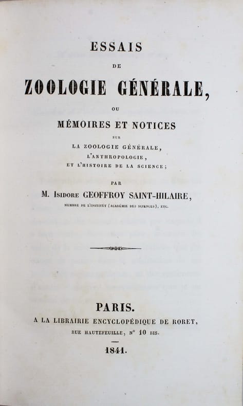 Nissen, ZBI, 1527. Engelmann, I, 326. British Museum (Natural History), II, 657. DSB, V, 358-360. Édition originale, illustrée de 8 planches gravées par Guyard et Pardinel, d’après les dessins de Prêtre. L’ouvrage est divisé en deux parties. La première contient 7 mémoires d’histoire des sciences : Considérations historiques sur la zoologie. Additions aux considérations historiques (avec deux chapitres consacrés à l’unité de composition organique). Sur les naturalistes compilateurs du XVIe et du XVIIe siècle. Des travaux de Linné. Sur le règne animal de Cuvier. Sur les travaux zoologiques et anatomiques de Goethe. Considérations historiques sur la tératologie. La seconde partie renferme 8 mémoires de zoologie et d’anthropologie : De la possibilité d’éclairer l’histoire naturelle de l’homme par l’étude des animaux domestiques. De la domestication des animaux. De la domestication des solipèdes (les chevaux) restés encore sauvages. Recherches zoologiques et physiologiques sur les variations de la taille chez les animaux et dans les races humaines (deux mémoires). Fragments sur la zoologie géographique. Considérations sur les caractères employés en ornithologie pour la distinction des genres, des familles et des ordres. Sur les mues chez les animaux. Membre de l’Académie des sciences et docteur en médecine, Isidore Geoffroy Saint-Hilaire succéda à son père en 1841 comme titulaire de la chaire de zoologie (mammifères et oiseaux) du Muséum d’histoire naturelle de Paris. Partisan d’un transformisme limité, ses recherches s'étendirent à la domestication des animaux, à la tératologie ou étude des monstres, à la variabilité héréditaire ainsi qu’à l’hybridation des mammifères et des oiseaux. Il fut aussi le premier à utiliser le terme d'éthologie pour désigner l'étude du comportement animal (cf. Brygoo & Jaussaud, Du Jardin au Muséum en 516 biographies, pp. 246-247)