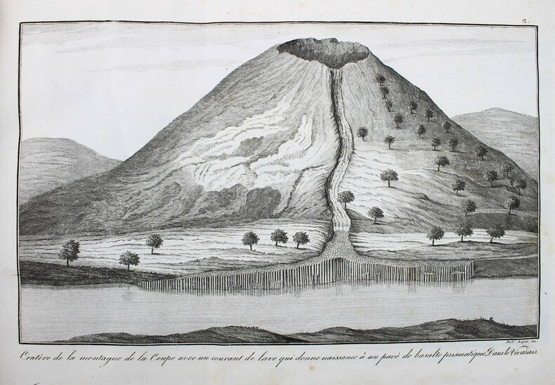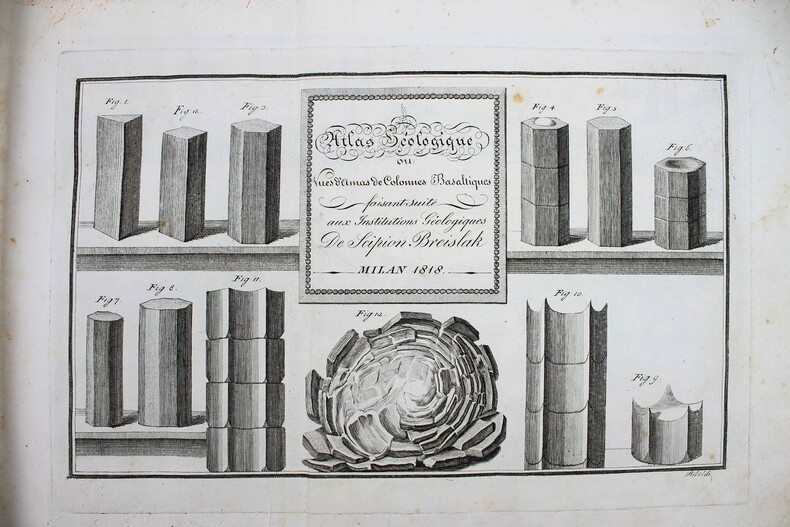 Première édition. Cet atlas contient un avis au lecteur, un titre illustré et 55 planches. Il est complet. Ces planches sont très belles et spectaculaires. L'atlas a été publié en complément des "Institutions géologiques" de Breislak (1818). Mais comme on trouve très souvent cet atlas seul, il est plus que probable qu'il se vendait séparément. Le géologue italien Scipione Breislak fut l'un des premiers à se convertir au vulcanisme. "La fascination de Breislak pour le basalte l'a conduit à publier en 1818 un atlas géologique contenant 53 vues de formations basaltiques, de la Chaussée des Géants en Irlande à la grotte de Fingal dans les Hébrides écossaises, en passant par le Vivarais en France et les collines euganéennes de la Vénétie". On y trouve aussi 4 planches de vues de l'île de Bourbon (La Réunion). Reliure un peu frottée. /// In-4 oblong de (1) f. d'avis, 1 titre gravé, 55 planches gravées. Demi-basane, dos orné. (Reliure de l'époque.) //// First edition. This atlas contains a note to the reader, an illustrated title and 55 plates. It is complete. The plates are beautiful and spectacular. This atlas was published as an addition to Breislak's Institutions géologiques (1818). But as it is very often found on its own, it is more than likely that it was sold separately. The Italian geologist Scipione Breislak was an early convert to vulcanism. "Breislak's fascination with basalt led him to publish a geological atlas in 1818 that contained 53 views of basalt formations, from the Giants Causeway in Ireland to Fingal's Cave in the Scottish Hebrides to the Vivarais in France to the Euganean hills in the Veneto of Italy." (W. Ashworth, Linda Hall Library). Binding slightly worn. /// PLUS DE PHOTOS SUR WWW.LATUDE.NET