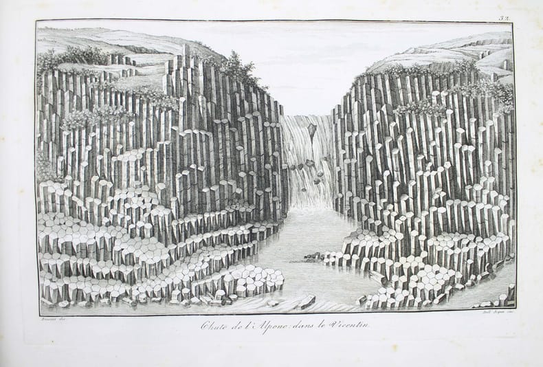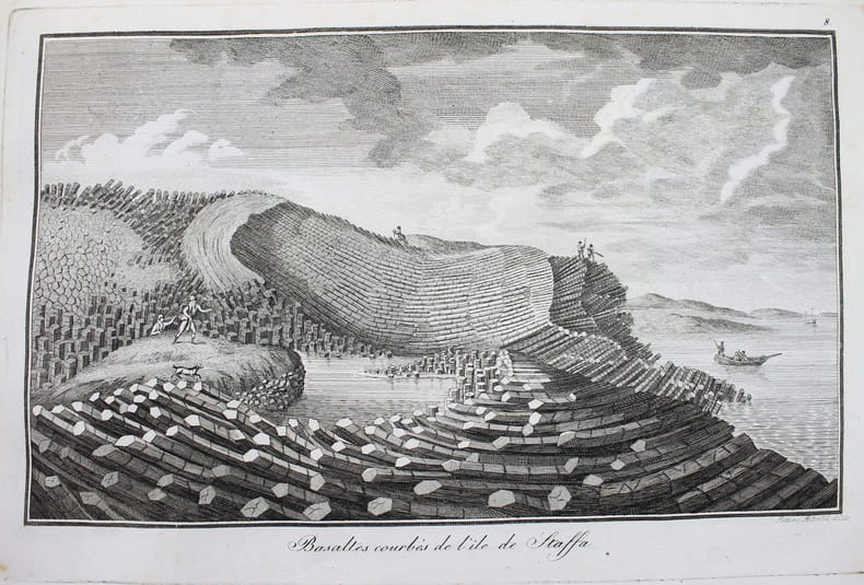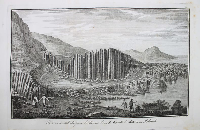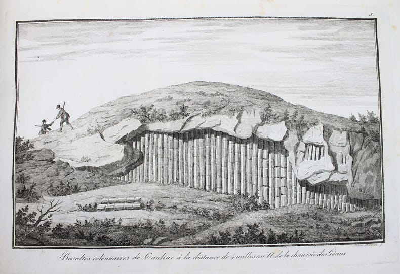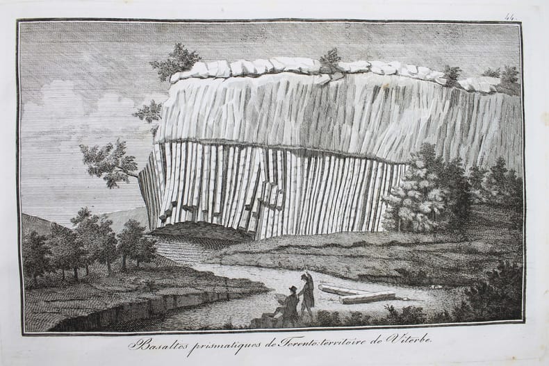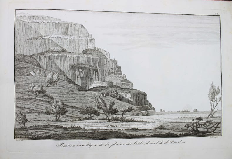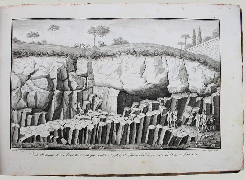 Première édition. Cet atlas contient un avis au lecteur, un titre illustré et 55 planches. Il est complet. Ces planches sont très belles et spectaculaires. L'atlas a été publié en complément des "Institutions géologiques" de Breislak (1818). Mais comme on trouve très souvent cet atlas seul, il est plus que probable qu'il se vendait séparément. Le géologue italien Scipione Breislak fut l'un des premiers à se convertir au vulcanisme. "La fascination de Breislak pour le basalte l'a conduit à publier en 1818 un atlas géologique contenant 53 vues de formations basaltiques, de la Chaussée des Géants en Irlande à la grotte de Fingal dans les Hébrides écossaises, en passant par le Vivarais en France et les collines euganéennes de la Vénétie". On y trouve aussi 4 planches de vues de l'île de Bourbon (La Réunion). Reliure un peu frottée. /// In-4 oblong de (1) f. d'avis, 1 titre gravé, 55 planches gravées. Demi-basane, dos orné. (Reliure de l'époque.) //// First edition. This atlas contains a note to the reader, an illustrated title and 55 plates. It is complete. The plates are beautiful and spectacular. This atlas was published as an addition to Breislak's Institutions géologiques (1818). But as it is very often found on its own, it is more than likely that it was sold separately. The Italian geologist Scipione Breislak was an early convert to vulcanism. "Breislak's fascination with basalt led him to publish a geological atlas in 1818 that contained 53 views of basalt formations, from the Giants Causeway in Ireland to Fingal's Cave in the Scottish Hebrides to the Vivarais in France to the Euganean hills in the Veneto of Italy." (W. Ashworth, Linda Hall Library). Binding slightly worn.