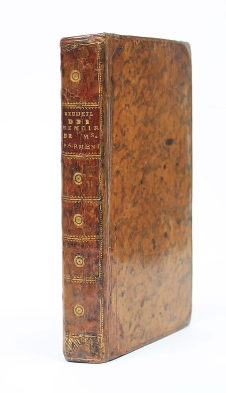 EXEMPLAIRE DE PARMENTIER avec son ex-libris manuscrit sur le premier feuillet blanc : "A. A. Parmentier". Première édition du premier livre de Parmentier, alors Apothicaire Major des Invalides. Il y examine de nombreuses plantes dont il est facile d'extraire de l'amidon, substance d'un grand intérêt nutritif que l'on trouve dans les céréales. Il passe en revue le marron d'inde, le gland du chêne, les racines de bryone, de glaïeul, de chiendent, ... toutes plantes qui ne sont pas cultivées. Il parle de ces expérience qui montre que la fécule de la pomme de terre est de l'amidon (pp. 19-21). Ce mémoire de l'Académie de Besançon est très rare. On trouve plus souvent sa refonte, publiée en 1781 sous le titre de "Recherches sur les végétaux nourrissans", cité dans "En francais dans le texte", n° 173. On trouve relié aussi dans ce volume trois autres ouvrages de Parmentier : - Avis aux bonnes ménagères des villes et des campagnes, sur la meilleure manière de faire leur pain. Nouvelle édition, revue et corrigée. Londres, Paris, Barrois, 1782. 95, (1) pp. - Méthode facile de conserver à peu de frais les grains et les farines. Londres, Paris, Barrois, 1784. IV, 100 pp. - Moyen proposé pour perfectionner promptement dans le royaume la meunerie et la boulangerie. Paris, Barrois l'Aîné, 1783. 93, (1) pp. Quelques restaurations au dos de la reliure. Bon exemplaire. /// In-12 de 87 pp. Veau marbré, dos orné, tranches rouges. (Reliure de l'époque.) //// PARMENTIER's COPY with his handwritten ex-libris on the first blank page: "A. A. Parmentier. First edition of the first book of Parmentier, then Apothicaire Major des Invalides. In it, he examines numerous plants from which it is easy to extract starch, a substance of great nutritional interest found in cereals. He reviews horse chestnut, oak acorn, bryony root, gladiolus, couch grass... all plants that are not cultivated. He discusses experiments showing that potato flour is starch (pp. 19-21). This memoir by the Académie de Besançon is very rare. Its revised version, published in 1781 under the title "Recherches sur les végétaux nourrissans", quoted in "En francais dans le texte", no. 173, is more common. Also bound in this volume are three other works by Parmentier: - Avis aux bonnes ménagères des villes et des campagnes, sur la meilleure manière de faire leur pain. Nouvelle édition, revue et corrigée. London, Paris, Barrois, 1782. 95, (1) pp. - Méthode facile de conserver à peu de frais les grains et les farines. London, Paris, Barrois, 1784. IV, 100 pp. - Moyen proposé pour perfectionner promptement dans le royaume la meunerie et la boulangerie. Paris, Barrois l'Aîné, 1783. 93, (1) pp. Some restorations to the spine. A fine copy.