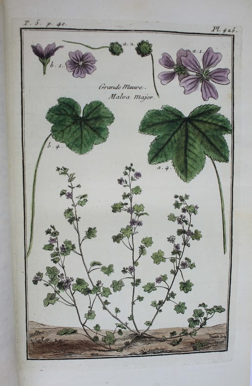 Très belle illustration comprenant un frontispice et 782 planches, toutes coloriées à l'époque, ce qui est rare. Les planches ont été dessinées par Garsault, Ingouf, de Fehrt et pour la plupart gravées par Martinet. François-Nicolas Martinet est renommé pour ses gravures d'histoire naturelle, et notamment celles de l'Histoire naturelle des oiseaux de Buffon. Ces planches montrent les végétaux, les animaux et les minéraux qui entrent dans la composition des médicaments. C'est une reprise du "Dictionnaire raisonné universel de matiére médicale" publié en 1773 en quatre volumes, avec quelques modifications, notamment l'ajout d'une "Table suivant le système de Charles Linné." Ce livre est très rarement complet. Nous n'en n'avons pas trouvé d'autre exemplaire décrit avec 782 planches. Nissen BBI 2238 ne donne que 776 planches. L'essentiel de la rédaction de ce dictionnaire est l'oeuvre de Jean Goulin (1728-1799). Ce savant fort modeste a passé la plus grande partie de sa vie à écrire des ouvrages, on en compte 68, que d'autres se sont attribués. Il enseigna l'histoire de la médecine à la Faculté de Paris. Très bel exemplaire, d'une grande fraicheur. Davy de Virville, Histoire de la botanique en France p. 103. Provenance : ex libris héraldique du vicomte Léopold d'Hunolstein (1830-1903). /// 8 volumes in-8 de frontispice, (2), 2, 428 pp., 69 pl. / (2), 351 pp., 134 pl. / (2), 361 pp. 100 pl. / (2), 320 pp., 121 pl. / (2), 354 pp., 105 pl. / (2), 322 pp., 113 pl. / (2), 347 pp., 118 pl. / (2), 437 pp., 22 pl. Demi-maroquin rouge, dos orné, tranches jaunes. (Reliure de l'époque.) //// A beautiful illustration containing one frontispiece and 782 plates, all contemporary colored which is rare. The plates were drawn by Garsault, Ingouf, de Fehrt, and for the most part engraved by Martinet. François-Nicolas Martinet is famous for his natural history engravings, particularly those in Buffon's Natural History of Birds. These plates depicts plants, animals, and minerals used in the composition of medicines. It is a reissue of the Dictionnaire raisonné universel de matiére médicale published in 1773 in four volumes, with a few modifications, notably the addition of a Table following the system of Charles Linnaeus. Complete copies of this book are very rare. We have not found another copy described with 782 plates. Nissen BBI 2238 lists only 776 plates. Jean Goulin (1728-1799) wrote most of the content of this dictionary. This very modest scholar spent most of his life writing books, 68 in total, which others have claimed as their own. He taught the history of medicine at the Faculty of Paris. A very fine copy, in excellent condition. Davy de Virville, Histoire de la botanique en France, p. 103. Provenance: Viscount Léopold d'Hunolstein (1830-1903) (heraldic bookplate).