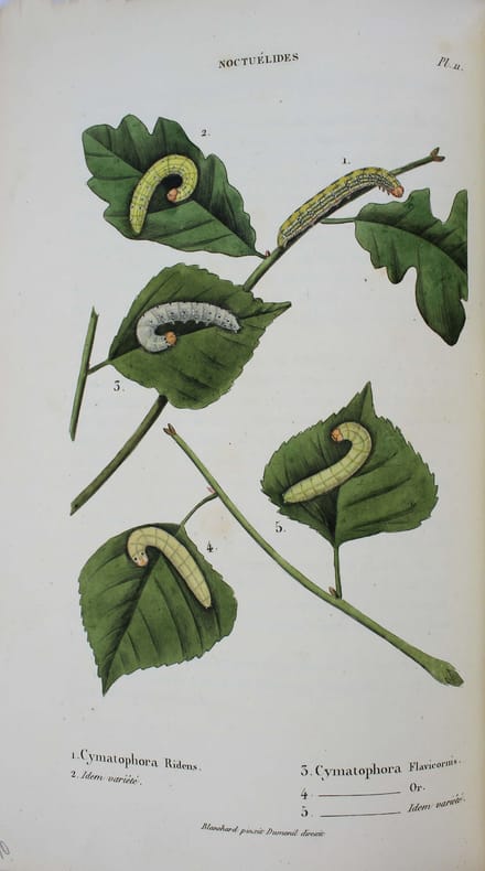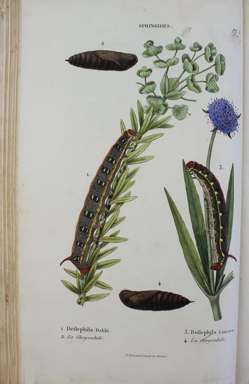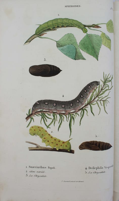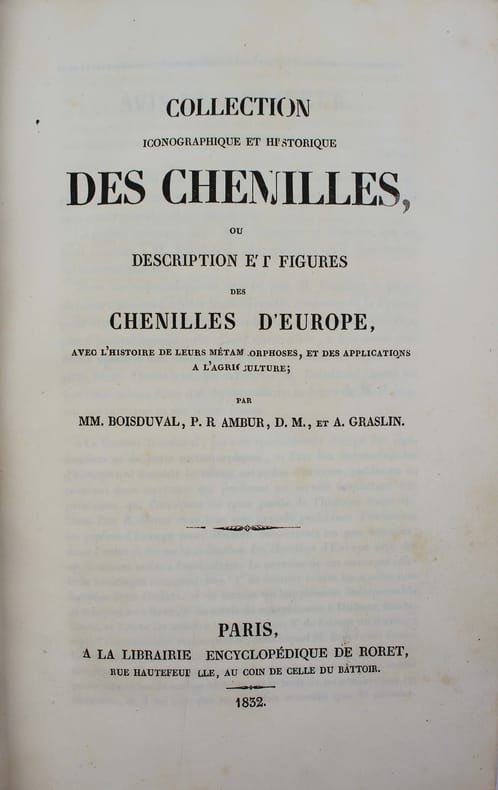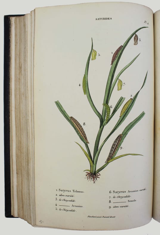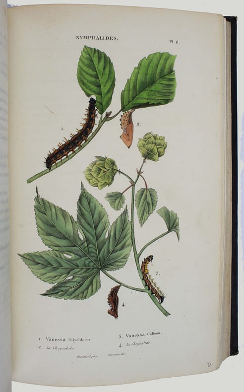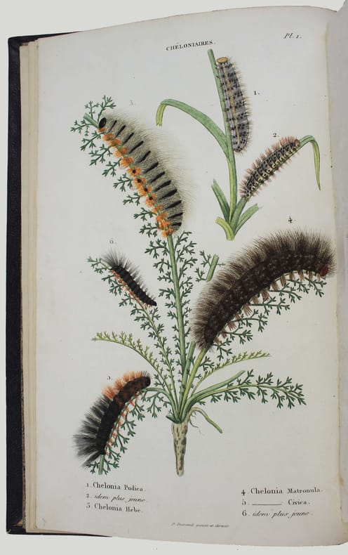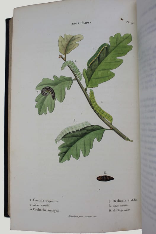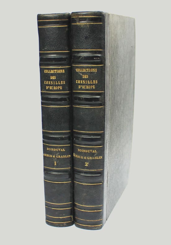 Seule édition. Illustré par 126 planches couleur hors-texte de chenilles par Blanchard, Daube, Graslin. Les planches ont été dessinées d'après nature et sont extrêmement fidèles. Toutes ont été délicatement coloriées au pinceau et gommées à l'époque. Publié en 42 livraisons pendant 6 ans l'ouvrage est très rare. Papillonides - Lycenides - Nymphalides - Libytides- Satyrides -Hesperides- Sphingides - Zygenides - Cheloniaires -Bombycines - Psychides - Pseudobombycines - Noctuelides - Bombycoides - Plusides- Heliothides - Catocalides - Noctuophalenides - Geometres. Papier des planches parfois bruni, sans gravité. Bon exemplaire. /// In-8 de 14, (482) pp., 126 planches. Demi-chagrin violet, dos à nerfs orné de filets dorés. (Reliure de l'époque.) //// Only edition. Illustrated with 126 contemporary colored out-of-text plates of caterpillars by Blanchard, Daube, Graslin. The plates were drawn from life and are extremely faithful. All have been delicately colored by hand and gummed. Published in 42 issues over 6 years, this is a very rare work. Paper of plates sometimes browned, not heavy. Contemporary purple half-chagrin, spine with nerves gilt with gilt fillets. A fine copy. Nissen 453. /// PLUS DE PHOTOS SUR WWW.LATUDE.NET