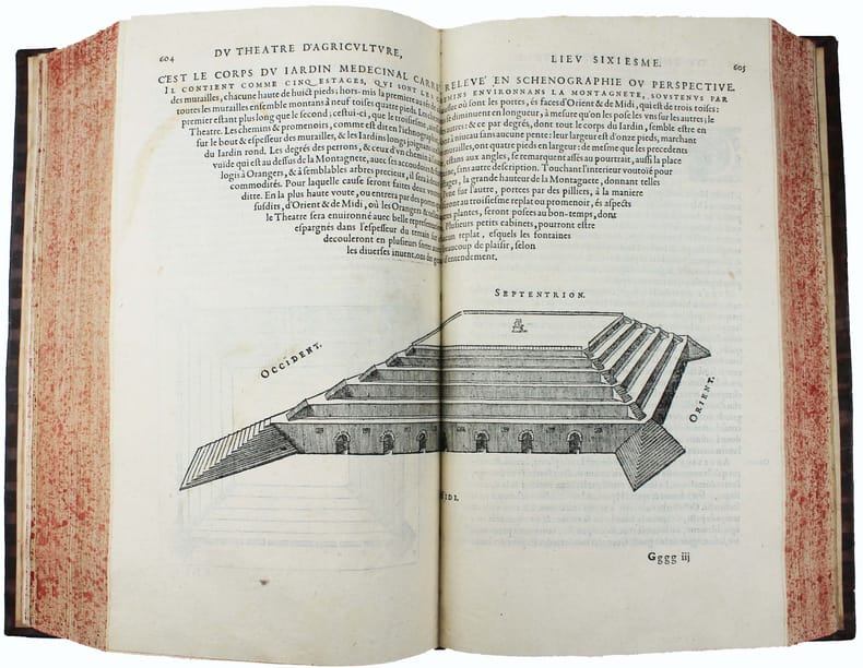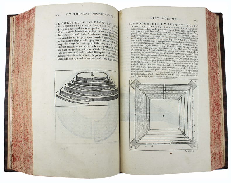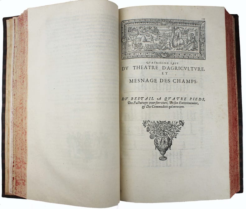 Première édition complète du premier grand traité français d’agronomie dédiée au roi Henri IV. Exemplaire relié en vélin doré du XVIIe siècle, au frontispice enluminé. Paris, Abr. Saugrain, 1603.In-4 de (16) pp. dont le frontispice gravé, 907 pp., (1) p.bl., (26), (2) pp.bl. Vélin doré à recouvrement, plats ornés d’un double encadrement de filets et motifs géométriques sur les plats avec fleurs-de-lys et fleurons aux angles, dos à nerfs, tranches dorées, feuillets blancs réglés reliés en tête et en fin de volume. Quelques restaurations au vélin. Reliure ancienne du milieu du XVIIe siècle. 246 x 178 mm.