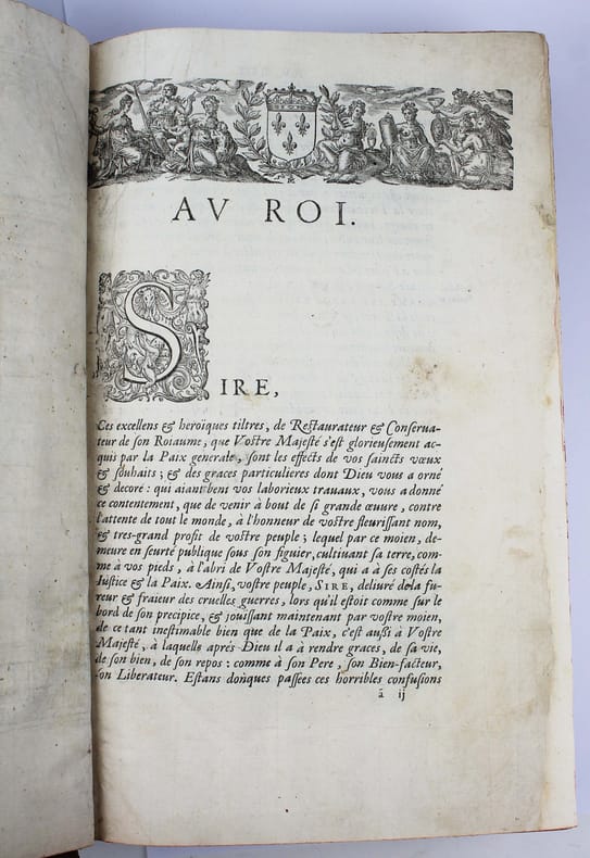 Précieux exemplaire relié en vélin ivoire vers 1660. Paris, Iamet Metayer 1600. Imprimeur ordinaire du Roi Henri IV. In-folio de (8) ff. dont 1 frontispice gravé, 1004 pp. et (10) ff. Plein vélin ivoire, dos à nerfs orné de fers proches de l’Atelier Pierre Rocolet-Antoine Padeloup, vers 1638-1662 selon Raphaël Esmérian. Exemplaire relié vers 1660.
